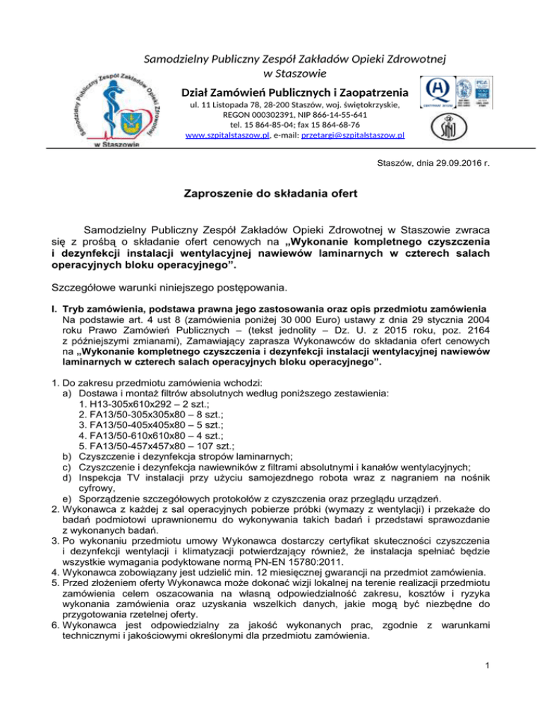 Samodzielny Publiczny Zespół Zakładów Opieki Zdrowotnej w Staszowie Dział Zamówień Publicznych i Zaopatrzenia ul. 11 Listopada 78, 28-200 Staszów, woj. świętokrzyskie, REGON 000302391, NIP 866-14-55-641 tel. 15 864-85-04; fax 15 864-68-76 www.szpitalstaszow.pl, e-mail: [email protected] Staszów, dnia 29.09.2016 r. Zaproszenie do składania ofert Samodzielny Publiczny Zespół Zakładów Opieki Zdrowotnej w Staszowie zwraca się z prośbą o składanie ofert cenowych na „Wykonanie kompletnego czyszczenia i dezynfekcji instalacji wentylacyjnej nawiewów laminarnych w czterech salach operacyjnych bloku operacyjnego”. Szczegółowe warunki niniejszego postępowania. I. Tryb zamówienia, podstawa prawna jego zastosowania oraz opis przedmiotu zamówienia Na podstawie art. 4 ust 8 (zamówienia poniŜej 30 000 Euro) ustawy z dnia 29 stycznia 2004 roku Prawo Zamówień Publicznych – (tekst jednolity – Dz. U. z 2015 roku, poz. 2164 z późniejszymi zmianami), Zamawiający zaprasza Wykonawców do składania ofert cenowych na „Wykonanie kompletnego czyszczenia i dezynfekcji instalacji wentylacyjnej nawiewów laminarnych w czterech salach operacyjnych bloku operacyjnego”. 1. Do zakresu przedmiotu zamówienia wchodzi: a) Dostawa i montaŜ filtrów absolutnych według poniŜszego zestawienia: 1. H13-305x610x292 – 2 szt.; 2. FA13/50-305x305x80 – 8 szt.; 3. FA13/50-405x405x80 – 5 szt.; 4. FA13/50-610x610x80 – 4 szt.; 5. FA13/50-457x457x80 – 107 szt.; b) Czyszczenie i dezynfekcja stropów laminarnych; c) Czyszczenie i dezynfekcja nawiewników z filtrami absolutnymi i kanałów wentylacyjnych; d) Inspekcja TV instalacji przy uŜyciu samojezdnego robota wraz z nagraniem na nośnik cyfrowy, e) Sporządzenie szczegółowych protokołów z czyszczenia oraz przeglądu urządzeń. 2. Wykonawca z kaŜdej z sal operacyjnych pobierze próbki (wymazy z wentylacji) i przekaŜe do badań podmiotowi uprawnionemu do wykonywania takich badań i przedstawi sprawozdanie z wykonanych badań. 3. Po wykonaniu przedmiotu umowy Wykonawca dostarczy certyfikat skuteczności czyszczenia i dezynfekcji wentylacji i klimatyzacji potwierdzający równieŜ, Ŝe instalacja spełniać będzie wszystkie wymagania podyktowane normą PN-EN 15780:2011. 4. Wykonawca zobowiązany jest udzielić min. 12 miesięcznej gwarancji na przedmiot zamówienia. 5. Przed złoŜeniem oferty Wykonawca moŜe dokonać wizji lokalnej na terenie realizacji przedmiotu zamówienia celem oszacowania na własną odpowiedzialność zakresu, kosztów i ryzyka wykonania zamówienia oraz uzyskania wszelkich danych, jakie mogą być niezbędne do przygotowania rzetelnej oferty. 6. Wykonawca jest odpowiedzialny za jakość wykonanych prac, zgodnie z warunkami technicznymi i jakościowymi określonymi dla przedmiotu zamówienia. 1 7. Wykonawca zobowiązuje się zrealizować przedmiot umowy zgodnie z opisem zawartym w niniejszym zaproszeniu do składania ofert, projekcie umowy, zasadami rzetelnej wiedzy technicznej i ustalonymi zwyczajami oraz zgodnie z obowiązującymi przepisami prawa w tym zakresie. 8. Wykonawca ponosi całkowitą odpowiedzialność za szkody powstałe, z przyczyn leŜących po jego stronie lub po stronie osób i podmiotów z nim współpracujących. Do momentu odbioru przedmiotu Umowy Wykonawca samodzielnie ponosi ryzyko swoich działań. Dotyczy to kradzieŜy dostarczonych przez niego lub dla niego materiałów, elementów oraz innych przedmiotów. II. Nazwa, adres i dane kontaktowe Zamawiającego Samodzielny Publiczny Zespół Zakładów Opieki Zdrowotnej w Staszowie ul. 11 Listopada 78, 28-200 Staszów tel. 15 864 85 04 fax. 15 864 68 76 e-mail: [email protected] III. Oferty częściowe Zamawiający nie dopuszcza moŜliwości składania ofert częściowych. IV. Oferty wariantowe Zamawiający nie dopuszcza moŜliwości składania ofert wariantowych. V. Wymagania dotyczące ofert Oferty naleŜy składać w sekretariacie SPZZOZ w Staszowie, ul. 11 Listopada 78, 28-200 Staszów w terminie do dnia 6.10.2016 roku do godziny 12:00, w kopertach z dopiskiem – ”Wykonanie kompletnego czyszczenia i dezynfekcji instalacji wentylacyjnej nawiewów laminarnych w czterech salach operacyjnych bloku operacyjnego”. Oferta winna zawierać następujące dokumenty: a) Aktualny odpis z właściwego rejestru albo z centralnej ewidencji i informacji o działalności gospodarczej, b) dokumenty potwierdzające posiadanie uprawnień / pełnomocnictw osób składających ofertę, o ile nie wynika to z przedstawionych dokumentów rejestrowych, c) Wypełniony i podpisany przez Wykonawcę załącznik numer 1 – formularz oferty. VI. Kryteria i ocena ofert Jedynym kryterium oceny ofert będzie cena oferty brutto (waga 100%). Zamawiający wybierze ofertę najtańszą z ofert złoŜonych. VII. Termin realizacji Termin wykonania przedmiotu zamówienia – do 3 tygodni od daty podpisania umowy. VIII. Warunki płatności Warunki płatności szczegółowo są przedstawione w projekcie umowy. IX. Umowa dotycząca zamówienia Podpisana przez Zamawiającego jednostronnie umowa zostanie przesłana do Wykonawcy, który po jej podpisaniu przez osoby właściwie umocowane odeśle 1 egzemplarz do Zamawiającego. Zamawiający zastrzega sobie moŜliwość zakończenia postępowania bez wyboru oferty. 2