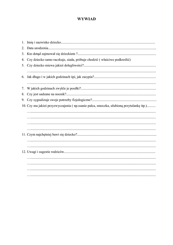 WYWIAD 1. Imię i nazwisko dziecko............................................................................................................ 2. Data urodzenia............................................................................................................................ 3. Kto dotąd zajmował się dzieckiem ?.......................................................................................... 4. Czy dziecko samo raczkuje, siada, próbuje chodzić ( właściwe podkreślić) 5. Czy dziecko miewa jakieś dolegliwości?................................................................................... …................................................................................................................................................ 6. Jak długo i w jakich godzinach śpi, jak zasypia?....................................................................... …................................................................................................................................................ 7. W jakich godzinach zwykle je posiłki?...................................................................................... 8. Czy jest sadzane na nocnik?....................................................................................................... 9. Czy sygnalizuje swoje potrzeby fizjologiczne?.......................................................................... 10. Czy ma jakieś przyzwyczajenia ( np.ssanie palca, smoczka, ulubioną przytulankę itp.).......... …................................................................................................................................................ …................................................................................................................................................ …................................................................................................................................................ …................................................................................................................................................ 11. Czym najchętniej bawi się dziecko?........................................................................................... …................................................................................................................................................ …................................................................................................................................................ 12. Uwagi i sugestie rodziców......................................................................................................... …................................................................................................................................................ …................................................................................................................................................ …................................................................................................................................................ …................................................................................................................................................