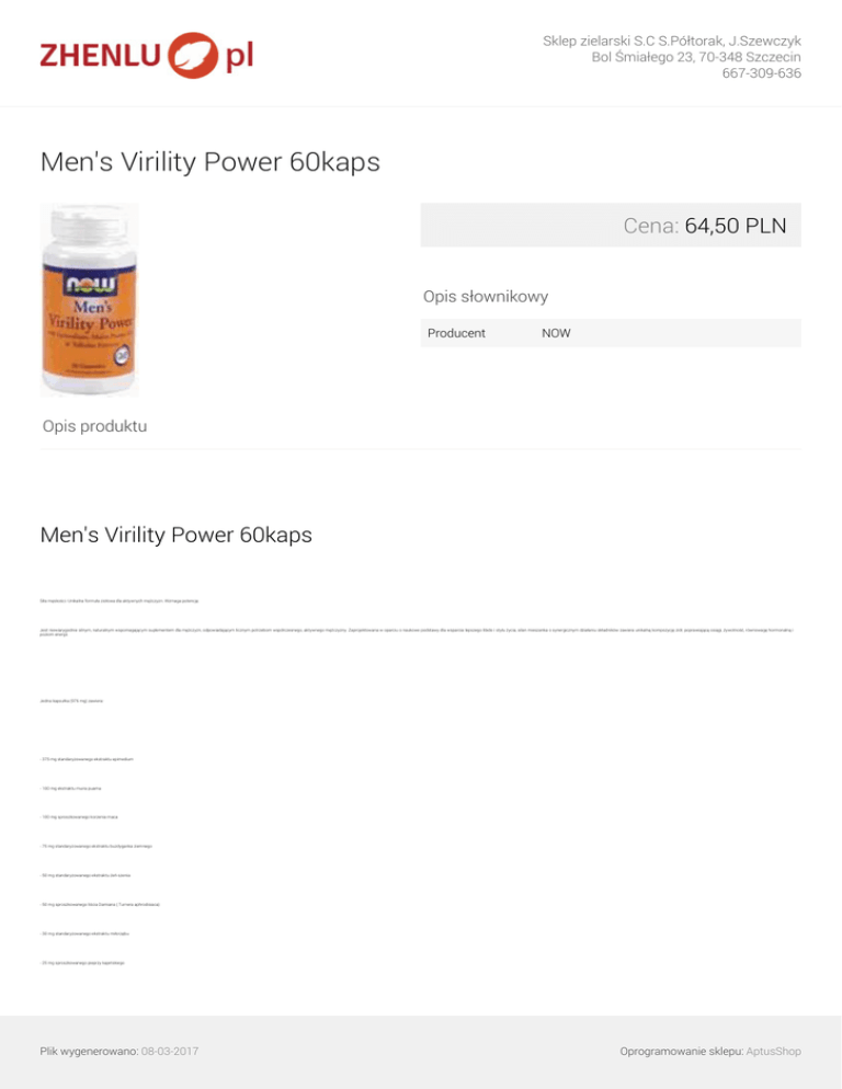 Sklep zielarski S.C S.Półtorak, J.Szewczyk Bol Śmiałego 23, 70-348 Szczecin 667-309-636 Men's Virility Power 60kaps Cena: 64,50 PLN Opis słownikowy Producent NOW Opis produktu Men's Virility Power 60kaps Siła męskości. Unikalna formuła ziołowa dla aktywnych mężczyzn. Wzmaga potencję. Jest niewiarygodnie silnym, naturalnym wspomagającym suplementem dla mężczyzn, odpowiadającym licznym potrzebom współczesnego, aktywnego mężczyzny. Zaprojektowana w oparciu o naukowe podstawy dla wsparcia lepszego libido i stylu życia, silan mieszanka o synergicznym działaniu składników zawiera unikalną kompozycję ziół, poprawiającą osiągi, żywotność, równowagę hormonalną i poziom energii. Jedna kapsułka (976 mg) zawiera: - 375 mg standaryzowanego ekstraktu epimedium - 100 mg ekstraktu muira puama - 100 mg sproszkowanego korzenia maca - 75 mg standaryzowanego ekstraktu buzdyganka ziemnego - 50 mg standaryzowanego ekstraktu żeń-szenia - 50 mg sproszkowanego liścia Damiana ( Turnera aphrodisiaca) - 30 mg standaryzowanego ekstraktu miłorzębu - 25 mg sproszkowanego pieprzy kajeńskiego Plik wygenerowano: 08-03-2017 Oprogramowanie sklepu: AptusShop Sklep zielarski S.C S.Półtorak, J.Szewczyk Bol Śmiałego 23, 70-348 Szczecin 667-309-636 Sposób użycia: Dorośli: 1 kapsułka dziennie z wodą 1-2 godziny przed snem Zawartość: 60 kapsułek Treści zawarte w opisie produktu nie są podawane w celach reklamowych, są wyłącznie przytoczeniem informacji i wiedzy pochodzącej z badań i doświadczeń stosowanych w wielu innych krajach. Preparat ten posiada status suplementu diety. Nie należy przekraczać zalecanej porcji do spożycia w ciągu dnia. Suplementy diety powinny być przechowywane w sposób niedostępny dla małych dzieci. Suplementy diety nie mogą być stosowane jako substytut (zamiennik) zróżnicowanej diety. Żadne oświadczenie, stwierdzenie, opinia lub informacja odnosząca się do któregokolwiek produktu nie stanowią i nie powinny być rozumiane jako porada medyczna. Plik wygenerowano: 08-03-2017 Powered by TCPDF (www.tcpdf.org) Oprogramowanie sklepu: AptusShop