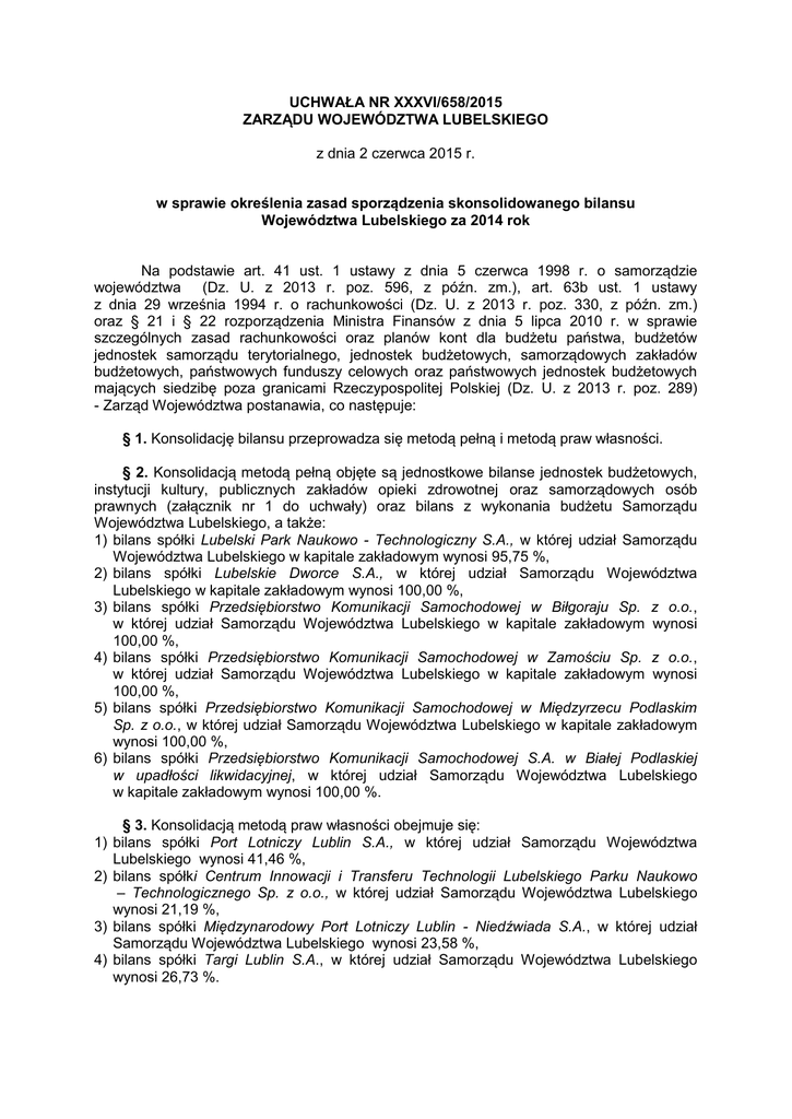 UCHWAŁA NR XXXVI/658/2015 ZARZĄDU WOJEWÓDZTWA LUBELSKIEGO z dnia 2 czerwca 2015 r. w sprawie określenia zasad sporządzenia skonsolidowanego bilansu Województwa Lubelskiego za 2014 rok Na podstawie art. 41 ust. 1 ustawy z dnia 5 czerwca 1998 r. o samorządzie województwa (Dz. U. z 2013 r. poz. 596, z późn. zm.), art. 63b ust. 1 ustawy z dnia 29 września 1994 r. o rachunkowości (Dz. U. z 2013 r. poz. 330, z późn. zm.) oraz § 21 i § 22 rozporządzenia Ministra Finansów z dnia 5 lipca 2010 r. w sprawie szczególnych zasad rachunkowości oraz planów kont dla budżetu państwa, budżetów jednostek samorządu terytorialnego, jednostek budżetowych, samorządowych zakładów budżetowych, państwowych funduszy celowych oraz państwowych jednostek budżetowych mających siedzibę poza granicami Rzeczypospolitej Polskiej (Dz. U. z 2013 r. poz. 289) - Zarząd Województwa postanawia, co następuje: § 1. Konsolidację bilansu przeprowadza się metodą pełną i metodą praw własności. § 2. Konsolidacją metodą pełną objęte są jednostkowe bilanse jednostek budżetowych, instytucji kultury, publicznych zakładów opieki zdrowotnej oraz samorządowych osób prawnych (załącznik nr 1 do uchwały) oraz bilans z wykonania budżetu Samorządu Województwa Lubelskiego, a także: 1) bilans spółki Lubelski Park Naukowo - Technologiczny S.A., w której udział Samorządu Województwa Lubelskiego w kapitale zakładowym wynosi 95,75 %, 2) bilans spółki Lubelskie Dworce S.A., w której udział Samorządu Województwa Lubelskiego w kapitale zakładowym wynosi 100,00 %, 3) bilans spółki Przedsiębiorstwo Komunikacji Samochodowej w Biłgoraju Sp. z o.o., w której udział Samorządu Województwa Lubelskiego w kapitale zakładowym wynosi 100,00 %, 4) bilans spółki Przedsiębiorstwo Komunikacji Samochodowej w Zamościu Sp. z o.o., w której udział Samorządu Województwa Lubelskiego w kapitale zakładowym wynosi 100,00 %, 5) bilans spółki Przedsiębiorstwo Komunikacji Samochodowej w Międzyrzecu Podlaskim Sp. z o.o., w której udział Samorządu Województwa Lubelskiego w kapitale zakładowym wynosi 100,00 %, 6) bilans spółki Przedsiębiorstwo Komunikacji Samochodowej S.A. w Białej Podlaskiej w upadłości likwidacyjnej, w której udział Samorządu Województwa Lubelskiego w kapitale zakładowym wynosi 100,00 %. § 3. Konsolidacją metodą praw własności obejmuje się: 1) bilans spółki Port Lotniczy Lublin S.A., w której udział Samorządu Województwa Lubelskiego wynosi 41,46 %, 2) bilans spółki Centrum Innowacji i Transferu Technologii Lubelskiego Parku Naukowo – Technologicznego Sp. z o.o., w której udział Samorządu Województwa Lubelskiego wynosi 21,19 %, 3) bilans spółki Międzynarodowy Port Lotniczy Lublin - Niedźwiada S.A., w której udział Samorządu Województwa Lubelskiego wynosi 23,58 %, 4) bilans spółki Targi Lublin S.A., w której udział Samorządu Województwa Lubelskiego wynosi 26,73 %. § 4. Konsolidacją nie obejmuje się bilansów: 1) spółki Lubelski Rynek Hurtowy S.A., w której udział Samorządu Województwa Lubelskiego wynosi 1,02 % oraz 2) spółki Przewozy Regionalne Sp. z o.o., w której udział Samorządu Województwa Lubelskiego wynosi 5,50 %, z uwagi na znikomy wpływ Samorządu Województwa Lubelskiego na ich politykę finansową i operacyjną, w tym również dotyczącą podziału lub pokrycia wyniku finansowego tych spółek, a których dane finansowe są nieistotne dla realizacji obowiązku rzetelnego i jasnego przedstawienia sytuacji majątkowej i finansowej oraz wyniku finansowego jednostki dominującej. § 5. Poszczególne aktywa i pasywa bilansów jednostkowych dostosowuje się odpowiednio do aktywów i pasywów wzoru skonsolidowanego bilansu jednostki. § 6. Wzór bilansu skonsolidowanego określony w załączniku nr 10 do rozporządzenia Ministra Finansów z 5 lipca 2010 r. w sprawie szczególnych zasad rachunkowości oraz planów kont dla budżetu państwa, budżetów jednostek samorządu terytorialnego, jednostek budżetowych, samorządowych zakładów budżetowych, państwowych funduszy celowych oraz państwowych jednostek budżetowych mających siedzibę poza granicami Rzeczpospolitej Polskiej (Dz. U. z 2013 r. poz. 289), zostaje poszerzony przez dodanie pozycji w aktywach trwałych bilansu „Udziały w jednostkach podporządkowanych wycenione metodą praw własności” grupa A, pozycja IV, wiersz 1.4. § 7. Tworzy się bilans jednostki dominującej przez połączenie pozycji bilansu z wykonania budżetu Samorządu Województwa Lubelskiego oraz bilansu jednostki budżetowej Urzędu Marszałkowskiego Województwa Lubelskiego w Lublinie, który stanowi podstawę do połączenia bilansów jednostek zależnych i współzależnych oraz zastosowania koniecznych wyłączeń i korekt. § 8. Konsolidację bilansu przeprowadza się dokonując odpowiednich wyłączeń i korekt w zakresie: 1) wzajemnych należności i zobowiązań, 2) zysków i strat powstałych w wyniku operacji gospodarczych między jednostkami objętymi konsolidacją, 3) mienia Samorządu Województwa Lubelskiego wykazanego w bilansie jednostki dominującej oraz bilansach jednostek zależnych. §9. Konsolidację bilansu przeprowadza Departament Marszałkowskiego Województwa Lubelskiego w Lublinie. Finansów Urzędu § 10. Wykonanie uchwały powierza się Marszałkowi Województwa Lubelskiego. § 11. Uchwała wchodzi w życie z dniem podjęcia, z terminem jej realizacji do dnia 30 czerwca 2015 roku. Wicemarszałek Marszałek Województwa /-/Krzysztof Grabczuk /-/Sławomir Sosnowski Uchwała Nr XXXVI/658/2015 Zarządu Województwa Lubelskiego z dnia 2 czerwca 2015 r. Strona 2 z 2