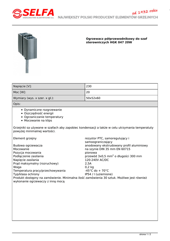 Ogrzewacz półprzewodnikowy do szaf sterowniczych HGK 047 20W