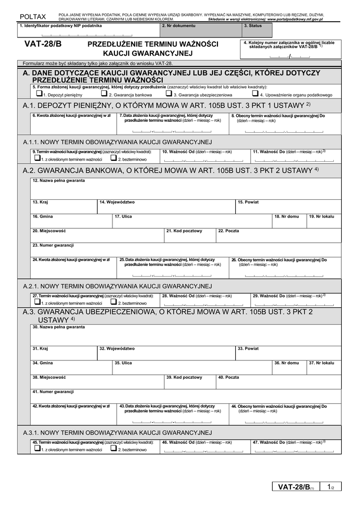 POLTAX POLA JASNE WYPEŁNIA PODATNIK, POLA CIEMNE WYPEŁNIA URZĄD SKARBOWY. WYPEŁNIAĆ NA MASZYNIE, KOMPUTEROWO LUB RĘCZNIE, DUŻYMI, DRUKOWANYMI LITERAMI, CZARNYM LUB NIEBIESKIM KOLOREM. Składanie w wersji elektronicznej: www.portalpodatkowy.mf.gov.pl 1. Identyfikator podatkowy NIP podatnika 2. Nr dokumentu 3. Status └────┴────┴────┴────┴────┴────┴────┴────┴────┴────┘ VAT-28/B 4. Kolejny numer załącznika w ogólnej liczbie składanych załączników VAT-28/B 1) PRZEDŁUŻENIE TERMINU WAŻNOŚCI KAUCJI GWARANCYJNEJ / └────┴────┘ └────┴────┘ Formularz może być składany tylko jako załącznik do wniosku VAT-28. A. DANE DOTYCZĄCE KAUCJI GWARANCYJNEJ LUB JEJ CZĘŚCI, KTÓREJ DOTYCZY PRZEDŁUŻENIE TERMINU WAŻNOŚCI 5. Forma złożonej kaucji gwarancyjnej, której dotyczy przedłużenie (zaznaczyć właściwy kwadrat lub właściwe kwadraty): 1. Depozyt pieniężny 2. Gwarancja bankowa 3. Gwarancja ubezpieczeniowa 4. Upoważnienie organu podatkowego A.1. DEPOZYT PIENIĘŻNY, O KTÓRYM MOWA W ART. 105B UST. 3 PKT 1 USTAWY 2) 6. Kwota złożonej kaucji gwarancyjnej w zł 7. Data złożenia kaucji gwarancyjnej, której dotyczy przedłużenie terminu ważności (dzień – miesiąc – rok) 8. Obecny termin ważności kaucji gwarancyjnej Do (dzień – miesiąc – rok) └────┴────┘-└────┴────┘-└────┴────┴────┴────┘ └────┴────┘-└────┴────┘-└────┴────┴────┴────┘ A.1.1. NOWY TERMIN OBOWIĄZYWANIA KAUCJI GWARANCYJNEJ 9. Termin ważności kaucji gwarancyjnej (zaznaczyć właściwy kwadrat): 1. z określonym terminem ważności 2. bezterminowo 11. Ważność Do (dzień – miesiąc – rok) 3) 10. Ważność Od (dzień – miesiąc – rok) └────┴────┘-└────┴────┘-└────┴────┴────┴────┘ └────┴────┘-└────┴────┘-└────┴────┴────┴────┘ A.2. GWARANCJA BANKOWA, O KTÓREJ MOWA W ART. 105B UST. 3 PKT 2 USTAWY 4) 12. Nazwa pełna gwaranta 13. Kraj 14. Województwo 16. Gmina 15. Powiat 17. Ulica 20. Miejscowość 18. Nr domu 21. Kod pocztowy 19. Nr lokalu 22. Poczta 23. Numer gwarancji 24. Kwota złożonej kaucji gwarancyjnej w zł 25. Data złożenia kaucji gwarancyjnej, której dotyczy przedłużenie terminu ważności (dzień – miesiąc – rok) 26. Obecny termin ważności kaucji gwarancyjnej Do (dzień – miesiąc – rok) └────┴────┘-└────┴────┘-└────┴────┴────┴────┘ └────┴────┘-└────┴────┘-└────┴────┴────┴────┘ A.2.1. NOWY TERMIN OBOWIĄZYWANIA KAUCJI GWARANCYJNEJ 27. Termin ważności kaucji gwarancyjnej (zaznaczyć właściwy kwadrat): 1. z określonym terminem ważności 2. bezterminowo 29. Ważność Do (dzień – miesiąc – rok) 3) 28. Ważność Od (dzień – miesiąc – rok) └────┴────┘-└────┴────┘-└────┴────┴────┴────┘ └────┴────┘-└────┴────┘-└────┴────┴────┴────┘ A.3. GWARANCJA UBEZPIECZENIOWA, O KTÓREJ MOWA W ART. 105B UST. 3 PKT 2 USTAWY 4) 30. Nazwa pełna gwaranta 31. Kraj 32. Województwo 34. Gmina 33. Powiat 35. Ulica 38. Miejscowość 36. Nr domu 39. Kod pocztowy 37. Nr lokalu 40. Poczta 41. Numer gwarancji 42. Kwota złożonej kaucji gwarancyjnej w zł 43. Data złożenia kaucji gwarancyjnej, której dotyczy przedłużenie terminu ważności (dzień – miesiąc – rok) 44. Obecny termin ważności kaucji gwarancyjnej Do (dzień – miesiąc – rok) └────┴────┘-└────┴────┘-└────┴────┴────┴────┘ └────┴────┘-└────┴────┘-└────┴────┴────┴────┘ A.3.1. NOWY TERMIN OBOWIĄZYWANIA KAUCJI GWARANCYJNEJ 45. Termin ważności kaucji gwarancyjnej (zaznaczyć właściwy kwadrat): 1. z określonym terminem ważności 2. bezterminowo 46. Ważność Od (dzień – miesiąc – rok) └────┴────┘-└────┴────┘-└────┴────┴────┴────┘ 47. Ważność Do (dzień – miesiąc – rok) 3) └────┴────┘-└────┴────┘-└────┴────┴────┴────┘ VAT-28/B(1) 1/2 POLTAX POLA JASNE WYPEŁNIA PODATNIK, POLA CIEMNE WYPEŁNIA URZĄD SKARBOWY. WYPEŁNIAĆ NA MASZYNIE, KOMPUTEROWO LUB RĘCZNIE, DUŻYMI, DRUKOWANYMI LITERAMI, CZARNYM LUB NIEBIESKIM KOLOREM. Składanie w wersji elektronicznej: www.portalpodatkowy.mf.gov.pl A.4. UPOWAŻNIENIE ORGANU PODATKOWEGO, O KTÓRYM MOWA W ART. 105B UST. 3 PKT 3 USTAWY 5) 48. Nazwa pełna banku (oddziału) lub spółdzielczej kasy oszczędnościowo-kredytowej, w którym lub w której prowadzony jest rachunek 49. Numer rachunku 50. Kraj 51. Województwo 53. Gmina 52. Powiat 54. Ulica 55. Nr domu 57. Miejscowość 58. Kod pocztowy 56. Nr lokalu 59. Poczta 60. Numer upoważnienia 61. Kwota złożonej kaucji gwarancyjnej w zł 62. Data złożenia kaucji gwarancyjnej, której dotyczy przedłużenie terminu ważności (dzień – miesiąc – rok) 63. Obecny termin ważności kaucji gwarancyjnej Do (dzień – miesiąc – rok) └────┴────┘-└────┴────┘-└────┴────┴────┴────┘ └────┴────┘-└────┴────┘-└