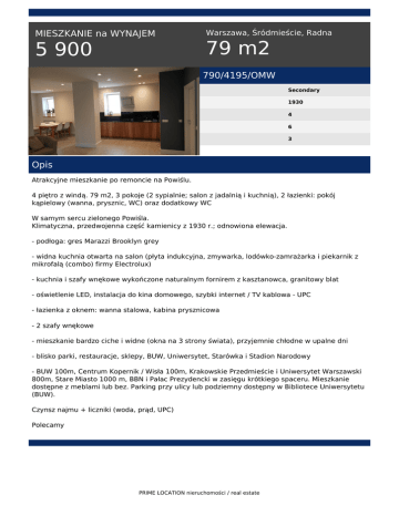 MIESZKANIE na WYNAJEM 5 900 Warszawa, Śródmieście, Radna 79 m2 790/4195/OMW Secondary 1930 4 6 3 Opis Atrakcyjne mieszkanie po remoncie na Powiślu. 4 piętro z windą. 79 m2, 3 pokoje (2 sypialnie; salon z jadalnią i kuchnią), 2 łazienki: pokój kąpielowy (wanna, prysznic, WC) oraz dodatkowy WC W samym sercu zielonego Powiśla. Klimatyczna, przedwojenna część kamienicy z 1930 r.; odnowiona elewacja. - podłoga: gres Marazzi Brooklyn grey - widna kuchnia otwarta na salon (płyta indukcyjna, zmywarka, lodówko-zamrażarka i piekarnik z mikrofalą (combo) firmy Electrolux) - kuchnia i szafy wnękowe wykończone naturalnym fornirem z kasztanowca, granitowy blat - oświetlenie LED, instalacja do kina domowego, szybki internet / TV kablowa - UPC - łazienka z oknem: wanna stalowa, kabina prysznicowa - 2 szafy wnękowe - mieszkanie bardzo ciche i widne (okna na 3 strony świata), przyjemnie chłodne w upalne dni - blisko parki, restauracje, sklepy, BUW, Uniwersytet, Starówka i Stadion Narodowy - BUW 100m, Centrum Kopernik / Wisła 100m, Krakowskie Przedmieście i Uniwersytet Warszawski 800m, Stare Miasto 1000 m, BBN i Pałac Prezydencki w zasięgu krótkiego spaceru. Mieszkanie dostępne z meblami lub bez. Parking przy ulicy lub podziemny dostępny w Bibliotece Uniwersytetu (BUW). Czynsz najmu + liczniki (woda, prąd, UPC) Polecamy PRIME LOCATION nieruchomości / real estate Katarzyna Friedel-Udarov tel. +48 604 424 605; +4822 389 75 77 tel. +48 604 424 605 email: [email protected] PRIME LOCATION nieruchomości / real estate Powered by TCPDF (www.tcpdf.org)