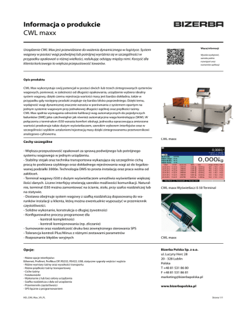Informacja o produkcie CWL maxx Więcej informacji Urządzenie CWL Max jest przewidziane do ważenia dynamicznego w logistyce. System wagowy w postaci wagi podwójnej lub potrójnej wyróżnia się w szczególności w przypadku opakowań o różnej wielkości, redukując odstępy między nimi. Korzyść dla klienta końcowego to większa przepustowość towarów. Wysoka wydajność, szeroka paleta rozwiązań oraz wariantów aplikacji Opis produktu CWL Max wykorzystuje swój potencjał w postaci dwóch lub trzech zintegrowanych systemów wagowych, ponieważ, w zależności od długości opakowania, urządzenie wybiera idealny system wagowy, dzięki czemu rejestracja wartości masy jest bardzo dokładna, także w przypadku gdy następny produkt znajduje się bardzo blisko poprzedniego. Dzięki temu, wydajność wagi dynamicznej znacznie wzrasta w porównaniu z systemem opartym na jednym systemie wagowym przy jednakowej długości ogólnej oraz prędkości taśmy. CWL Max spełnia wymagania odnośnie kalibracji wag automatycznych do pojedynczych ładunków (SWE) jako catchweigher jak również automatyczna waga kontrolująca (SKW). W połączeniu z terminalem iS50 wzrasta komfort obsługi, jednostka opracowująca zmierzone wartości przekonuje także dużym wyświetlaczem, szerokim wyborem interfejsów oraz w szczególności szybkim ustalaniem/rejestracją masy dzięki zintegrowanemu przetwornikowi analogowo-cyfrowemu. Cechy szczególne - Większa przepustowość opakowań za sprawą podwójnego lub potrójnego systemu wagowego w jednym urządzeniu. - Stabilny stojak oraz technika transportowa wykazująca się szczególnie cichą pracą to podstawa szybkiego oraz dokładnego rejestrowania wagi aż do legalizowanej podziałki 3000e. Technologia DMS to prosta instalację oraz praca wolna od zakłóceń. - Terminal wagowy iS50 z dużym wyświetlaczem umożliwia wyświetlanie większej ilości danych. Liczne interfejsy otwierają szerokie możliwości komunikacji. Naturalnie, terminal iS50 można zamontować na ścianie, stole, przy szafce rozdzielczej lub na statywie. - Dostawa obejmuje system wagowy z szafką rozdzielczą dopasowaną do warunków instalacji u klienta, którą można ewentualnie wyposażyć w przemiennik częstotliwości. - Solidne wykonanie, konstrukcja o długiej żywotności - Konfigurowalne procesy programowe dla - kontroli kompletności - kontroli komisjonowania (np. zliczanie) - Sumowanie oraz rozdzielczość druku bez zewnętrznego sterowania SPS - Tolerancja kontroli Plus/Minus z różnymi zestawami parametrów - Rozpoznanie błędów seryjnych Opcje: - Różne opcje interfejsów: Ethernet, Profinet, Profibus DP, RS232, RS422, USB, statyczne sygnały wejścia i wyjścia - Różne wymiary taśmy oraz wysokości transportu - Różne prędkości taśmy transportowej - Ciche taśmy - Fotokomórki - Wykonanie z lub bez osłony urządzenia - Szafka rozdzielcza z dala od urządzenia - Przemiennik częstotliwości - SPS łącznie z programowaniem HD_CWL Max_V9_PL CWE maxx 1500 CWL maxx CWL maxx Wyświetlacz iS 50 Terminal CWL maxx Bizerba Polska Sp. z o.o. ul. Lucyny Herc 28 20 - 328 Lublin Polska T +48 81 531 86 80 F +48 81 531 86 81 [email protected] www.bizerbapolska.pl Strona 1/1