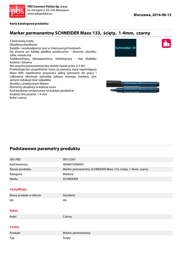 PBS Connect Polska Sp. z o.o. ul. Annopol 3, 03-236 Warszawa www.pbspolska.eu Warszawa, 2016-06-15 Karta katalogowa produktu: Marker permanentny SCHNEIDER Maxx 133, ścięty, 1-4mm, czarny Z końcówką ściętą Obudowa plastikowa Światło- i wodoodporny tusz w intensywnych kolorach Do pisania po każdej gładkiej powierzchni - drewnie, plastiku, szkle, metalu itd. Szybkoschnący, bezzapachowy, nietoksyczny - bez dodatku ksylenu i toluenu Nie zasycha pozostawiony bez skuwki nawet przez 2-3 dni Proekologiczne uzupełnienie tuszu za pomocą stacji napełniającej Maxx 640: napełnienie przywraca pełną gotowość do pracy i całkowicie eliminuje potrzebę zakupu nowego markera, tym samym redukuje ilość odpadów Skuwka z praktycznym klipem Elementy obudowy w kolorze tuszu Kod kreskowy umieszczony na każdym produkcie Grubość linii pisania: 1-4 mm Kolor: czarny Podstawowe parametry produktu SKU PBS SR113301 Kod kreskowy 4004675006493 Nazwa produktu Marker permanentny SCHNEIDER Maxx 133, ścięty, 1-4mm, czarny Kategoria Markery Marka SCHNEIDER Certyfikaty Nowy produkt w ofercie Standard Hit Hit Kolor Kolor Czarny Cecha Produkt Marker permenentny Typ Ścięty PBS Connect Polska Sp. z o.o. ul. Annopol 3, 03-236 Warszawa www.pbspolska.eu Warszawa, 2016-06-15 Karta katalogowa produktu cd. Marker permanentny SCHNEIDER Maxx 133, ścięty, 1-4mm, czarny Podstawowe parametry produktu Rodzaj Do 72h bez skówki W ofercie od 2015-01 Wymiary Grubość linii (mm) 1-4 Końcówka (mm) 1-4 Wspólny słownik zamówień CPV 30192125-3 Pisaki Jednostki logistyczne Opakowanie 1 10 szt Opakowanie 2 400 szt Opakowanie 3 22400 szt