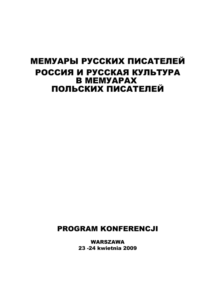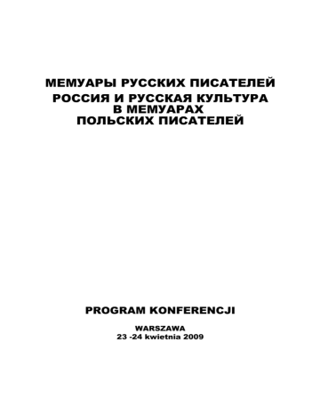 МЕМУАРЫ РУССКИХ ПИСАТЕЛЕЙ РОССИЯ И РУССКАЯ КУЛЬТУРА В МЕМУАРАХ ПОЛЬСКИХ ПИСАТЕЛЕЙ PROGRAM KONFERENCJI WARSZAWA 23 -24 kwietnia 2009 2 23 kwietnia 2009 Uniwersytet Warszawski Pałac Kazimierzowski, sala Senatu ul. Krakowskie Przedmieście 26/28 godz. 1000 OTWARCIE KONFERENCJI godz.1100 – 1800 OBRADY PLENARNE Obrady przedpołudniowe do godz.1400 z przerwą na kawę godz. 1130-1200 Przerwa obiadowa godz.1400-1500 Biblioteka Uniwersytecka, ul. Dobra 56/66, sala 256 Obrady popołudniowe godz.1500-1800 24 kwietnia 2009 Instytut Rusycystyki UW ul. Szturmowa 4 godz. 900-1800 OBRADY W SEKCJACH: SEKCJA I sala 306 SEKCJA II sala.312 SEKCJA III sala 206 Sesje przedpołudniowe godz. 900-1300 z przerwą na kawę godz. 1030–1100 Przerwa obiadowa godz.1300-1400 Sesje popołudniowe godz. 1400-1800 z przerwą na kawę godz. 1530–1600 godz. 1800 OBRADY PLENARNE Podsumowanie prac Konferencji Spotkanie pożegnalne 3 KOMUNIKATY ORGANIZACYJNE Rejestracja uczestników Konferencji: od godz. 900 Pałac Kazimierzowski, sala Senatu, ul. Krakowskie Przedmieście 26/28 Czas wystąpienia na obradach plenarnych i w sekcjach nie może przekraczać 15 minut; organizatorzy proszą usilnie o przestrzeganie tego rygoru Materiały składane do druku w wydawnictwie pokon-ferencyjnym prosimy ograniczyć do 0,5 arkusza autorskiego. Przewidujemy publikowanie ich w ramach serii wydawniczej Instytutu Rusycystyki UW Studia Rossica * 4 23 kwietnia 2009 Uniwersytet Warszawski ul. Krakowskie Przedmieście 26/28 Pałac Kazimierzowski, sala Senatu OTWARCIE KONFERENCJI Przewodniczy prof. dr hab. Alicja Wołodźko-Butkiewicz Przewidziane są wystąpienia: Prorektora Uniwersytetu Warszawskiego prof. dr hab. Włodzimierza Lengauera Dziekana Wydziału Lingwistyki Stosowanej prof. dr hab. Sambora Gruczy Dyrektora Instytutu Rusycystyki UW prof.dr.hab Alicji Wołodźko-Butkiewicz Dyrektora Rosyjskiego Ośrodka Nauki i Kultury w Warszawie Siergieja Skaczko Udział zapowiedział JE Ambasador Federacji Rosyjskiej Pan Władimir Grinin OBRADY PLENARNE Uniwersytet Warszawski Pałac Kazimierzowski, sala Senatu Sesja przedpołudniowa Przewodniczy prof. dr hab. Alicja Wołodźko-Butkiewicz Referaty: Фёдор Фёдоров (Daugavpils) Мемуары как проблема 5 Ольга Ковачичова (Братислава) Генологические аспекты мемуаров Натан Тамарченко (Москва) Структура «я» в устных мемуарах (Беседы В.Д. Дувакина с М.М. Бахтиным) Ludmiła Łucewicz (Warszawa) Эго мемуарного текста ***** Przewodniczy: prof. dr hab. Владимир Кантор Referaty: Самуил Шварцбанд (Иерусалим) Н.В.Гоголь: реальная и литературная биография Agnes Dukkon (Budapest) На перекрестке жанров: атрибуты исповеди и дневника в эпистолярности Белинского Antoni Semczuk (Warszawa) Ze wspomnień literackich Iwana Turgieniewa Александр Федута (Минск) Приватная жизнь профессора Сенковского (Барон Брамбеус в воспоминаниях и письмах современниц) ***** Sesja popołudniowa obrad plenarnych Biblioteka Uniwersytecka, ul. Dobra 56/66, sala 256 Przewodniczy prof. dr hab. Ludmiła Łucewicz Referaty: Barbara Olaszek (Łódź) Польские сюжеты в Воспоминаниях. За полвека Петра Боборыкина Дина Магомедова (Москва) Легенды об Александре Блоке 1920-1930-х гг. Ирина Белобровцева (Таллинн) Дневниковые записи и Записки писателя Юрия Слезкина (1885-1947) 6 Piotr Fast (Częstochowa) Pisarze rosyjscy we wspomnieniach Aleksandra Wata ***** Przewodniczy: prof. dr hab. Maria Cymborska-Leboda Referaty: Нора Букс (Париж) Петр Потемкин – «маленький мэтр Серебряного века”. Реконструкция образа из мемуарных свидетельств Alicja Wołodźko-Butkiewicz (Warszawa) Соблазны мемуариста ( О воспоминаниях Наума Коржавина) Walenty Piłat (Olsztyn) Esej, opowieść , biografia czy opowiadanie. "Mała dziewczynka z Metropolu" Ludmiły Pietruszewskiej Татьяна Колядич (Москва) Воспоминания писателей в переходный период ***** 24 kwietnia 2009 OBRADY W SEKCJACH Instytut Rusycystyki UW ul. Szturmowa 4 SEKCJA I s. 306 Sesja przedpołudniowa Przewodniczy: prof. dr hab. Фёдор Фёдоров Referaty: Георгий Прохоров (Коломна) 7 Документальность и художественность как потенциальные грани мемуарных произведений (А.Т. Болотов — Ф.М. Достоевский — Б. А. Пильняк) Любовь Cапченко (Ульяновск) Н.М. Карамзин в зеркале мемуаристики (из архивных разысканий) Magdalena Dąbrowska (Warszawa) Brygadiera wojsk polskich podróż w głąb Rosji. O Dzienniku... Józefa Kopcia Łucja Skotnicka (Wrocław) Автобиографическая позиция повествователя в Воспоминаниях Владимира Соллогуба ***** Przewodniczy: prof. dr hab. Самуил Шварцбанд Светлана Павлова (Саратов) Авторское видение России в мемуарах Ж. де Сталь Десять лет в изгнании Анна Станкевич (Даугавпилс) Об одной модели романтического сознания (Мемуары 