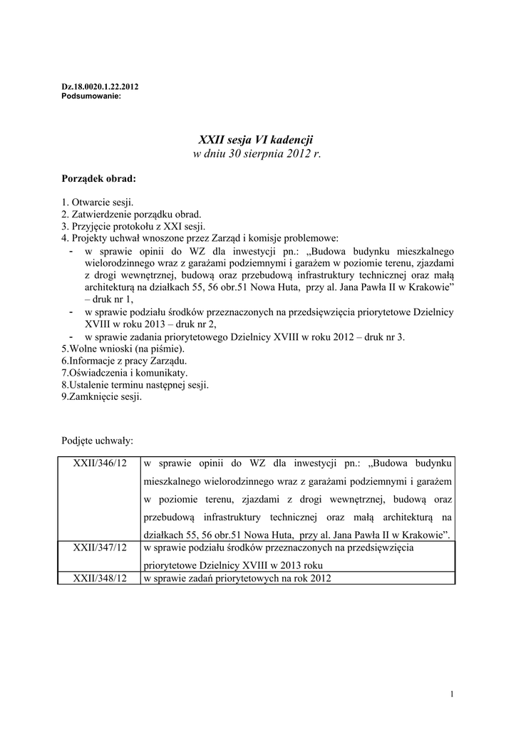 Dz.18.0020.1.22.2012 Podsumowanie: XXII sesja VI kadencji w dniu 30 sierpnia 2012 r. Porządek obrad: 1. Otwarcie sesji. 2. Zatwierdzenie porządku obrad. 3. Przyjęcie protokołu z XXI sesji. 4. Projekty uchwał wnoszone przez Zarząd i komisje problemowe: - w sprawie opinii do WZ dla inwestycji pn.: „Budowa budynku mieszkalnego wielorodzinnego wraz z garażami podziemnymi i garażem w poziomie terenu, zjazdami z drogi wewnętrznej, budową oraz przebudową infrastruktury technicznej oraz małą architekturą na działkach 55, 56 obr.51 Nowa Huta, przy al. Jana Pawła II w Krakowie” – druk nr 1, - w sprawie podziału środków przeznaczonych na przedsięwzięcia priorytetowe Dzielnicy XVIII w roku 2013 – druk nr 2, - w sprawie zadania priorytetowego Dzielnicy XVIII w roku 2012 – druk nr 3. 5.Wolne wnioski (na piśmie). 6.Informacje z pracy Zarządu. 7.Oświadczenia i komunikaty. 8.Ustalenie terminu następnej sesji. 9.Zamknięcie sesji. Podjęte uchwały: XXII/346/12 w sprawie opinii do WZ dla inwestycji pn.: „Budowa budynku mieszkalnego wielorodzinnego wraz z garażami podziemnymi i garażem w poziomie terenu, zjazdami z drogi wewnętrznej, budową oraz przebudową infrastruktury technicznej oraz małą architekturą na XXII/347/12 działkach 55, 56 obr.51 Nowa Huta, przy al. Jana Pawła II w Krakowie”. w sprawie podziału środków przeznaczonych na przedsięwzięcia XXII/348/12 priorytetowe Dzielnicy XVIII w 2013 roku w sprawie zadań priorytetowych na rok 2012 1 Dz.18.0020.1.22.2012 PROTOKÓŁ XXII SESJI RADY DZIELNICY XVIII Nowa Huta XXII sesja Rady Dzielnicy XVIII Nowa Huta odbyła się 30 sierpnia 2012 r. w siedzibie Dzielnicy XVIII os. Centrum B 6. W załączeniu: 1) Lista obecności radnych– zał. nr 1. 2) Wnioski o wprowadzenie projektów uchwał pod obrady – zał. nr: 2, 3. 3) Oryginały uchwał - zał. nr 4. 4) Wniosek radnej Miłosławy Ciężak – zał. nr 5, 5) WIZJA NOWEJ HUTY – zał. nr 6. _________________________________ XXII sesję Rady Dzielnicy XVIII Nowa Huta otworzył o godz. 18.00 Przewodniczący Rady i Zarządu Dzielnicy XVIII, Pan Stanisław Moryc, który serdecznie przywitał obecnych na sali i stwierdził quorum. W sesji uczestniczył Pan Edward E. Nowak. 2. Zatwierdzenie porządku obrad. Przewodniczący przystąpił do zatwierdzenia porządku obrad. Projekt porządku został doręczony do skrytek wraz z zaproszeniem na sesję. Projekt porządku obrad obejmował: 1. Otwarcie sesji. 2. Zatwierdzenie porządku obrad. 3. Przyjęcie protokołu z XXI sesji. 4. Projekty uchwał wnoszone przez Zarząd i komisje problemowe: - w sprawie opinii do WZ dla inwestycji pn.: „Budowa budynku mieszkalnego wielorodzinnego wraz z garażami podziemnymi i garażem w poziomie terenu, zjazdami z drogi wewnętrznej, budową, oraz przebudową Infrastruktury technicznej oraz małą architekturą na działkach 55, 56 obr. 51 Nowa Huta, przy al. Jana Pawła II w Krakowie” – druk nr 1. 5.Wolne wnioski (na piśmie). 6.Informacje z pracy Zarządu. 7.Oświadczenia i komunikaty. 8.Ustalenie terminu następnej sesji. 9.Zamknięcie sesji. Prowadzący obrady Stanisław Moryc poinformował, że wpłynęły 2 wnioski o włączenie pod obrady projektów uchwał: w sprawie podziału środków przeznaczonych na przedsięwzięcia priorytetowe Dzielnicy XVIII w 2013 roku (zał. nr 2) Wszyscy radni otrzymali do skrytek kserokopię projektu uchwały – Druk nr 2 - 2 Prowadzący wniósł o wprowadzenie w/w projektu do porządku obrad. Wyniki głosowania: Głosowało: 16 radnych Za głosowało – 16 radnych - w sprawie przeniesienia środków w ramach zadania priorytetowego Dzielnicy XVIII w roku 2012 (zał. nr 3) Wszyscy radni otrzymali kserokopię projektu uchwały – Druk nr 3 Prowadzący wniósł o wprowadzenie w/w projektu do porządku obrad. Wyniki głosowania: Głosowało: 15 radnych Za głosowało – 15 radnych Przewodniczący zarządził reasumpcję głosowania – wprowadzenie Druku nr 2. Wyniki głosowania: Głosowało: 17 radnych Za głosowało – 16 radnych Przeciw - 0 Wstrzymał się - 1 radny Przewodniczący zarządził reasumpcję głosowania – wprowadzenie Druku nr 3. Wyniki głosowania: Głosowało: 16 radnych Za głosowało – 15 radnych Przeciw - 0 Wstrzymał się - 1 radny Prowadzący poddał pod głosowanie przyjęcie porządku obrad z w/w zmianami. Wyniki głosowania: Głosowało: 16 radnych Za głosowało – 15 radnych Przeciw - 0 Wstrzymał się - 1 radny Porządek obrad XXII sesji został przyjęty. 3. Przyjęcie protokołu z XXI sesji. Przewodniczący Stanisław Moryc poinformował radnych, że protokół z XXI sesji Rady Dzielnicy XVIII był do wglądu w Biurze Rady – nikt nie wniósł zastrzeżeń i uwag. Przewodniczący stwierdził, że protokół z XXI sesji został przyjęty. 4. Projekty uchwał wnoszone przez Zarząd i komisje problemowe: Przystąpiono do procedowania uchwał. Prowadzący obrady Stanisław Moryc przedstawił projekty uchwał przygotowane przez Zarząd Dzielnicy XVIII Nowa Huta i komisje problemowe. Druk nr 1 – projekt Zarządu – referent Józef Szuba, pozytywna opinia Komisji Planowania Przestrzennego, Ochrony Środowiska, Mienia i Rozwoju Gospodarczego. 3 - w sprawie opinii do WZ dla inwestycji pn.: „Budowa budynku mieszkalnego wielorodzinnego wraz garażami poziemnymi i garażem w poziomie terenu, zjazdami z drogi wewnętrznej, budową oraz przebudową infrastruktury tyczącej zawarcia umowy najmu lokalu mieszkalnego. W dyskusji głos zabrali radni: Edward Porębski, Stanisław Moryc, Józef Szuba. Wyniki głosowania: Głosowało: 19 radnych Za głosowało – 18 radnych Przeciw 0 Wstrzymał się 1 radny Uchwała nr XXII/346/12. Druk nr 2 – projekt Zarządu – referent Elżbieta Mitka, pozytywna opinia Komisji Kultury i Zabytków. - w sprawie podziału środków przeznaczonych na przedsięwzięcia priorytetowe Dzielnicy XVIII w 2013 roku. W dyskusji głos zabrali radni: Krystyna Frankiewicz, Stanisław Mory