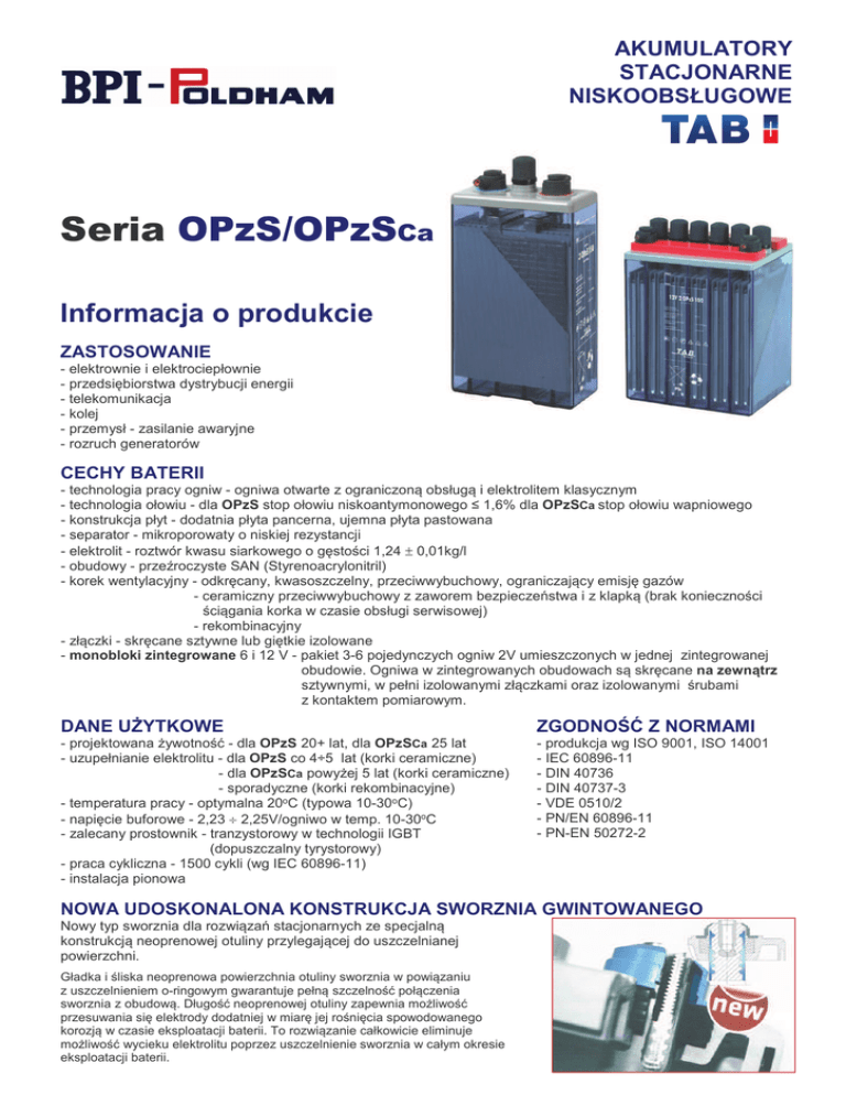 AKUMULATORY STACJONARNE NISKOOBSŁUGOWE Seria OPzS/OPzSCa Informacja o produkcie ZASTOSOWANIE - elektrownie i elektrociepłownie - przedsiębiorstwa dystrybucji energii - telekomunikacja - kolej - przemysł - zasilanie awaryjne - rozruch generatorów CECHY BATERII - technologia pracy ogniw - ogniwa otwarte z ograniczoną obsługą i elektrolitem klasycznym - technologia ołowiu - dla OPzS stop ołowiu niskoantymonowego ≤ 1,6% dla OPzSCa stop ołowiu wapniowego - konstrukcja płyt - dodatnia płyta pancerna, ujemna płyta pastowana - separator - mikroporowaty o niskiej rezystancji - elektrolit - roztwór kwasu siarkowego o gęstości 1,24 ± 0,01kg/l - obudowy - przeźroczyste SAN (Styrenoacrylonitril) - korek wentylacyjny - odkręcany, kwasoszczelny, przeciwwybuchowy, ograniczający emisję gazów - ceramiczny przeciwwybuchowy z zaworem bezpieczeństwa i z klapką (brak konieczności ściągania korka w czasie obsługi serwisowej) - rekombinacyjny - złączki - skręcane sztywne lub giętkie izolowane - monobloki zintegrowane 6 i 12 V - pakiet 3-6 pojedynczych ogniw 2V umieszczonych w jednej zintegrowanej obudowie. Ogniwa w zintegrowanych obudowach są skręcane na zewnątrz sztywnymi, w pełni izolowanymi złączkami oraz izolowanymi śrubami z kontaktem pomiarowym. DANE UŻYTKOWE ZGODNOŚĆ Z NORMAMI - projektowana żywotność - dla OPzS 20+ lat, dla OPzSCa 25 lat - uzupełnianie elektrolitu - dla OPzS co 4÷5 lat (korki ceramiczne) - dla OPzSCa powyżej 5 lat (korki ceramiczne) - sporadyczne (korki rekombinacyjne) - temperatura pracy - optymalna 20oC (typowa 10-30oC) - napięcie buforowe - 2,23 ÷ 2,25V/ogniwo w temp. 10-30oC - zalecany prostownik - tranzystorowy w technologii IGBT (dopuszczalny tyrystorowy) - praca cykliczna - 1500 cykli (wg IEC 60896-11) - instalacja pionowa - produkcja wg ISO 9001, ISO 14001 - IEC 60896-11 - DIN 40736 - DIN 40737-3 - VDE 0510/2 - PN/EN 60896-11 - PN-EN 50272-2 NOWA UDOSKONALONA KONSTRUKCJA SWORZNIA GWINTOWANEGO Nowy typ sworznia dla rozwiązań stacjonarnych ze specjalną konstrukcją neoprenowej otuliny przylegającej do uszczelnianej powierzchni. Gładka i śliska neoprenowa powierzchnia otuliny sworznia w powiązaniu z uszczelnieniem o-ringowym gwarantuje pełną szczelność połączenia sworznia z obudową. Długość neoprenowej otuliny zapewnia możliwość przesuwania się elektrody dodatniej w miarę jej rośnięcia spowodowanego korozją w czasie eksploatacji baterii. To rozwiązanie całkowicie eliminuje możliwość wycieku elektrolitu poprzez uszczelnienie sworznia w całym okresie eksploatacji baterii. SPECYFIKACJA TECHNICZNA Typ baterii 1 OPzS/OPzSCa 50 2 OPzS/OPzSCa 100 3 OPzS/OPzSCa 150 4 OPzS/OPzSCa 200 5 OPzS/OPzSCa 250 6 OPzS/OPzSCa 300 2 OPzS/OPzSCa 100 3 OPzS/OPzSCa 150 4 OPzS/OPzSCa 200 5 OPzS/OPzSCa 250 6 OPzS/OPzSCa 300 5 OPzS/OPzSCa 350 6 OPzS/OPzSCa 420 7 OPzS/OPzSCa 490 6 OPzS/OPzSCa 600 8 OPzS/OPzSCa 800 10 OPzS/OPzSCa 1000 12 OPzS/OPzSCa 1200 12 OPzS/OPzSCa 1500 16 OPzS/OPzSCa 2000 20 OPzS/OPzSCa 2500 24 OPzS/OPzSCa 3000 Napięcie Pojemność Pojemność Prąd I10 Un [V] Cn *) [Ah] C10 **) [Ah] 12 50 55 5,5 12 100 110 11,0 Wymiary baterii [mm] rozładowania Długość [A] [L] Waga z Szerokość Wysokość [W] [H] elektrolitem [kg] 272 205 388 39 272 205 388 50 12 150 160 16,0 380 205 388 69 6 200 210 21,0 272 205 388 47 6 250 260 26,0 380 205 388 61 6 300 310 31,0 380 205 388 68 2 100 115 11,2 103 206 275 13,7 2 150 165 16,5 103 206 275 16 2 200 215 21,5 103 206 275 18 2 250 270 27,0 124 206 375 22 2 300 320 32,0 145 206 375 26 2 350 380 38,0 124 206 491 29 2 420 455 45,5 145 206 491 34 2 490 535 53,5 166 206 491 39 2 600 660 66,0 145 206 666 50 2 800 875 87,5 191 210 666 65 2 1000 1100 110,0 233 210 666 80 2 1200 1300 130,0 275 210 666 93 2 1500 1700 170,0 275 210 821 119 2 2000 2200 220,0 397 212 797 160 2 2500 2800 280,0 487 212 797 200 2 3000 3300 330,0 576 212 797 240 *) Pojemność nominalna Cn według norm DIN 40736 oraz DIN 40737-3 **) Pojemność gwarantowana C10, przy rozładowaniu 10h w temperaturze 20oC, do napięcia 1,80V/ogniwo dla gęstości elektrolitu 1,24kg/l Uwaga: Ze względu na ciągły rozwój technologii produkcji dane gwarantowane mogą ulec zmianie. BPI-POLDHAM Sp. z o.o. ul. Suchodolska 8/2 04-011 Warszawa tel. +48 22 870 52 25, +48 22 870 55 95 fax +48 22 870 66 30 e-mail: [email protected] www.poldham.com.pl