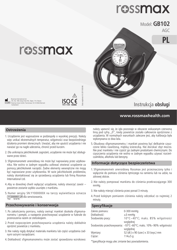 Model: GB102 AGC Rossmax International Ltd. 12F., No. 189, Kang Chien Rd., Taipei, 114, Taiwan. Rossmax Swiss GmbH, Tramstrasse 16 CH-9442 Berneck Switzerland Data wydania:V-3-2011/05/06 PL Instrukcja obsługi www.rossmaxhealth.com Ostrzeżenia 1. Urządzenie jest wyposażone w podzespoły o wysokiej precyzji. Należy więc unikać ekstremalnych temperatur, wilgotności oraz bezpośredniego działania promieni słonecznych. Uważać, aby nie upuścić urządzenia i nie narażać go na nagłe uderzenia, chronić przed kurzem. 2. Dla uniknięcia jakichkolwiek zagrożeń, urządzenie nie może być obsługiwane przez dzieci. 3. Sfigmomanometr aneroidowy nie może być naprawiany przez użytkownika. Nie wolno w żadnym wypadku usiłować otwierać urządzenie za pomocą jakichkolwiek narzędzi. Żadne elementy wewnętrzne nie mogą być naprawiane przez użytkownika. W razie jakichkolwiek problemów, należy skontaktować się ze sprzedawcą urządzenia lub firmą Rossmax International Ltd. 4. Aby w dowolnej chwili wyłączyć urządzenie, należy otworzyć zawór – powietrze zostanie szybko usunięte z mankietu. 5. N umer seryjny SN:YY000000X na tarczy wyświetlacza oznacza dla serwisowania. Przechowywanie i konserwacja 1. Po zakończeniu pomiaru, należy owinąć mankiet dookoła sfigmomanometru i pompki, a następnie przechowywać urządzenie w futerale do przenoszenia razem ze stetoskopem. 2. P rzed rozpoczęciem przechowywania urządzenia należy dokładnie opróżnić powietrze z mankietu. 3. Nie należy nigdy dotykać materiału mankietu lub części urządzenia żadnymi ostrymi narzędziami. 4. Dokładność sfigmomanometru może zostać sprawdzona wzrokowo: należy upewnić się, że igła pozostaje w obszarze wskazanym czerwoną linią pod cyfrą „0”, kiedy powietrze zostało całkowicie opróżnione z urządzenia. W normalnych warunkach zalecane jest, aby kalibracja była wykonywana co dwa lata. 5. Obudowa sfigmomanometru i mankiet powinny być delikatnie czyszczone lekko nawilżoną, miękką ściereczką. Nie dociskać zbyt mocno. Nie prać mankietu i nie czyścić go żadnymi produktami chemicznymi. Do czyszczenia urządzenia nie wolno w żadnym wypadku używać rozcieńczalników, alkoholu lub benzyny. Informacje dotyczące bezpieczeństwa 1. S figmomanometr aneroidowy Rossmax jest przeznaczony tylko i wyłącznie do pomiaru ciśnienia tętniczego na ramieniu lub na udzie, na zdrowej skórze. 2. Nie należy pompować mankietu do ciśnienia przekraczającego 300 mmHg. 3. Nie należy mierzyć ciśnienia przez ponad 3 minuty. 4. Przed kolejnym pomiarem ciśnienia należy odczekać co najmniej 2 minuty. Specyfikacje Zakres pomiaru: 0-300 mmHg Dokładność: ±3 mmHg Środowisko pracy:10°C~40°C; maks. 85% wilgotności względnej Środowisko przechowywania:-10°C~60°C; maks. 10%~90% wilgotności względnej Wymiary: 52 (dł.) x 90 (szer.) x 33 (wys.) mm Ciężar: 114±5 g *Specyfikacje mogą ulec zmianie bez powiadomienia. Wstęp Dostępne obwody mankietu Serdecznie dziękujemy za dokonanie zakupu sfigmomanometru aneroidowego Rossmax. Pomiary ciśnienia tętniczego przeprowadzone za pomocą sfigmomanometru aneroidowego Rossmax wykonane są z dokładnością zbliżoną do wyników uzyskiwanych w badaniu specjalistycznym przy użyciu ciśnieniomierza i metody osłuchowej z zastosowaniem stetoskopu. Mankiet Rossmax: Osoba dorosła (9.4” – 12.6”) 24-32 cm Sfigmomanometr aneroidowy jest objęty gwarancją dotyczącą wad fabrycznych zgodnie z postanowieniami Międzynarodowego Programu Gwarancyjnego. Szczegółowe informacje można uzyskać kontaktując się z producentem, Rossmax International Ltd. lub z lokalnym dystrybutorem. Uwaga: Należy przeczytać dokumentację towarzyszącą. Przed zastosowaniem należy zapoznać się uważnie z instrukcją obsługi. Należy zachować instrukcje do wglądu. Tętnica główna Uwagi wstępne Sfigmomanometr aneroidowy spełnia wszystkie wymogi obowiązujących przepisów europejskich i zostało opatrzone oznakowaniem „CE 0366”. Jakość urządzenia została poddana kontroli i spełnia wszystkie wymogi europejskiej dyrektywy 93/42/EWG z dnia 14 czerwca 1993 roku, dotyczącej urządzeń medycznych, Załącznik 1 – wymogi podstawowe oraz norm ujednoliconych i EN1060-1 (1995, A1: 2002) Nieinwazyjne urządzenia do pomiaru ciśnienia krwi – Wymogi ogólne oraz EN 1060-2 (1995) Nieinwazyjne sfigmomanometry – Wymogi dodatkowe dotyczące sfigmomanometrów mechanicznych. Sfigmomanometr aneroidowy spełnia wszystkie wymogi norm ANSI / AAMI SP-10: 2002. Dla zapewnienia utrzymania precyzji pomiaru, w przypadku tego urządzenia zalecane jest przeprowadzanie jego ponownej kalibracji co dwa lata. Procedury pomiaru Informacje dotyczące ciśnienia tętniczego 1. Umieść końcówkę stetoskopu na tętnicy głównej, poniżej oznakowania tętnicy na mankiecie. (Rys. 1) Ważne jest, aby regularnie konsultować się ze swoim lekarzem. Lekarz udzieli pacjentowi informacji dotyczących jego normalnego ciśnienia krwi oraz wartości ciśnienia, przy której pacjent może być zagrożony. 2. K iedy zawór jest zamknięty, naciśnij pompkę i kontynuuj pompowanie aż do chwili, kiedy ciśnienie osiągnie wartość wyższą o mniej więcej 30~40 mmHg od Twojego zwykłego ciśnienia skurczowego. (Rys. 2) Dla zapewnienia niezawodnego pomiaru i kontroli ciśnienia tętniczego, należy prowadzić długoterminowy rejestr wyników pomiaru. Rejestr wyników pomiaru ciśnienia (karty przeznaczone do zapisu i kontroli najważniejszych informacji: data, godzina, ciśnienie tętnicze, tętno i stan zdrowia) może zostać pobrany na stronie www.rossmaxhealth.com. 3. Otwórz zawór, aby rozpocząć stopniowe spuszczania ciśnienia z mankietu, z prędkością wynoszącą mniej więcej 2-3 mmHg na sekundę. (Rys. 3) 4. Pierwszy dźwięk Korotkowa oznacza ciśnienie skurczowe, natomiast ostatni to ciśnienie rozkurczowe. 5. Po zakończeniu pomiaru, otwórz całkowici
