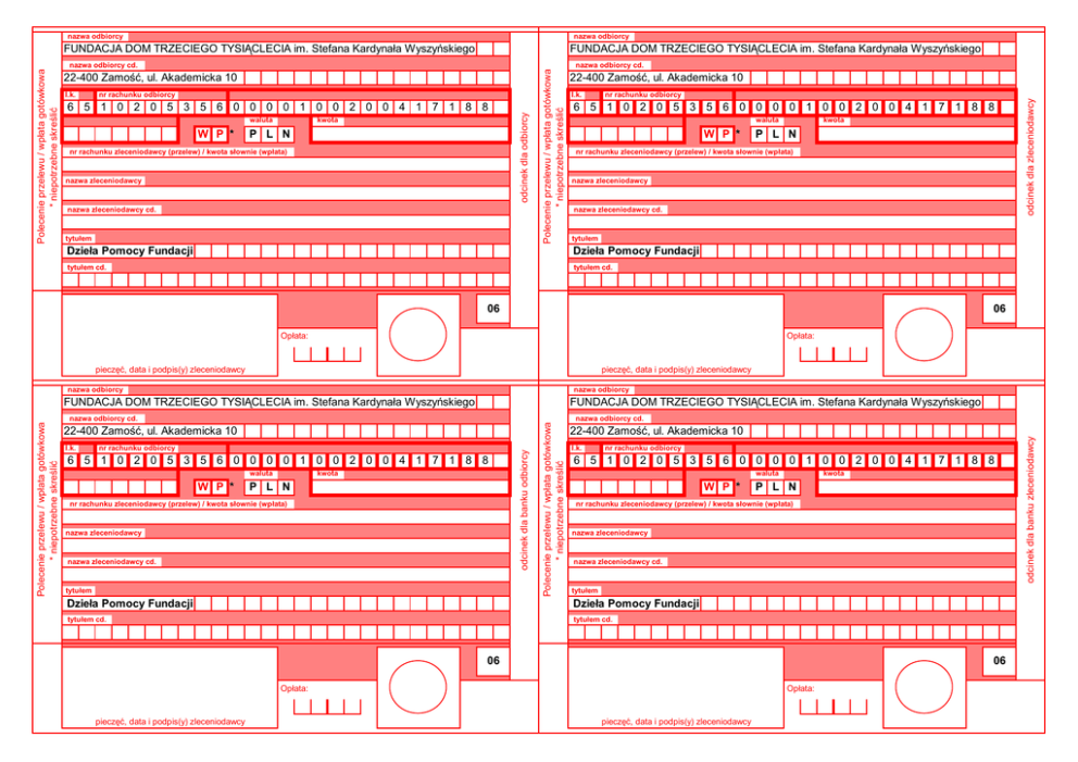 nazwa odbiorcy nazwa odbiorcy FUNDACJA DOM TRZECIEGO TYSIĄCLECIA im. Stefana Kardynała Wyszyńskiego FUNDACJA DOM TRZECIEGO TYSIĄCLECIA im. Stefana Kardynała Wyszyńskiego waluta W P * kwota P L N nr rachunku zleceniodawcy (przelew) / kwota słownie (wpłata) nazwa zleceniodawcy nazwa zleceniodawcy cd. tytułem l.k. nr rachunku odbiorcy 6 5 1 0 2 0 5 3 5 6 0 0 0 0 1 0 0 2 0 0 4 1 7 1 8 8 waluta W P * kwota P L N nr rachunku zleceniodawcy (przelew) / kwota słownie (wpłata) nazwa zleceniodawcy nazwa zleceniodawcy cd. tytułem Dzieła Pomocy Fundacji Dzieła Pomocy Fundacji tytułem cd. tytułem cd. 06 06 Opłata: Opłata: pieczęć, data i podpis(y) zleceniodawcy pieczęć, data i podpis(y) zleceniodawcy nazwa odbiorcy nazwa odbiorcy nazwa odbiorcy cd. 22-400 Zamość, ul. Akademicka 10 nr rachunku odbiorcy 6 5 1 0 2 0 5 3 5 6 0 0 0 0 1 0 0 2 0 0 4 1 7 1 8 8 waluta W P * kwota P L N nr rachunku zleceniodawcy (przelew) / kwota słownie (wpłata) nazwa zleceniodawcy nazwa zleceniodawcy cd. tytułem Polecenie przelewu / wpłata gotówkowa * niepotrzebne skreślić FUNDACJA DOM TRZECIEGO TYSIĄCLECIA im. Stefana Kardynała Wyszyńskiego odcinek dla banku odbiorcy Polecenie przelewu / wpłata gotówkowa * niepotrzebne skreślić FUNDACJA DOM TRZECIEGO TYSIĄCLECIA im. Stefana Kardynała Wyszyńskiego l.k. odcinek dla zleceniodawcy nr rachunku odbiorcy 6 5 1 0 2 0 5 3 5 6 0 0 0 0 1 0 0 2 0 0 4 1 7 1 8 8 22-400 Zamość, ul. Akademicka 10 nazwa odbiorcy cd. 22-400 Zamość, ul. Akademicka 10 l.k. nr rachunku odbiorcy 6 5 1 0 2 0 5 3 5 6 0 0 0 0 1 0 0 2 0 0 4 1 7 1 8 8 waluta W P * kwota P L N nr rachunku zleceniodawcy (przelew) / kwota słownie (wpłata) nazwa zleceniodawcy nazwa zleceniodawcy cd. tytułem Dzieła Pomocy Fundacji Dzieła Pomocy Fundacji tytułem cd. tytułem cd. 06 06 Opłata: pieczęć, data i podpis(y) zleceniodawcy Opłata: pieczęć, data i podpis(y) zleceniodawcy odcinek dla banku zleceniodawcy l.k. Polecenie przelewu / wpłata gotówkowa * niepotrzebne skreślić nazwa odbiorcy cd. odcinek dla odbiorcy Polecenie przelewu / wpłata gotówkowa * niepotrzebne skreślić nazwa odbiorcy cd. 22-400 Zamość, ul. Akademicka 10