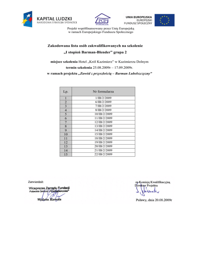 Projekt współfinansowany przez Unię Europejską w ramach Europejskiego Funduszu Społecznego Zakodowana lista osób zakwalifikowanych na szkolenie „I stopień Barman-Blender” grupa 2 miejsce szkolenia Hotel „Król Kazimierz” w Kazimierzu Dolnym termin szkolenia 25.08.2009r – 17.09.2009r. w ramach projektu „Zawód z przyszłością – Barman Lubelszczyzny” Lp. Nr formularza 1 2 3 4 5 6 7 8 9 10 11 12 13 14 15 1/IB/2/2009 6/IB/2/2009 7/IB/2/2009 8/IB/2/2009 10/IB/2/2009 11/IB/2/2009 12/IB/2/2009 13/IB/2/2009 14/IB/2/2009 15/IB/2/2009 18/IB/2/2009 19/IB/2/2009 20/IB/2/2009 21/IB/2/2009 22/IB/2/2009