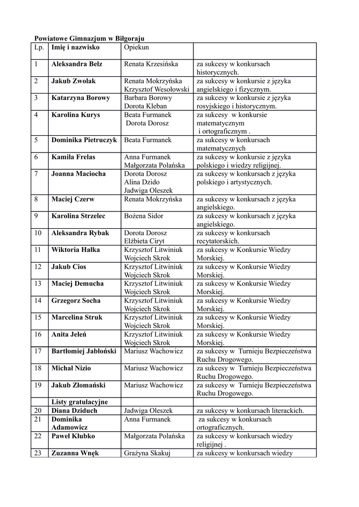 Powiatowe Gimnazjum w Biłgoraju Lp. Imię i nazwisko Opiekun 1 2 3 4 5 6 7 8 9 10 11 12 13 14 15 16 17 18 19 20 21 22 23 Aleksandra Bełz Renata Krzesińska za sukcesy w konkursach historycznych. Jakub Zwolak Renata Mokrzyńska za sukcesy w konkursie z języka Krzysztof Wesołowski angielskiego i fizycznym. Katarzyna Borowy Barbara Borowy za sukcesy w konkursie z języka Dorota Kleban rosyjskiego i historycznym. Karolina Kurys Beata Furmanek za sukcesy w konkursie Dorota Dorosz matematycznym i ortograficznym . Dominika Pietruczyk Beata Furmanek za sukcesy w konkursach matematycznych Kamila Frelas Anna Furmanek za sukcesy w konkursie z języka Małgorzata Polańska polskiego i wiedzy religijnej. Joanna Maciocha Dorota Dorosz za sukcesy w konkursach z języka Alina Dzido polskiego i artystycznych. Jadwiga Oleszek Maciej Czerw Renata Mokrzyńska za sukcesy w konkursach z języka angielskiego. Karolina Strzelec Bożena Sidor za sukcesy w konkursach z języka angielskiego. Aleksandra Rybak Dorota Dorosz za sukcesy w konkursach Elżbieta Ciryt recytatorskich. Wiktoria Hałka Krzysztof Litwiniuk za sukcesy w Konkursie Wiedzy Wojciech Skrok Morskiej. Jakub Cios Krzysztof Litwiniuk za sukcesy w Konkursie Wiedzy Wojciech Skrok Morskiej. Maciej Demucha Krzysztof Litwiniuk za sukcesy w Konkursie Wiedzy Wojciech Skrok Morskiej. Grzegorz Socha Krzysztof Litwiniuk za sukcesy w Konkursie Wiedzy Wojciech Skrok Morskiej. Marcelina Struk Krzysztof Litwiniuk za sukcesy w Konkursie Wiedzy Wojciech Skrok Morskiej. Anita Jeleń Krzysztof Litwiniuk za sukcesy w Konkursie Wiedzy Wojciech Skrok Morskiej. Bartłomiej Jabłoński Mariusz Wachowicz za sukcesy w Turnieju Bezpieczeństwa Ruchu Drogowego. Michał Nizio Mariusz Wachowicz za sukcesy w Turnieju Bezpieczeństwa Ruchu Drogowego. Jakub Złomański Mariusz Wachowicz za sukcesy w Turnieju Bezpieczeństwa Ruchu Drogowego. Listy gratulacyjne Diana Dziduch Jadwiga Oleszek za sukcesy w konkursach literackich. Dominika Anna Furmanek za sukcesy w konkursach Adamowicz ortograficznych. Paweł Kłubko Małgorzata Polańska za sukcesy w konkursach wiedzy religijnej . Zuzanna Wnęk Grażyna Skakuj za sukcesy w konkursach wiedzy 24 Marlena Świerzak Grażyna Skakuj religijnej. za sukcesy w konkursach wiedzy religijnej.