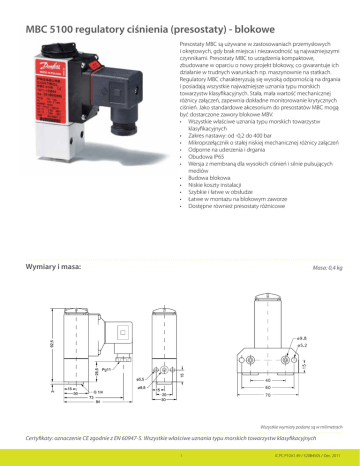 MBC 5100 regulatory ciśnienia (presostaty) - blokowe Presostaty MBC są używane w zastosowaniach przemysłowych i okrętowych, gdy brak miejsca i niezawodność są najważniejszymi czynnikami. Presostaty MBC to urządzenia kompaktowe, zbudowane w oparciu o nowy projekt blokowy, co gwarantuje ich działanie w trudnych warunkach np. maszynownie na statkach. Regulatory MBC charakteryzują się wysoką odpornością na drgania i posiadają wszystkie najważniejsze uznania typu morskich towarzystw klasyfikacyjnych. Stała, mała wartość mechanicznej różnicy załączeń, zapewnia dokładne monitorowanie krytycznych ciśnień. Jako standardowe akcesorium do presostatów MBC mogą być dostarczone zawory blokowe MBV. • Wszystkie właściwe uznania typu morskich towarzystw klasyfikacyjnych • Zakres nastawy: od -0,2 do 400 bar • Mikroprzełącznik o stałej niskiej mechanicznej różnicy załączeń • Odporne na uderzenia i drgania • Obudowa IP65 • Wersja z membraną dla wysokich ciśnień i silnie pulsujących mediów • Budowa blokowa • Niskie koszty instalacji • Szybkie i łatwe w obsłudze • Łatwe w montażu na blokowym zaworze • Dostępne również presostaty różnicowe Wymiary i masa: Masa: 0,4 kg Wszystkie wymiary podane są w milimetrach Certyfikaty: oznaczenie CE zgodnie z EN 60947-5. Wszystkie właściwe uznania typu morskich towarzystw klasyfikacyjnych 11 IC.PC.P10.K1.49 / 520B4505 / Dec. 2011 MBC 5100 regulatory ciśnienia (presostaty) - blokowe System styków: SPDT Materiał styków: Srebro Obciążenie styków: AC-1 (rezystancyjne) 10A, 250V AC-3 (siln. indukcyjne) 3A, 250V AC-15 (cewki) 0,5A, 250V Wtyczka Pg 11. Inne przyłącza elektryczne dostępne na żądanie. Min. nieustawialna mechaniczna różnica załączeń bar Zakres nastawy bar Pe Maks. nieustawialna mechaniczna różnica załączeń bar Przyłącze Maks. ciśnienie robocze bar Pe G 1/4 A Kołnierz Numer katalogowy Wykonanie mieszkowe dla niskich ciśnień. Temperatura otoczenia: -40 do 85 °C -0,2 à 1 0,15 0,45 15 ü ü 061B000566 -0,2 à 4 0,15 0,45 15 ü ü 061B000466 -0,2 à 4 0,15 0,45 15 ü -0,2 à 10 0,15 0,6 15 ü ü 061B000266 ü 061B100466 061B001066 Wykonanie membranowe dla niskich ciśnień. Temperatura otoczenia: -10 do 85 °C 1 à 10 0,30 2,5 150 ü 1 à 10 0,30 2,5 150 ü 5 à 20 0,4 2,5 150 ü ü 061B100266 061B100866 Wykonanie membranowe dla wysokich ciśnień. Temperatura otoczenia: -10 do 85 °C 5 à 40 1,0 7 150 ü ü 061B100566 10 à 100 1,7 14 150 ü ü 061B100366 Wykonanie tłokowe dla wysokich ciśnień. Temperatura otoczenia: -40 do 85 °C 16 à 160 12 30 600 ü 061B510066 25 à 250 12 40 600 ü 061B510166 40 à 400 15 50 600 ü 061B510266 Blokowy presostat różnicowy typu MBC 5180 Przyłącze Zakres pracy, strona niskiego ciśnienia (LP) bar Pe Maksymalne ciśnienie robocze bar Pe 0,3 à 5 0 à 30 45 0,3 à 5 0 à 30 45 Zakres nastawy bar Pe G 1/4 A G 1/4 A z kołnierzem Numer katalogowy 061B128066 ü 061B129066 ü Części zamienne do MBC5100 Typ Opis Tłumik pulsacji Gwint zewn. G1/4A, długość 20 mm 061B400101 Tłumik pulsacji Gwint zewn. G1/4A, długość 34 mm 061B400201 Tłumik pulsacji Do połączenia kołnierzowego 061B722101 Tłumik pulsacji 20 mm 2 2 Tłumik pulsacji 34 mm Tłumik pulsacji do połączenia kołnierzowego IC.PC.P10.K1.49 / 520B4505 / Dec. 2011