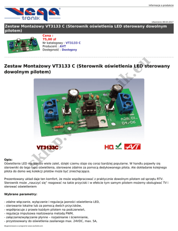 Informacje o produkcie Utworzono 08-03-2017 Zestaw Montażowy VT3133 C (Sterownik oświetlenia LED sterowany dowolnym pilotem) Cena : 75,00 zł eu Nr katalogowy : VT3133 C Producent : AVT Dostępność : Dostępny sk le p. ve g atr on i k. Zestaw Montażowy VT3133 C (Sterownik oświetlenia LED sterowany dowolnym pilotem) Opis: Oświetlenie LED ma bardzo wiele zalet, dzięki czemu staje się coraz bardziej popularne. W handlu pojawiły się sterowniki do tego typu oświetlenia, sterowane zdalnie za pomocą dedykowanego pilota. Ale dokładanie kolejnego pilota do domo wej kolekcji pilotów może być zniechęcające. Prezentowany układ daje ten komfort, że może współpracować z praktycznie dowolnym pilotem od sprzętu RTV. Sterownik może „nauczyć się” reagować na takie przyciski i w efekcie tym samym pilotem możemy obsługiwać TV i sterować oświetleniem Wybrane parametry: - zdalne włączanie, wyłączanie i regulacja jasności oświetlenia LED, - sterowanie lokalne lub za pomocą dwóch przycisków, - współpracuje z prawie każdym pilotem na podczerwień, - regulacja impulsowa realizowana metodą PWM, - załączanie/wyłączanie płynne – rozjaśnianie i ściemnianie, - przystosowany do oświetlenia zasilanego max. 24VDC, max. 5A, Wygenerowano w programie www.oscGold.com - zasilanie 9...24V, pobór prądu samego sterownika ok. 10mA, - wymiary zmontowanego układu 72x39x15mm (proponowana obudowa - Z75) - wymiary płytki PCB 72x39mm Zestaw w wersii C zmontowany i uruchomiony zestaw B sk le p. ve g atr on i k. eu Dokumentacja i opis >> Link <<