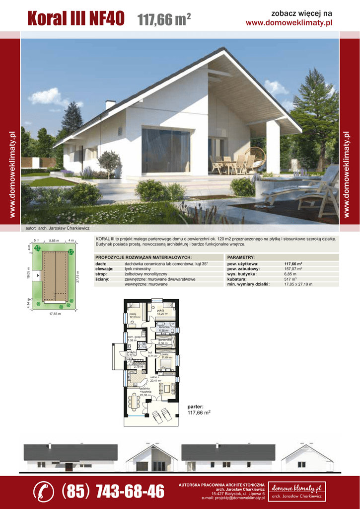 Koral III NF40 www.domoweklimaty.pl zobacz więcej na www.domoweklimaty.pl www.domoweklimaty.pl 117,66 m 2 autor: arch. Jarosław Charkiewicz 8,85 m KORAL III to projekt małego parterowego domu o powierzchni ok. 120 m2 przeznaczonego na płytką i stosunkowo szeroką działkę. Budynek posiada prostą, nowoczesną architekturę i bardzo funkcjonalne wnętrze. 4m PROPOZYCJE ROZWIĄZAŃ MATERIAŁOWYCH: PARAMETRY: dach: elewacje: strop: ściany: pow. użytkowa: pow. zabudowy: wys. budynku: kubatura: min. wymiary działki: dachówka ceramiczna lub cementowa, kąt 35° tynk mineralny żelbetowy monolityczny zewnętrzne: murowane dwuwarstwowe wewnętrzne: murowane 4,14 m 27,19 m 19,05 m 4m 5m 17,85 m pokój 13,20 m2 pokój 12,23 m2 łazienka 6,36 m2 pom. gosp. 7.38 m2 c.o. garderoba 6,36 m2 WC 1,38 przeds. 5,72 m2 hol 9,71 m2 pokój 11,04 m2 spiżarnia 2,79 m2 salon + 20,41 m2 jadalnia +kuchnia 20,08 m2 parter: 117,66 m2 78 (85) 743-68-46 AUTORSKA PRACOWNIA ARCHITEKTONICZNA arch. Jarosław Charkiewicz 15-427 Białystok, ul. Lipowa 6 e-mail: [email protected] 117,66 m2 157,07 m2 6,85 m 517 m3 17,85 x 27,19 m