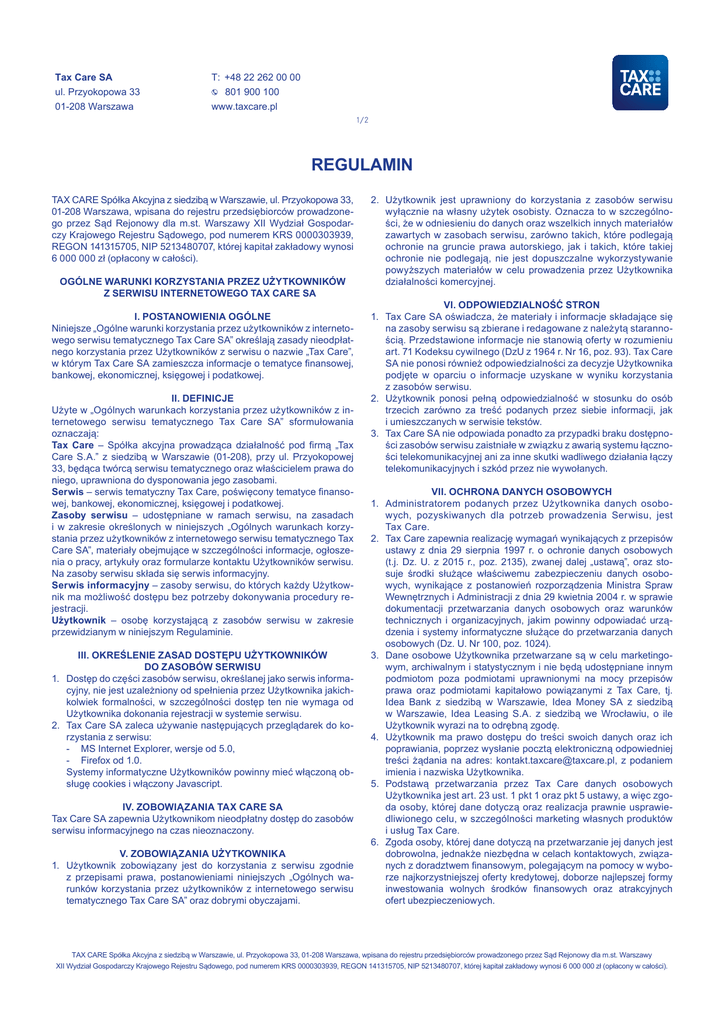 Tax Care SA ul. Przyokopowa 33 01-208 Warszawa T: +48 22 262 00 00 801 900 100 www.taxcare.pl 1/2 REGULAMIN TAX CARE Spółka Akcyjna z siedzibą w Warszawie, ul. Przyokopowa 33, 01-208 Warszawa, wpisana do rejestru przedsiębiorców prowadzonego przez Sąd Rejonowy dla m.st. Warszawy XII Wydział Gospodarczy Krajowego Rejestru Sądowego, pod numerem KRS 0000303939, REGON 141315705, NIP 5213480707, której kapitał zakładowy wynosi 6 000 000 zł (opłacony w całości). OGÓLNE WARUNKI KORZYSTANIA PRZEZ UŻYTKOWNIKÓW Z SERWISU INTERNETOWEGO TAX CARE SA I. POSTANOWIENIA OGÓLNE Niniejsze „Ogólne warunki korzystania przez użytkowników z internetowego serwisu tematycznego Tax Care SA” określają zasady nieodpłatnego korzystania przez Użytkowników z serwisu o nazwie „Tax Care”, w którym Tax Care SA zamieszcza informacje o tematyce finansowej, bankowej, ekonomicznej, księgowej i podatkowej. II. DEFINICJE Użyte w „Ogólnych warunkach korzystania przez użytkowników z internetowego serwisu tematycznego Tax Care SA” sformułowania oznaczają: Tax Care – Spółka akcyjna prowadząca działalność pod firmą „Tax Care S.A.” z siedzibą w Warszawie (01-208), przy ul. Przyokopowej 33, będąca twórcą serwisu tematycznego oraz właścicielem prawa do niego, uprawniona do dysponowania jego zasobami. Serwis – serwis tematyczny Tax Care, poświęcony tematyce finansowej, bankowej, ekonomicznej, księgowej i podatkowej. Zasoby serwisu – udostępniane w ramach serwisu, na zasadach i w zakresie określonych w niniejszych „Ogólnych warunkach korzystania przez użytkowników z internetowego serwisu tematycznego Tax Care SA”, materiały obejmujące w szczególności informacje, ogłoszenia o pracy, artykuły oraz formularze kontaktu Użytkowników serwisu. Na zasoby serwisu składa się serwis informacyjny. Serwis informacyjny – zasoby serwisu, do których każdy Użytkownik ma możliwość dostępu bez potrzeby dokonywania procedury rejestracji. Użytkownik – osobę korzystającą z zasobów serwisu w zakresie przewidzianym w niniejszym Regulaminie. III. OKREŚLENIE ZASAD DOSTĘPU UŻYTKOWNIKÓW DO ZASOBÓW SERWISU 1. Dostęp do części zasobów serwisu, określanej jako serwis informacyjny, nie jest uzależniony od spełnienia przez Użytkownika jakichkolwiek formalności, w szczególności dostęp ten nie wymaga od Użytkownika dokonania rejestracji w systemie serwisu. 2. Tax Care SA zaleca używanie następujących przeglądarek do korzystania z serwisu: - MS Internet Explorer, wersje od 5.0, - Firefox od 1.0. Systemy informatyczne Użytkowników powinny mieć włączoną obsługę cookies i włączony Javascript. IV. ZOBOWIĄZANIA TAX CARE SA Tax Care SA zapewnia Użytkownikom nieodpłatny dostęp do zasobów serwisu informacyjnego na czas nieoznaczony. V. ZOBOWIĄZANIA UŻYTKOWNIKA 1. Użytkownik zobowiązany jest do korzystania z serwisu zgodnie z przepisami prawa, postanowieniami niniejszych „Ogólnych warunków korzystania przez użytkowników z internetowego serwisu tematycznego Tax Care SA” oraz dobrymi obyczajami. 2. Użytkownik jest uprawniony do korzystania z zasobów serwisu wyłącznie na własny użytek osobisty. Oznacza to w szczególności, że w odniesieniu do danych oraz wszelkich innych materiałów zawartych w zasobach serwisu, zarówno takich, które podlegają ochronie na gruncie prawa autorskiego, jak i takich, które takiej ochronie nie podlegają, nie jest dopuszczalne wykorzystywanie powyższych materiałów w celu prowadzenia przez Użytkownika działalności komercyjnej. VI. ODPOWIEDZIALNOŚĆ STRON 1. Tax Care SA oświadcza, że materiały i informacje składające się na zasoby serwisu są zbierane i redagowane z należytą starannością. Przedstawione informacje nie stanowią oferty w rozumieniu art. 71 Kodeksu cywilnego (DzU z 1964 r. Nr 16, poz. 93). Tax Care SA nie ponosi również odpowiedzialności za decyzje Użytkownika podjęte w oparciu o informacje uzyskane w wyniku korzystania z zasobów serwisu. 2. Użytkownik ponosi pełną odpowiedzialność w stosunku do osób trzecich zarówno za treść podanych przez siebie informacji, jak i umieszczanych w serwisie tekstów. 3. Tax Care SA nie odpowiada ponadto za przypadki braku dostępności zasobów serwisu zaistniałe w związku z awarią systemu łączności telekomunikacyjnej ani za inne skutki wadliwego działania łączy telekomunikacyjnych i szkód przez nie wywołanych. VII. OCHRONA DANYCH OSOBOWYCH 1. Administratorem podanych przez Użytkownika danych osobowych, pozyskiwanych dla potrzeb prowadzenia Serwisu, jest Tax Care. 2. Tax Care zapewnia realizację wymagań wynikających z przepisów ustawy z dnia 29 sierpnia 1997 r. o ochronie danych osobowych (t.j. Dz. U. z 2015 r., poz. 2135), zwanej dalej „ustawą”, oraz stosuje środki służące właściwemu zabezpieczeniu danych osobowych, wynikające z postanowień rozporządzenia Ministra Spraw Wewnętrznych i Administracji z dnia 29 kwietnia 2004 r. w sprawie dokumentacji przetwarzania danych osobowych oraz warunków technicznych i organizacyjnych, jakim powinny odpowiadać urządzenia i systemy informatyczne służące do przetwarzania danych osobowych (Dz. U. Nr 100, poz. 1024). 3. Dane osobowe Użytkownika przetwarzane są w celu marketingowym, archiwalnym i statystycznym i nie będą udostępniane innym podmiotom poza podmiotami uprawnionymi na mocy przepisów prawa oraz podmiotami kapitałowo powiązanymi z Tax Care, tj. Idea Bank z siedzibą w Warszawie, Idea Money SA z siedzibą w Warszawie, Idea Leasing S.A. z siedzibą we Wrocławiu, o ile Użytkownik wyrazi na to odrębną zgodę. 4. Użytkownik ma prawo dostępu do treści swoich danych oraz ich poprawiania, poprzez wysłanie pocztą elektroniczną odpowiedniej treści żądania na adres: [email protected], z podaniem imienia i nazwiska Użytkownika. 5. Podstawą przetwarzania przez Tax Care danych osobowych Użytkownika jest art. 23 ust. 1 pkt 