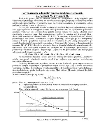 LABORATORIUM MECHANIKI GRUNTÓW Wyznaczanie edometrycznego modułu ściśliwości, pierwotnej M0 i wtórnej M. Ściśliwość gruntu jest to zdolność gruntu do zmniejszania swojej objętości pod wpływem przyłożonego obciążenia. Za miarę ściśliwości przyjmuje się edometryczny moduł ściśliwości pierwotnej M0 i wtórnej M, który ma wymiar naprężenia, a wyznaczany jest na podstawie badania gruntu w edometrze. Przy użyciu suwmiarki określić wewnętrzną średnicę D pierścienia edometrycznego oraz jego wysokość h. Następnie określić masę pierścienia mt. Po wypełnieniu pierścienia gruntem wyrównać obie powierzchnie próbki ostrym nożem lub struną. Określić masę pierścienia z gruntem mmt. Tak przygotowaną próbkę, z nałożonymi krążkami bibuły filtracyjnej, umieścić w edometrze (fot. 5.2 i 5.3). W następnej kolejności założyć wieszak przekazujący obciążenie, zamontować czujnik zegarowy, ustawiając go na maksymalny zakres (10 mm) i przyłożyć pierwszy stopień obciążenia 25 kPa (masę obciążników, po uwzględnieniu przełożenia, ustalić w oparciu o wykres (rys 5.2). Notować wskazania czujnika po czasie 30”, 1’, 2’ i 5’. Po pięciu minutach, dołożyć lub zdjąć obciążniki o takiej masie, aby obciążenie było dwukrotnie większe lub mniejsze od poprzedniego, powtarzając cykl pomiarowy wskazań czujnika zegarowego. Czynności te powtarzamy dla następującej sekwencji przyłożonych naprężeń w kPa: 25 - 50 - 100 - 200 - 100 - 50 - 25 - 50 - 100 - 200 - 400. Po zakończeniu badania określić ponownie masę pierścienia z gruntem. Dodatkowo należy wyznaczyć wilgotność gruntu przed i po badaniu oraz gęstość objętościową, początkową i końcową. Podstawę do obliczania wyników stanowi wykres ściśliwości gruntu opracowany na podstawie danych uzyskanych z przeprowadzonych badań (rys. 5.1). Krzywą ściśliwości wyznaczają punkty odpowiadające wysokości próbki po 5 minutach utrzymywania kolejnego stopnia obciążenia. Moduł ściśliwości pierwotnej M0 i wtórnej M należy obliczyć dla kilku przedziałów naprężeń. Wartość modułu obliczyć wg wzoru: ∆σ i ⋅ h i −1 [kPa] M= ∆h i gdzie: ∆σi – przyrost naprężenia σi – σi-1; [kPa] hi-1 – wysokość próbki dla początkowej wartości obciążenia w danym przedziale naprężeń; [mm] ∆hi – zmiana wysokości próbki dla danego przyrostu naprężeń; [mm] h [mm] wykres ściśliwości pierwotnej wykres ściśliwości wtórnej Rys. 5.1. Krzywa ściśliwości gruntu. σ [kPa] LABORATORIUM MECHANIKI GRUNTÓW Edometry Fot. 5.2. Ogólny widok edometru. Tłok Filtr dolny Filtr górny Podstawa Pierścień Pierścień dociskowy Pierścień uszczelniający Śruby mocujące Fot. 5.3. Elementy edometru. LABORATORIUM MECHANIKI GRUNTÓW Rys. 5.2. Wykres zależności pomiędzy masą odważników a naprężeniem (dla różnych przełożeń)