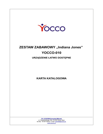 ZESTAW ZABAWOWY „Indiana Jones” YOCCO-010 URZĄDZENIE ŁATWO DOSTĘPNE KARTA KATALOGOWA F.H. SYSTEM Krzysztof Mliczek ul. Wyspiańskiego 30a, 33-300 Nowy Sącz tel./fax: 18 547 68 62, e-mail: [email protected] www.yocco.pl Rys. 1 Rys. 2 Rys. 3 Rys. 4 Rys. 5 DANE TECHNICZNE: • powierzchnia strefy bezpieczeństwa: 76 m2, • wymiary strefy bezpieczeństwa: 9,58m x 9,94m, • wymiary zestawu (dł. x szer. x wys.): 6,77m x 6,45m x 3,20m, • maksymalna wysokość upadku: 1,50m, • przeznaczony dla dzieci w wieku: 5 -12 lat, • rekomendowana ilość dzieci: 10 • waga spakowanego urządzenia: 1530 kg ELEMENTY ZESTAWU: • 6 x rama podpierająca • 1 x przeplotnia wspinaczkowa, • 1 x zjeżdżalnia, • 1 x mostek linowy, • 1 x wiszące talerzyki, • 1 x stopnie wejściowe, • 1 x stojak obrotowy, • 1 x tor sprawnościowy. MATERIAŁY: • słupy nośne stalowe o średnicy 114mm, grubość ścianki 2,5mm, • pozostałe elementy metalowe wykonane z rur stalowych o średnicy 25/32/38/48mm, grubość ścianki 2,5mm • elementy plastikowe wykonane z tworzywa LLDPE, • liny o średnicy 16mm ( lina wielozwita, lina rdzeniowa polipropylenowa, splotki zewnętrzne z drutów stalowych, pokryte teflonem i oplotem polipropylenowym), łączone ze sobą za pomocą okrągłych aluminiowych łączników, • śruby maszynowe wykonane ze stali nierdzewnej, nakrętki samokontrujące, • montaż na wylewce betonowej – stalowe kołki rozporowe do betonu M10x100mm, • montaż w ziemi - fundamenty wykonane z betonu klasy C15/20. ZABEZPIECZENIA: • elementy stalowe, śrutowane, odtłuszczane i galwanizowane. Finalne zabezpieczenie oparte na przemysłowej technologii Interpon PZ660 SYSTEM firmy AKZO Nobel – warstwa podkładowa na bazie cynku następnie farba proszkowa. Utwardzanie poprzez obróbkę termiczną, • nakrętki i wystające śruby zakryte zaślepkami z tworzywa. MONTAŻ I POSADOWIENIE: • konstrukcja modułowa skręcana, zgodnie z dokumentacją – połączenia śrubowe, • metody posadowienia: - na wylewce betonowej o grubości min. 15cm wykonanej z betonu klasy C20. Montaż min. 20 dni po wylaniu betonu. Słupki nośne mocowane zapomocą stalowych kołków rozporowych M10x100mm, zabezpieczane specjalnym kołnierzem, - w gruncie, słupki nośne fundamentowane zgodnie z normą PN-EN 11761:2009. Fundament umieszczony zostaje co najmniej 400mm poniżej powierzchni zabawy. W przypadku fundamentu schodkowego beton znajduje się co najmniej 200mm poniżej tej powierzchni. Wyjątek stanowi sytuacja, gdy plac zabaw pokrywany jest syntetyczną nawierzchnią amortyzującą. OZNAKOWANIE: • tabliczka znamionowa zawierająca informacje: - model urządzenia, - rok produkcji, - norma, zgodnie z którą urządzenie zabawowe zostało wyprodukowane, - nazwa i adres producenta, - ostrzeżenie o nieużywaniu produktu w przypadku jego uszkodzenia.