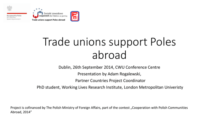 Trade unions support Poles abroad Trade unions support Poles abroad Dublin, 26th September 2014, CWU Conference Centre Presentation by Adam Rogalewski, Partner Countries Project Coordinator PhD student, Working Lives Research Institute, London Metropolitan Univeristy Project is cofinanced by The Polish Ministry of Foreign Affairs, part of the contest „Cooperation with Polish Communities Abroad, 2014” Trade unions support Poles abroad Związki zawodowe wsparciem dla Polaków za granicą Prezentacja na spotkanie w Dublinie, 26 września 2014, CWU Conference Centre Adam Rogalewski, koordynator projektu na kraje partnerskie doktorant, Working Lives Research Institute, London Metropolitan Univeristy Projekt jest współfinansowany ze środków finansowych otrzymanych z Ministerstwa Spraw Zagranicznych w ramach konkursu na realizację zadania "Współpraca z Polonią i Polakami za granicą w 2014 r." Trade unions support Poles abroad Topics of presentation: 1. Role of trade unions in successful integration of Polish workers in the West European countries. 2. Objectives, tasks and actions taken as part of the project. 3. Polish Activists Network in West European trade unions. 4. Guidebook on employment, social and civic law for Polish workers. 5. Questions and answers. Związki zawodowe wsparciem dla Polaków za granicą , Spotkanie w Dublinie 3 Trade unions support Poles abroad Tematyka prezentacji 1. Rola i sukcesy związków zawodowych w integracji polskich pracowników w krajach Europy zachodniej. 2. Cele, zadania oraz działania w ramach projektu. 3. Network polskich aktywistów w zachodnioeuropejskich związkach zawodowych. 4. Przewodnik o prawach pracowniczych, socjalnych i obywatelskich dla polskich pracowników. 5. Pytania i odpowiedzi. Związki zawodowe wsparciem dla Polaków za granicą , Spotkanie w Dublinie 4 Trade unions support Poles abroad Role of trade unions and successful integration of Polish workers in the West European countries • After 2004 the migration of the Polish workers was the greatest in the whole of Polish history. Around 2,02 millions of Poles had left their country, equivalent to the population of Kraków, Łódź and Wrocław all together (source: Polish National Office of Statistics: GUS, 2013). • The largest number of Poles settled in the Great Britain and Germany. Then: Ireland, Norway, Sweden, Finland, Austria and Spain (source: GUS, 2013). • The majority of migrants are young people. Near 19% are between 25-29 years old, 17% are 30-34 years old, 9% are over 55 years old (source: GUS, 2013). • Migration if often caused by the economical reasons such as: high unemployment, low wages. • Poles are well educated however they work below their qualifications: brian drain, brain waste, doubtful brain gain. • Poles are used by unscrupulous employers and become victims of exploitation by accepting poor working conditions what on the other hand causes deterioration of working conditions of local workers (so called social dumping). • Polish consulates have limited abilities in helping Polish workers. Związki zawodowe wsparciem dla Polaków za granicą , Spotkanie w Londynie 5 Trade unions support Poles abroad Rola i sukcesy związków zawodowych w spieraniu i integracji polskich pracowników w krajach zachodniej Europy • Emigracja polskich pracowników po 2004 największa w historii Polski. Wyemigrowało 2,02 miliony Polaków. Tyle co mieszkańców Krakowa, Łodzi i Wrocławia razem wziętych (źródło GUS, 2013). • Najwięcej rodaków osiadło w Wielkiej Brytanii i Niemczech. Zaraz po nich są Irlandia, Norwegia, Szwecja, Finlandia, Austria i Hiszpania (GUS, 2013). • Jeśli chodzi o wiek, to najliczniejszą grupę stanowią ludzie młodzi. Niemal 19 proc. emigrantów zalicza się do przedziału 25-29 lat, 17 proc. do 30-34 lata. 9 proc. to osoby powyżej 55 roku życia (GUS, 2013). • Emigracja często wymuszona okolicznościami ekonomicznymi tj duże bezrobocie, niskie wynagrodzenie. • Polacy generalnie dobrze wykształceni, jednak pracują poniżej swoich kwalifikacji: brian drain, brain waste, wątpliwy brain gain. • Polacy często wykorzystywani przez nieuczciwych pracodawców stają się nie tylko ofiarami eksploatacji, ale akceptując niedobrowolnie niskie warunki pracy przyczyniają się do pogorszenia warunków zatrudnienia lokalnych pracowników (tzw dumping socjalny). • Polskie konsulaty mają ograniczone możliwości pomocy polskim pracownikom. Związki zawodowe wsparciem dla Polaków za granicą , Spotkanie w Londynie 6 Trade unions support Poles abroad Role of trade unions and successful integration of Polish workers in the West European countries • Trade Unions: • Represent employers’ interests regardless of nationality, background, gender, sexual orientation etc. • Fight against racism and xenophobia. • Care about their members improving their qualifications (Lifelong learning). • Are the biggest organisations which represent interests of migrants. In Swiss trade union Unia half of its 200,000 members does not have the Swiss passport. • In the Great Britain, Ireland and Sweden supported opening the labour market for Polish workers and immediately began running projects aiming to integrate them within their structures and the whole society. Związki zawodowe wsparciem dla Polaków za granicą , Spotkanie w Londynie 7 Trade unions support Poles abroad Rola i sukcesy związków zawodowych w spieraniu i integracji polskich pracowników w krajach zachodniej Europy • Związki zawodowe: • reprezentują interesy pracowników bez względu na ich narodowość, pochodzenie, płeć, orientacje seksualną itd. • walczą z rasizmem oraz ksenofobią. • dbają o podwyższenie kwalifkacji reprezentowanych przez nich pracowników (Lifelong learning). • są największymi organizacjami reprezentującymi interesy emigrantów. W szwajcarskim związku zawodowym Unii połowa z 200,000 członków nie posiada Szwajcarski