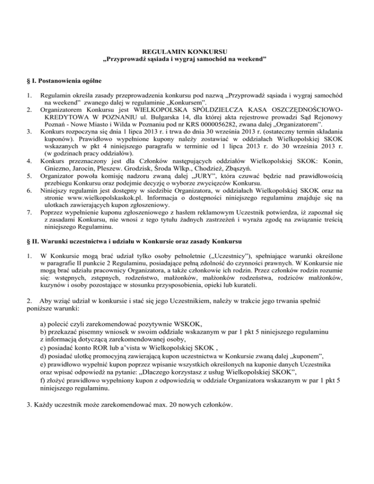 REGULAMIN KONKURSU „Przyprowadź sąsiada i wygraj samochód na weekend” § I. Postanowienia ogólne 1. 2. 3. 4. 5. 6. 7. Regulamin określa zasady przeprowadzenia konkursu pod nazwą „Przyprowadź sąsiada i wygraj samochód na weekend” zwanego dalej w regulaminie „Konkursem”. Organizatorem Konkursu jest WIELKOPOLSKA SPÓLDZIELCZA KASA OSZCZĘDNOŚCIOWOKREDYTOWA W POZNANIU ul. Bułgarska 14, dla której akta rejestrowe prowadzi Sąd Rejonowy Poznań - Nowe Miasto i Wilda w Poznaniu pod nr KRS 0000056282, zwana dalej „Organizatorem”. Konkurs rozpoczyna się dnia 1 lipca 2013 r. i trwa do dnia 30 września 2013 r. (ostateczny termin składania kuponów). Prawidłowo wypełnione kupony należy zostawiać w oddziałach Wielkopolskiej SKOK wskazanych w pkt 4 niniejszego paragrafu w terminie od 1 lipca 2013 r. do 30 września 2013 r. (w godzinach pracy oddziałów). Konkurs przeznaczony jest dla Członków następujących oddziałów Wielkopolskiej SKOK: Konin, Gniezno, Jarocin, Pleszew. Grodzisk, Środa Wlkp., Chodzież, Zbąszyń. Organizator powoła komisję nadzoru zwaną dalej „JURY”, która czuwać będzie nad prawidłowością przebiegu Konkursu oraz podejmie decyzję o wyborze zwycięzców Konkursu. Niniejszy regulamin jest dostępny w siedzibie Organizatora, w oddziałach Wielkopolskiej SKOK oraz na stronie www.wielkopolskaskok.pl. Informacja o dostępności niniejszego regulaminu znajduje się na ulotkach zawierających kupon zgłoszeniowy. Poprzez wypełnienie kuponu zgłoszeniowego z hasłem reklamowym Uczestnik potwierdza, iż zapoznał się z zasadami Konkursu, nie wnosi z tego tytułu żadnych zastrzeżeń i wyraża zgodę na związanie treścią niniejszego Regulaminu. § II. Warunki uczestnictwa i udziału w Konkursie oraz zasady Konkursu 1. W Konkursie mogą brać udział tylko osoby pełnoletnie („Uczestnicy”), spełniające warunki określone w paragrafie II punkcie 2 Regulaminu, posiadające pełną zdolność do czynności prawnych. W Konkursie nie mogą brać udziału pracownicy Organizatora, a także członkowie ich rodzin. Przez członków rodzin rozumie się: wstępnych, zstępnych, rodzeństwo, małżonków, małżonków rodzeństwa, rodziców małżonków, kuzynów i osoby pozostające w stosunku przysposobienia, opieki lub kurateli. 2. Aby wziąć udział w konkursie i stać się jego Uczestnikiem, należy w trakcie jego trwania spełnić poniższe warunki: a) polecić czyli zarekomendować pozytywnie WSKOK, b) przekazać pisemny wniosek w swoim oddziale wskazanym w par 1 pkt 5 niniejszego regulaminu z informacją dotyczącą zarekomendowanej osoby, c) posiadać konto ROR lub a’vista w Wielkopolskiej SKOK , d) posiadać ulotkę promocyjną zawierającą kupon uczestnictwa w Konkursie zwaną dalej „kuponem”, e) prawidłowo wypełnić kupon poprzez wpisanie wszystkich określonych na kuponie danych Uczestnika oraz wpisać odpowiedź na pytanie: „Dlaczego korzystasz z usług Wielkopolskiej SKOK”, f) złożyć prawidłowo wypełniony kupon z odpowiedzią w oddziale Organizatora wskazanym w par 1 pkt 5 niniejszego regulaminu. 3. Każdy uczestnik może zarekomendować max. 20 nowych członków. 4. Wnioski o zarekomendowanej osobie powinny być przekazane w oddziale wskazanym w paragrafie 1 pkt 4 niniejszego regulaminu Wielkopolskiej SKOK najpóźniej tego samego dnia roboczego, w którym zapisuje się nowy klient. W przeciwnym razie nie będą realizowane. 5. Poleceni członkowie muszą uiścić wszystkie opłaty związane z uzyskaniem członkostwa w Wielkopolskiej SKOK oraz: a) założyć konto ROR w Wielkopolskiej SKOK lub b) założyć konto a’vista w Wielkopolskiej SKOK oraz jednocześnie skorzystać z jakiegokolwiek innego produktu oferowanego przez Wielkopolską SKOK. § III. Rozstrzygnięcie Konkursu 1 . Zwycięzcę konkursu wybiera JURY. 2 . JURY w składzie 5 osób powołuje Organizator. 3 . JURY w terminie do dnia 15 października 2013 r. wybierze zwycięzców Konkursu biorąc pod uwagę: a) spełnienie przez Uczestnika warunków określonych w Regulaminie, b) względy artystyczne odpowiedzi, c) zgodność odpowiedzi z tematem i celem określonym w Regulaminie, d) oryginalność odpowiedzi, e) przydatność marketingową odpowiedzi. Kierując się zasadami opisanymi w niniejszym paragrafie JURY przyzna Uczestnikowi nagrodę w postaci wypożyczenia samochodu marki SKODA Citigo na jeden weekend. JURY nie przyzna nagrody określonej w niniejszym regulaminie Uczestnikowi, który polecił/ zarekomendował Wielkopolskiej SKOK tę samą osobę w ramach programu „przyprowadź Sąsiada” i otrzymał z tego tytułu przewidzianą w tym programie nagrodę. 4. Z posiedzenia JURY przyznającego nagrody sporządza się protokół. 5. W terminie 14 dni od dnia rozstrzygnięcia Konkursu Organizator powiadamia zwycięzcę o przyznaniu nagrody, terminie i sposobie jej odbioru. 6. Jeżeli zwycięzca został z Konkursu wykluczony, nie odebrał nagrody lub utracił prawo do nagrody, wówczas JURY nie ma obowiązku przyznania nagrody kolejnej osobie. Jednakże może to uczynić, jeżeli uzna to za możliwe i celowe. § IV. Nagrody 1 Nagrodę w konkursie stanowi wypożyczenie samochodu marki SKODA Citigo na jeden weekend – od piątku do poniedziałku (szczegóły dotyczące ubezpieczenia, godzin odbioru i zwrotu pojazdu oraz paliwa określa umową wypożyczalnia) w okresie od 20 października do 30 listopada. Konkretna data zostanie wskazana przez Wielkopolską SKOK. 2 Wyklucza się prawo do przeniesienia praw do nagrody na osobę trzecią (nie dotyczy małżonka zwycięzcy). 3 Warunkiem odebrania nagrody jest złożenie przez zwycięzcę zgodnego z prawdą oświadczenia, następującej treści: „Oświadczam, że odpowiedź na pytanie o treści „Dlaczego korzystasz z usług Wielkopolskiej SKOK” jest wynikiem mojej wyłącznej i własnej twórczości. Niniejszym przenoszę nieodpłatnie, bez prawa do wynagrodzenia na Wielkopolską Spółd