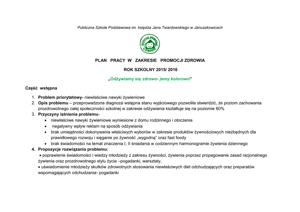 Publiczna Szkoła Podstawowa im. księdza Jana Twardowskiego w Januszkowicach PLAN PRACY W ZAKRESIE PROMOCJI ZDROWIA ROK SZKOLNY 2015/ 2016 „Odżywiamy się zdrowo- jemy kolorowo” Część wstępna 1. Problem priorytetowy- niewłaściwe nawyki żywieniowe 2. Opis problemu – przeprowadzona diagnoza wstępna stanu wyjściowego pozwoliła stwierdzić, że poziom zachowania prozdrowotnego całej społeczności szkolnej w zakresie odżywiania kształtuje się na poziomie 60% 3. Przyczyny istnienia problemu niewłaściwe nawyki żywieniowe wyniesione z domu rodzinnego i otoczenia negatywny wpływ reklam na sposób odżywiania brak umiejętności dokonywania właściwych wyborów w zakresie produktów żywnościowych niezbędnych dla prawidłowego rozwoju i sięganie po żywność „wygodną” oraz fast foody brak świadomości na temat znaczenia I, II śniadania w codziennym harmonogramie żywienia dziennego 4. Propozycje rozwiązania problemu: poprawienie świadomości i wiedzy młodzieży z zakresu żywności, żywienia poprzez propagowanie zasad racjonalnego żywienia oraz prozdrowotnego stylu życia –pogadanki, warsztaty, uświadomienie młodzieży skutków zdrowotnych stosowania niewłaściwych diet odchudzających oraz preparatów wspomagających odchudzania- pogadanki propagowanie informacji na temat nadwagi i otyłości wśród ludzi i ich skutkach, jakości zdrowotnej produktów spożywczych, oraz zapobiegania i zwalczania chorób na tle wadliwego żywienia, zaleceń dietetycznych dla osób zdrowych i chorych- warsztaty, pogadanki Przeprowadzanie pogadanek, konkursów na temat prawidłowego sposobu odżywianiaProwadzenie gazetki szkolnej Cel główny : podniesienie poziomu wiedzy wśród całej społeczności szkolnej. Kryterium sukcesu: co najmniej 80% uczniów znać będzie zasady zdrowego odżywiania, pojęcie zdrowej żywności, zasady kulturalnego zachowania się podczas spożywania posiłków, przekaże tę wiedzę swoim najbliższym co najmniej 80% dzieci świadomie wybierać będą zdrowe produkty żywnościowe (surówki, sałatki, owoce) oraz promować będą zdrowe odżywianie się Zadanie Kryterium Metody realizacji, Wykonaw Środki Monitoro Sposób sprawdzenia sukcesu terminy cy wanie, wykonania zadania termin, Co Jak Kto, osoba wskaże? sprawd kiedy zimy? sprawdz i? 1.Przygotowanie planu pracy na rok szkolny 2015/2016 Opracowany, zaakceptowany plan pracy Spotkania warsztatowe szkolnego zespołu ds. Promocji Zdrowia wrzesień 2015 Szkolny zespół promocji zdrowia Papier, pisaki D. Dawiec Wrzesień 2015 Opracowany plan Prezenta cja planu na Radzie Pedagogi cznej 2.Przekazanie informacji o zadaniach programu społeczności szkolnej. 100% społeczności szkolnej zna plan pracy szkoły w SzPZ zamieszczenie informacji o programie „Szkoła promująca zdrowie”, planu pracy oraz informacji o podejmowanych działaniach w szkolonym serwisie www Zespół ds. promocji zdrowia Papier, pisaki Komputer … K. Sowińska Strona www Prowadzeni e gazetki szkolnej Ekspozyc ja materiałó w na gazetce Jolanta Bula Dyrektor szkoły – zapoznaje się i akceptuje Wrzesień 2015 Wrzesień 2015 Danuta Dawiec 3.Propagowanie zasad racjonalnego żywienia oraz prozdrowotnego stylu życia, Co najmniej 80% społeczności szkolnej zna i stosuje zasady racjonalnego żywienia wrzesień 2015 *prowadzenie gazetki „Promocja zdrowia”, dostarczającej wiadomości na temat zdrowego odżywiania;cały rok *prelekcja dla rodziców na temat znaczenia śniadań dla dziecilistopad 2015 *dzień ziemniaka - pogadanki na lekcjach wychowawczych – pażdziernik 2015 *Dzień z jogurtem i kefirem- dla odporności i zdrowych kości grudzień 2015 * Dzień zdrowego śniadania – styczeń 2016 *prawidłowe żywienie i zasady układania jadłospisu dla dzieci i młodzieży –luty 2016 *Tęczowe dni- akcja polegająca na spożywaniu warzyw i owoców w wybranym kolorze , marzec 2016 *warsztaty dla dzieci- jem zdrowo Dzień Ziemi 2016 Zespół ds. promocji zdrowia Wychowawc y nauczyciele Materiały na ekspozycję Wypracowa ne materiały do realizacji zadań K.Sowińska Gazetka szkolna I.Kolonko Relacje na stronie szkolnej Zapisy w dziennikach Ekspozyc ja materiałó w na gazetch Publikacj e na szkolnej stronie www Zapisy w dziennika ch Cały rok szkolny , na bieżąco – Irena Sobala 4.Realizacja programów profilaktycznych propagujących zdrowy styl życia 100% uczniów uczestniczy w realizacji programów *konkurs szkolny prezentacji multimedialnej dla klas IV- VI„ Zdrowe odżywianie, konkurs plastyczny dla klas 0-III kwiecień2016 Programy:„Owoce w szkole”, „Szklanka mleka”, Śniadanie daje moc”, Mamo , tato wole wodę” Cały rok szkolny Justyna Szyler Na bieżąco Zapisy w dziennikach Lista uczniów, Zapisy w dzienniku Informacje na stronie www kontrola zapisów w dzienniku Lista uczniów z potwierdz eniem otrzyman ia mleka, owoców Sprawoz danie z programu „śniadani e daje moc na stronie www Sonia Kowolik Czerwiec 2016 Opracował zespół do spraw promocji zdrowia.