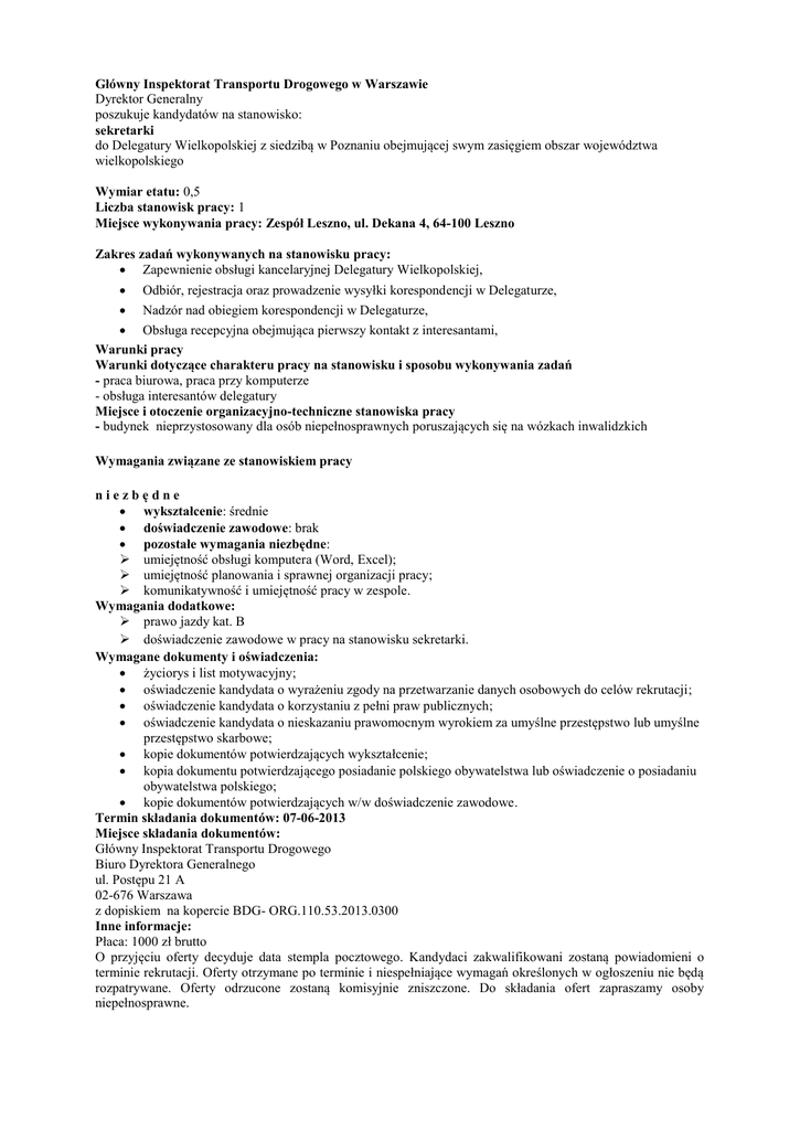 Główny Inspektorat Transportu Drogowego w Warszawie Dyrektor Generalny poszukuje kandydatów na stanowisko: sekretarki do Delegatury Wielkopolskiej z siedzibą w Poznaniu obejmującej swym zasięgiem obszar województwa wielkopolskiego Wymiar etatu: 0,5 Liczba stanowisk pracy: 1 Miejsce wykonywania pracy: Zespół Leszno, ul. Dekana 4, 64-100 Leszno Zakres zadań wykonywanych na stanowisku pracy: Zapewnienie obsługi kancelaryjnej Delegatury Wielkopolskiej, Odbiór, rejestracja oraz prowadzenie wysyłki korespondencji w Delegaturze, Nadzór nad obiegiem korespondencji w Delegaturze, Obsługa recepcyjna obejmująca pierwszy kontakt z interesantami, Warunki pracy Warunki dotyczące charakteru pracy na stanowisku i sposobu wykonywania zadań - praca biurowa, praca przy komputerze - obsługa interesantów delegatury Miejsce i otoczenie organizacyjno-techniczne stanowiska pracy - budynek nieprzystosowany dla osób niepełnosprawnych poruszających się na wózkach inwalidzkich Wymagania związane ze stanowiskiem pracy niezbędne wykształcenie: średnie doświadczenie zawodowe: brak pozostałe wymagania niezbędne: umiejętność obsługi komputera (Word, Excel); umiejętność planowania i sprawnej organizacji pracy; komunikatywność i umiejętność pracy w zespole. Wymagania dodatkowe: prawo jazdy kat. B doświadczenie zawodowe w pracy na stanowisku sekretarki. Wymagane dokumenty i oświadczenia: życiorys i list motywacyjny; oświadczenie kandydata o wyrażeniu zgody na przetwarzanie danych osobowych do celów rekrutacji; oświadczenie kandydata o korzystaniu z pełni praw publicznych; oświadczenie kandydata o nieskazaniu prawomocnym wyrokiem za umyślne przestępstwo lub umyślne przestępstwo skarbowe; kopie dokumentów potwierdzających wykształcenie; kopia dokumentu potwierdzającego posiadanie polskiego obywatelstwa lub oświadczenie o posiadaniu obywatelstwa polskiego; kopie dokumentów potwierdzających w/w doświadczenie zawodowe. Termin składania dokumentów: 07-06-2013 Miejsce składania dokumentów: Główny Inspektorat Transportu Drogowego Biuro Dyrektora Generalnego ul. Postępu 21 A 02-676 Warszawa z dopiskiem na kopercie BDG- ORG.110.53.2013.0300 Inne informacje: Płaca: 1000 zł brutto O przyjęciu oferty decyduje data stempla pocztowego. Kandydaci zakwalifikowani zostaną powiadomieni o terminie rekrutacji. Oferty otrzymane po terminie i niespełniające wymagań określonych w ogłoszeniu nie będą rozpatrywane. Oferty odrzucone zostaną komisyjnie zniszczone. Do składania ofert zapraszamy osoby niepełnosprawne.