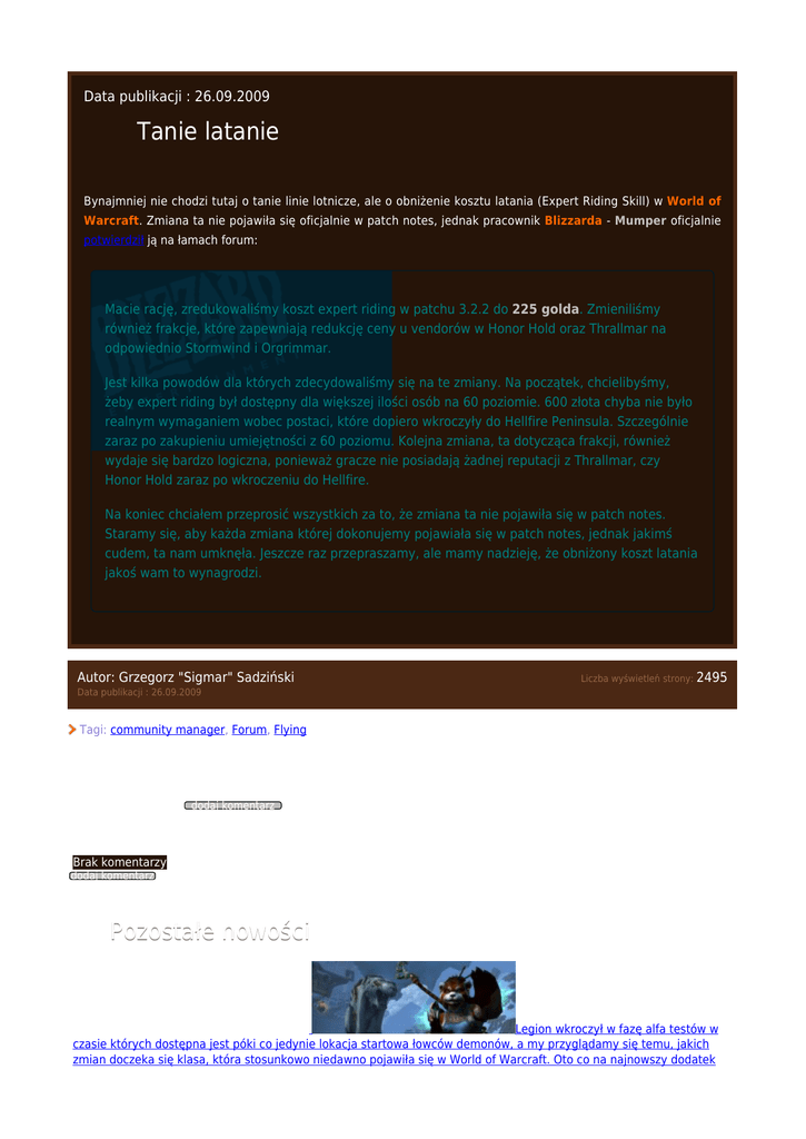Data publikacji : 26.09.2009 Tanie latanie Bynajmniej nie chodzi tutaj o tanie linie lotnicze, ale o obniżenie kosztu latania (Expert Riding Skill) w World of Warcraft. Zmiana ta nie pojawiła się oficjalnie w patch notes, jednak pracownik Blizzarda - Mumper oficjalnie potwierdził ją na łamach forum: Macie rację, zredukowaliśmy koszt expert riding w patchu 3.2.2 do 225 golda. Zmieniliśmy również frakcje, które zapewniają redukcję ceny u vendorów w Honor Hold oraz Thrallmar na odpowiednio Stormwind i Orgrimmar. Jest kilka powodów dla których zdecydowaliśmy się na te zmiany. Na początek, chcielibyśmy, żeby expert riding był dostępny dla większej ilości osób na 60 poziomie. 600 złota chyba nie było realnym wymaganiem wobec postaci, które dopiero wkroczyły do Hellfire Peninsula. Szczególnie zaraz po zakupieniu umiejętności z 60 poziomu. Kolejna zmiana, ta dotycząca frakcji, również wydaje się bardzo logiczna, ponieważ gracze nie posiadają żadnej reputacji z Thrallmar, czy Honor Hold zaraz po wkroczeniu do Hellfire. Na koniec chciałem przeprosić wszystkich za to, że zmiana ta nie pojawiła się w patch notes. Staramy się, aby każda zmiana której dokonujemy pojawiała się w patch notes, jednak jakimś cudem, ta nam umknęła. Jeszcze raz przepraszamy, ale mamy nadzieję, że obniżony koszt latania jakoś wam to wynagrodzi. Autor: Grzegorz "Sigmar" Sadziński Liczba wyświetleń strony: 2495 Data publikacji : 26.09.2009 Tagi: community manager, Forum, Flying Komentarz (0) dodaj komentarz Brak komentarzy dodaj komentarz Pozostałe nowości Zapowiedź zmian w klasach - Mnich Legion wkroczył w fazę alfa testów w czasie których dostępna jest póki co jedynie lokacja startowa łowców demonów, a my przyglądamy się temu, jakich zmian doczeka się klasa, która stosunkowo niedawno pojawiła się w World of Warcraft. Oto co na najnowszy dodatek Blizzard przygotował dla mnichów.Data publikacji: 24.11.20150 Zapowiedź zmian w klasach - Wojownik Po krótkiej przerwie wracamy z tłumaczeniami blogów poświęconych zmianom, jakie pojawią się w klasach w nadchodzącym dodatku do World of Warcraft. Oto czego powinni spodziewać się wojownicy z Azeroth w LegionieData publikacji: 23.11.20150 Zapowiedź zmian w klasach - Szaman Kolejna zapowiedzieć, która pojawiła się jakiś czas temu na łamach oficjalnej strony społecznościowej dotyczy szamana. Największe zmiany w przypadku tej klasy dotknęły totemy oraz system zasobów specjalizacji Elemental oraz EnhancementData publikacji: 16.11.20150 11 urodziny World of Warcraft World of Warcraft obchodzi już swoje 11 urodziny. Z tej okazji Blizzard przygotował kilka zabawek, które powinny wszystkim przypomnieć sam początek przygody w świecie Azeroth - w rolach głównych Edwin VanCleef, Hogger, murlok oraz Windfury (w wersji nadmuchiwanej).Data publikacji: 16.11.20150 Zapowiedź zmian w klasach - Rycerz śmierci Kolejna zapowiedź opublikowana na łamach oficjalnej strony społecznościowej World of Warcraft poświęcona jest klasie rycerzy śmierci. Poniżej znajdziecie informacje między innymi o ujednoliceniu wszystkich run oraz nowej umiejętności specjalizacji Blood, która została zainspirowana Lordem Marrowgarem z Icecrown Citadel.Data publikacji: 15.11.20150 Wszystkie nowości