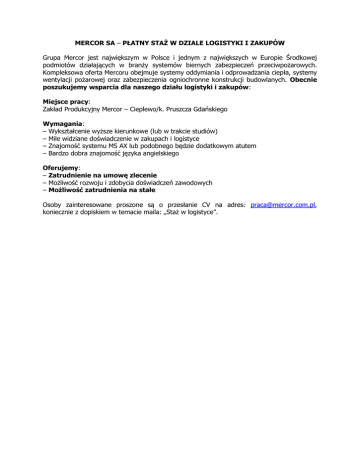 MERCOR SA – PŁATNY STAŻ W DZIALE LOGISTYKI I ZAKUPÓW Grupa Mercor jest największym w Polsce i jednym z największych w Europie Środkowej podmiotów działających w branży systemów biernych zabezpieczeń przeciwpożarowych. Kompleksowa oferta Mercoru obejmuje systemy oddymiania i odprowadzania ciepła, systemy wentylacji pożarowej oraz zabezpieczenia ogniochronne konstrukcji budowlanych. Obecnie poszukujemy wsparcia dla naszego działu logistyki i zakupów: Miejsce pracy: Zakład Produkcyjny Mercor – Cieplewo/k. Pruszcza Gdańskiego Wymagania: – Wykształcenie wyższe kierunkowe (lub w trakcie studiów) – Mile widziane doświadczenie w zakupach i logistyce – Znajomość systemu MS AX lub podobnego będzie dodatkowym atutem – Bardzo dobra znajomość języka angielskiego Oferujemy: – Zatrudnienie na umowę zlecenie – Możliwość rozwoju i zdobycia doświadczeń zawodowych – Możliwość zatrudnienia na stałe Osoby zainteresowane proszone są o przesłanie CV na adres: [email protected], koniecznie z dopiskiem w temacie maila: „Staż w logistyce”.