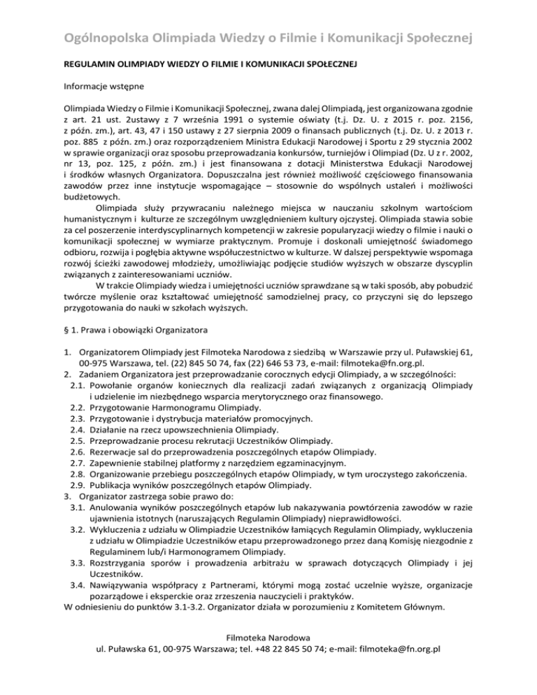 Ogólnopolska Olimpiada Wiedzy o Filmie i Komunikacji Społecznej REGULAMIN OLIMPIADY WIEDZY O FILMIE I KOMUNIKACJI SPOŁECZNEJ Informacje wstępne Olimpiada Wiedzy o Filmie i Komunikacji Społecznej, zwana dalej Olimpiadą, jest organizowana zgodnie z art. 21 ust. 2ustawy z 7 września 1991 o systemie oświaty (t.j. Dz. U. z 2015 r. poz. 2156, z późn. zm.), art. 43, 47 i 150 ustawy z 27 sierpnia 2009 o finansach publicznych (t.j. Dz. U. z 2013 r. poz. 885 z późn. zm.) oraz rozporządzeniem Ministra Edukacji Narodowej i Sportu z 29 stycznia 2002 w sprawie organizacji oraz sposobu przeprowadzania konkursów, turniejów i Olimpiad (Dz. U z r. 2002, nr 13, poz. 125, z późn. zm.) i jest finansowana z dotacji Ministerstwa Edukacji Narodowej i środków własnych Organizatora. Dopuszczalna jest również możliwość częściowego finansowania zawodów przez inne instytucje wspomagające – stosownie do wspólnych ustaleń i możliwości budżetowych. Olimpiada służy przywracaniu należnego miejsca w nauczaniu szkolnym wartościom humanistycznym i kulturze ze szczególnym uwzględnieniem kultury ojczystej. Olimpiada stawia sobie za cel poszerzenie interdyscyplinarnych kompetencji w zakresie popularyzacji wiedzy o filmie i nauki o komunikacji społecznej w wymiarze praktycznym. Promuje i doskonali umiejętność świadomego odbioru, rozwija i pogłębia aktywne współuczestnictwo w kulturze. W dalszej perspektywie wspomaga rozwój ścieżki zawodowej młodzieży, umożliwiając podjęcie studiów wyższych w obszarze dyscyplin związanych z zainteresowaniami uczniów. W trakcie Olimpiady wiedza i umiejętności uczniów sprawdzane są w taki sposób, aby pobudzić twórcze myślenie oraz kształtować umiejętność samodzielnej pracy, co przyczyni się do lepszego przygotowania do nauki w szkołach wyższych. § 1. Prawa i obowiązki Organizatora 1. Organizatorem Olimpiady jest Filmoteka Narodowa z siedzibą w Warszawie przy ul. Puławskiej 61, 00-975 Warszawa, tel. (22) 845 50 74, fax (22) 646 53 73, e-mail: [email protected]. 2. Zadaniem Organizatora jest przeprowadzanie corocznych edycji Olimpiady, a w szczególności: 2.1. Powołanie organów koniecznych dla realizacji zadań związanych z organizacją Olimpiady i udzielenie im niezbędnego wsparcia merytorycznego oraz finansowego. 2.2. Przygotowanie Harmonogramu Olimpiady. 2.3. Przygotowanie i dystrybucja materiałów promocyjnych. 2.4. Działanie na rzecz upowszechnienia Olimpiady. 2.5. Przeprowadzanie procesu rekrutacji Uczestników Olimpiady. 2.6. Rezerwacje sal do przeprowadzenia poszczególnych etapów Olimpiady. 2.7. Zapewnienie stabilnej platformy z narzędziem egzaminacyjnym. 2.8. Organizowanie przebiegu poszczególnych etapów Olimpiady, w tym uroczystego zakończenia. 2.9. Publikacja wyników poszczególnych etapów Olimpiady. 3. Organizator zastrzega sobie prawo do: 3.1. Anulowania wyników poszczególnych etapów lub nakazywania powtórzenia zawodów w razie ujawnienia istotnych (naruszających Regulamin Olimpiady) nieprawidłowości. 3.2. Wykluczenia z udziału w Olimpiadzie Uczestników łamiących Regulamin Olimpiady, wykluczenia z udziału w Olimpiadzie Uczestników etapu przeprowadzonego przez daną Komisję niezgodnie z Regulaminem lub/i Harmonogramem Olimpiady. 3.3. Rozstrzygania sporów i prowadzenia arbitrażu w sprawach dotyczących Olimpiady i jej Uczestników. 3.4. Nawiązywania współpracy z Partnerami, którymi mogą zostać uczelnie wyższe, organizacje pozarządowe i eksperckie oraz zrzeszenia nauczycieli i praktyków. W odniesieniu do punktów 3.1-3.2. Organizator działa w porozumieniu z Komitetem Głównym. Filmoteka Narodowa ul. Puławska 61, 00-975 Warszawa; tel. +48 22 845 50 74; e-mail: [email protected] Ogólnopolska Olimpiada Wiedzy o Filmie i Komunikacji Społecznej § 2. Struktura organizacyjna Olimpiady 1. Organizator. 1.1. Sprawami organizacyjnymi Olimpiady zajmuje się – we współpracy z Prezydium Komitetu Głównego – powołany przez Organizatora, Koordynator. Sprawami administracyjnofinansowymi zajmuje się księgowy oraz pracownicy administracyjni. 1.2. Organizator, we współpracy z Komitetem Głównym, przed rozpoczęciem każdej kolejnej edycji Olimpiady, publikuje na stronie internetowej Olimpiady „Informator o Olimpiadzie Wiedzy o Filmie i Komunikacji Społecznej” zawierający m.in. Program, Harmonogram, Regulamin oraz szczegółowe wytyczne związane z jej organizacją, wykaz filmów i literatury zalecanej w przygotowaniach do zawodów wszystkich stopni. 2. Komitet Główny. 2.1. Komitet Główny jest powoływany przez Organizatora. (Załącznik nr 1a). 2.2. Komitet Główny ma siedzibę w siedzibie Organizatora i korzysta ze wszystkich adresów kontaktowych podanych w §1 pkt. 1 Regulaminu. 2.3. W skład Komitetu Głównego Olimpiady wchodzą: przedstawiciele Organizatora, nauczyciele akademiccy uniwersytetów, nauczyciele szkół ponadgimnazjalnych, powołani przez Organizatora. Są to wybitni znawcy dziedzin objętych programem Olimpiady. 2.4. Realizacją bieżących prac Komitetu Głównego zajmuje się Prezydium Komitetu Głównego, składające się z Przewodniczącego, Wiceprzewodniczącego i Sekretarza naukowego. Prezydium Komitetu Głównego powołuje Komitet Główny. (Załącznik nr 1b). 2.5. Komitet Główny Olimpiady: 2.5.1. Opracowuje i przedstawia Organizatorowi program Olimpiady oraz zmiany w tym dokumencie, jest odpowiedzialny za poziom merytoryczny Olimpiady. 2.5.2. Przygotowuje i zatwierdza zestawy zadań wszystkich etapów zawodów wraz z zasadami ich jednolitej oceny; przekazuje je Komisjom przeprowadzającym zawody w sposób uniemożliwiający ich nieuprawnione ujawnienie do chwili rozpoczęcia zawodów. 2.5.3. Opracowuje wykaz zalecanej filmografii i literatury na poszczególne etapy Olimpiady. 2.5.4. Powołuje Komisje przeprowadzające i sprawdzające prace z zawodów II i III stopnia. 2.5.5. Przyznaje tytuł Laureata lub Finalisty w zależnośc