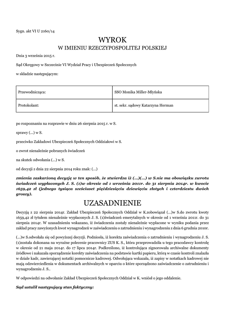 Sygn. akt VI U 2160/14 WYROK W IMIENIU RZECZYPOSPOLITEJ POLSKIEJ Dnia 3 września 2015 r. Sąd Okręgowy w Szczecinie VI Wydział Pracy i Ubezpieczeń Społecznych w składzie następującym: Przewodnicząca: SSO Monika Miller-Młyńska Protokolant: st. sekr. sądowy Katarzyna Herman po rozpoznaniu na rozprawie w dniu 26 sierpnia 2015 r. w S. sprawy (...) w S. przeciwko Zakładowi Ubezpieczeń Społecznych Oddziałowi w S. o zwrot nienależnie pobranych świadczeń na skutek odwołania (...) w S. od decyzji z dnia 22 sierpnia 2014 roku znak: (...) zmienia zaskarżoną decyzję w ten sposób, że stwierdza iż (...)(...) w S.nie ma obowiązku zwrotu świadczeń wypłaconych J. S. (1)w okresie od 1 września 2011r. do 31 sierpnia 2014r. w kwocie 1659,42 zł (jednego tysiąca sześciuset pięćdziesięciu dziewięciu złotych i czterdziestu dwóch groszy). UZASADNIENIE Decyzją z 22 sierpnia 2014r. Zakład Ubezpieczeń Społecznych Oddział w K.zobowiązał (...)w S.do zwrotu kwoty 1659,42 zł tytułem nienależnie wypłaconych J. S. (1)świadczeń emerytalnych w okresie od 1 września 2011r. do 31 sierpnia 2014r. W uzasadnieniu wskazano, iż świadczenia zostały nienależnie wypłacone w wyniku podania przez zakład pracy zawyżonych kwot wynagrodzeń w zaświadczeniu o zatrudnieniu i wynagrodzeniu z dnia 6 grudnia 2010r. (...)w S.odwołała się od powyższej decyzji. Podniosła, iż korekta zaświadczenia o zatrudnieniu i wynagrodzeniu J. S. (1)została dokonana na wyraźne polecenie pracownicy ZUS K. S., która przeprowadziła u tego pracodawcy kontrolę w okresie od 21 maja 2014r. do 17 lipca 2014r. Podkreślono, iż kontrolująca zignorowała archiwalne dokumenty źródłowe i nakazała sporządzenie korekty zaświadczenia na podstawie kartki papieru, którą w czasie kontroli znalazła w dziale kadr, zawierającej notatki pomocnicze kadrowej. Odwołująca wskazała, iż zapisy w notatkach kadrowej nie mają odzwierciedlenia w dokumentach archiwalnych w oparciu o które sporządzono zaświadczenie o zatrudnieniu i wynagrodzeniu J. S.. W odpowiedzi na odwołanie Zakład Ubezpieczeń Społecznych Oddział w K. wniósł o jego oddalenie. Sąd ustalił następujący stan faktyczny: J. S.w okresie od 16 października 1971r. do 9 marca 1973r. był zatrudniony na podstawie umowy o pracę w (...)we W., wykonując pracę zastępcy komendanta w Hufcu (...)w L.. Od dnia 10 marca 1973r. przeszedł – na mocy porozumienia między zakładami pracy – do pracy w (...)w K.jako komendant hufca stacjonarnego. Pracę w tym charakterze wykonywał do 31 grudnia 1977 roku. W okresie od 1 stycznia 1978r. do 15 października 1980r. J. S.był zatrudniony u tego samego pracodawcy, tyle że na innym stanowisku. Bezsporne, a nadto dowody: - świadectwa pracy i zaświadczenie o zatrudnieniu – k. 14-16 w pliku I akt ZUS O/K. dot. J. S. (1); - dokumenty w aktach osobowych J. S. – k. 122 akt sądowych. Do przeniesienia J. S.z L.doszło na prośbę zainteresowanego. Faktyczną datą rozpoczęcia przez niego pracy na obszarze podległym ówczesnej (...)w K.był 11 marca 1973r. J. S.został wówczas zatrudniony na stanowisku Komendanta (...) w J., z wynagrodzeniem miesięcznym w wysokości 2000 zł (pobory zasadnicze) plus dodatek kwartalny w wysokości 1000 zł oraz dodatek specjalny, stanowiący ruchomą część uposażenia. W pierwszym okresie zatrudnienia wysokość dodatku określono na kwotę 1000 zł miesięcznie, w późniejszym jego wysokość wzrosła – od 1 stycznia 1974r. do kwoty 1300 zł miesięcznie, by od 1 sierpnia 1974r. zmaleć do 900 zł miesięcznie. Od 1 sierpnia 1974r. wynagrodzenie zasadnicze J. S.wynosiło 3300 złotych miesięcznie. Od 1 października 1974r. J. S.został przeniesiony na stanowiska komendanta (...) w K.. Dowód: dokumenty w aktach osobowych J. S. – k. 122 akt sprawy. W prowadzonych przez Komendę (...) w K.kartotekach płacowych dot. J. S.wskazano, że otrzymał on zarobki w następujących kwotach: - w roku 1973: w marcu, kwietniu, maju, lipcu i sierpniu – po 3000 zł, w tym 2.000 zł wynagrodzenia zasadniczego i 1000 zł dodatku funkcyjnego/służbowego; w czerwcu i wrześniu – po 4000 zł, w tym 2.000 zł wynagrodzenia zasadniczego, 1000 zł dodatku funkcyjnego/służbowego oraz 1000 zł z innego tytułu; w październiku i listopadzie po 4300 zł, w tym 2000 zł wynagrodzenia zasadniczego oraz 1300 zł dodatku funkcyjnego/służbowego; w grudniu – 4300 zł, w tym 2.000 zł wynagrodzenia zasadniczego, 1300 zł dodatku funkcyjnego/służbowego oraz 1000 zł z innego tytułu. Dodatkowo na karcie odnotowano wypłatę we wrześniu kwoty 3100 zł z tytułu „nagrody” oraz w grudniu kwoty 864 zł. - w roku 1974: w styczniu, lutym, marcu, maju, czerwcu, sierpniu, wrześniu, październiku i listopadzie – po 3300 zł, w tym 2000 zł wynagrodzenia zasadniczego oraz 1300 zł dodatku funkcyjnego/służbowego; w kwietniu, lipcu i grudniu – po 4300 zł, w tym 2.000 zł wynagrodzenia zasadniczego, 1300 zł dodatku funkcyjnego/służbowego oraz 1000 zł z innego tytułu. Dodatkowo na karcie odnotowano dokonanie we wrześniu wypłaty dodatkowej kwoty 2500 zł; - w roku 1975: w styczniu, lutym i marcu – po 2900 zł, w tym 2000 zł wynagrodzenia zasadniczego oraz 900 zł dodatku służbowego; w kwietniu – 3200 zł, w tym 2300 zł wynagrodzenia zasadniczego oraz 900 zł dodatku służbowego; w maju – 3800 zł, w tym 2900 zł wynagrodzenia zasadniczego i 900 zł dodatku służbowego; w okresie od czerwca do grudnia – po 4200 zł, w tym 3300 zł wynagrodzenia zasadniczego i 900 zł dodatku służbowego. Dowody: karty wynagrodzeń – k. 127 akt sądowych. Wysokość ekwiwalentu za umundurowanie służbowe dla kadry komend (...) wynosiła: w latach 1973 i 1974 – po 432 zł miesięcznie; w roku 1975 – po 547 złotych miesięcznie. Dowód: informacja wicedyrektora Biura ds. administracyjno-inwestycyjnych (...)– k. 98 akt sądowych. Decyzją z 25 października 20