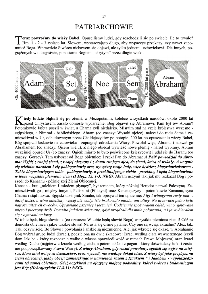 37 PATRIARCHOWIE T eraz powróćmy do wieży Babel. Opuściliśmy ludzi, gdy rozchodzili się po świecie. Ile to trwało? Hm. 1 - 2 - 3 tysiące lat. Słowem, wystarczająco długo, aby wypaczyć przekazy, czy nawet zapomnieć Boga. Wprawdzie Stwórca niebawem się objawi, ale tylko jednemu człowiekowi. Dla innych, pogrążonych w odstępstwie, pozostanie Bogiem „ukrytym” przez długie wieki. K iedy ludzie błąkali się po ziemi, w Mezopotamii, kolebce wszystkich narodów, około 2000 lat przed Chrystusem, zaszło doniosłe wydarzenie. Bóg objawił się Abramowi. Kim był ów Abram? Potomkowie Jafeta poszli w świat, a Chama żyli niedaleko. Misraim stał na czele królestwa wczesno egipskiego, a Nimrod - babilońskiego. Abram (co znaczy: Wysoki ojciec), należał do rodu Sema i zamieszkiwał w Ur, odbudowanym przez Chaldejczyków po potopie. 200 lat po opuszczeniu wieży Babel, Bóg spojrzał łaskawie na człowieka - zapragnął odrodzenia Wiary. Powołał więc, Abrama i nazwał go Abrahamem (co znaczy: Ojcem wielu). Z niego obiecał wywieźć nowe plemię - naród wybrany. Abram wcześniej opuścił Ur (co znaczy: Ogień; miasto to było poświęcone księżycowi) i udał się do Haranu (co znaczy: Gorący). Tam usłyszał od Boga obietnicę: I rzekł Pan do Abrama: A PAN powiedział do Abrama: Wyjdź z twojej ziemi, z twojej ojczyzny i z domu twojego ojca, do ziemi, którą ci wskażę. A uczynię cię wielkim narodem i cię pobłogosławię oraz wywyższę twoje imię, więc będziesz błogosławieństwem . Także błogosławiącym tobie - pobłogosławię, a przeklinającego ciebie - przeklnę, i będą błogosławione w tobie wszystkie plemiona ziemi (I Mojż. 12, 1-3; NBG). Abram uczynił tak, jak mu rozkazał Bóg i poszedł do Kanaanu - późniejszej Ziemi Obiecanej. Kanaan - kraj „mlekiem i miodem płynący”, był terenem, który później Herodot nazwał Palestyną. Zamieszkiwali go , między innymi, Pelisztini (Filistyni) oraz Kananejczycy - potomkowie Kanaana, syna Chama i stąd nazwa. Egipski dostojnik Sinuhe, tak opisywał ten tą ziemię: Figi i winogrona rosły tam w dużej ilości, a wina mieliśmy więcej niż wody. Nie brakowało miodu, ani oliwy. Na drzewach pełno było najrozmaitszych owoców. Uprawiano pszenicę i jęczmień. Codziennie spożywałem chleb, wino, gotowane mięso i pieczony drób. Ponadto jadałem dziczyznę, gdyż urządzali dla mnie polowania; a i ja wybierałem się z ogarami na łowy. W tobie będą błogosławione (co oznacza: W tobie będą sławić Boga) wszystkie plemiona ziemi! Cóż za doniosła obietnica i jakie ważkie słowa! Na usta się ciśnie pytanie: Czy one są wciąż aktualne? Ależ, tak. Tak, oczywiście. Bo Słowo i powołania Pańskie są niezmienne. Ale, jak wkrótce się okaże, w Abrahamie Bóg wybrał grupę ludzi (Izrael), podzieloną na dwie składowe: Izrael według ciała wewnętrznego (czyli dom Jakuba - który rozpocznie walkę o własną sprawiedliwość w ramach Prawa Mojżesza) oraz Izrael według Ducha (najpierw z Izraela według ciała, a potem także i z pogan - który doświadczy łaski i zostanie podporządkowany Prawu Wiary). Z wiary Abraham, gdy został powołany, zgodził się wyjść na miejsce, które miał wziąć za dziedzictwo, oraz wyszedł, nie wiedząc dokąd idzie. Z wiary był jako przybysz na ziemi obiecanej, jakby obcej; zamieszkując w namiotach razem z Izaakiem * i Jakóbem - współdziedzicami tej samej obietnicy. Gdyż oczekiwał na ojczyznę mającą podwaliny, której twórcą i budowniczym jest Bóg (Hebrajczyków 11,8-11; NBG).