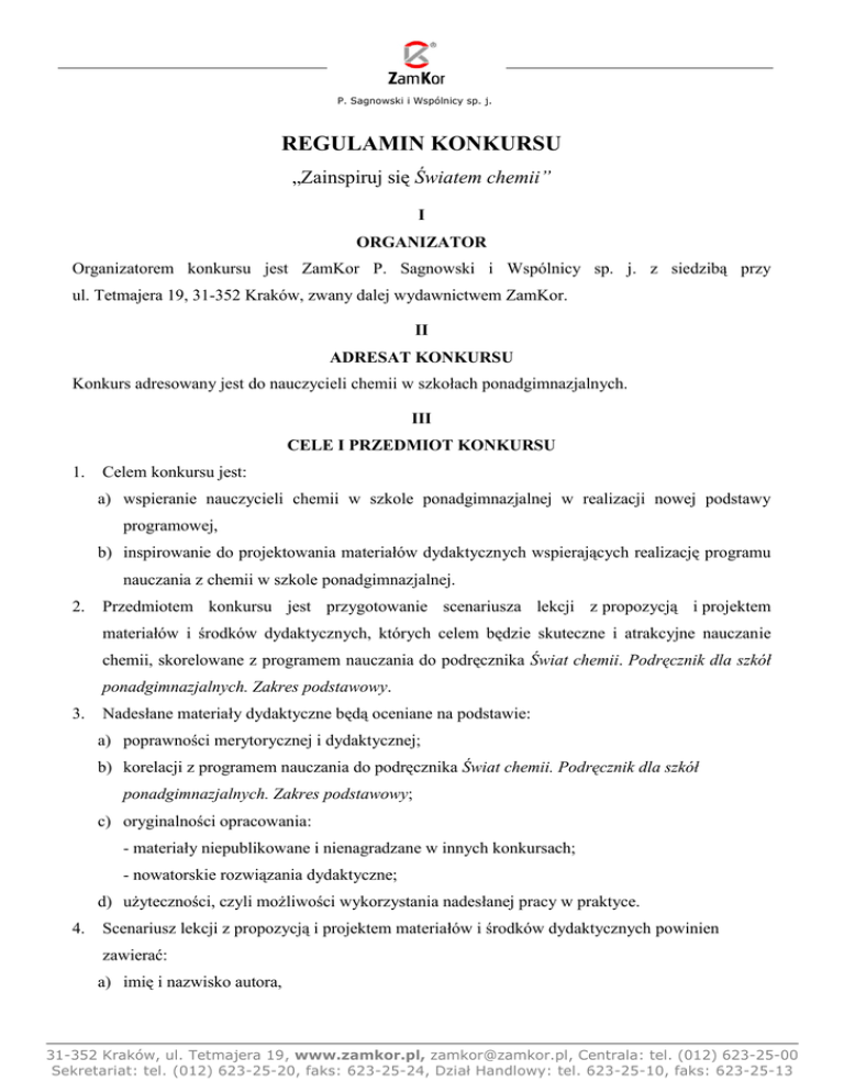 P. Sagnowski i Wspólnicy sp. j. REGULAMIN KONKURSU „Zainspiruj się Światem chemii” I ORGANIZATOR Organizatorem konkursu jest ZamKor P. Sagnowski i Wspólnicy sp. j. z siedzibą przy ul. Tetmajera 19, 31-352 Kraków, zwany dalej wydawnictwem ZamKor. II ADRESAT KONKURSU Konkurs adresowany jest do nauczycieli chemii w szkołach ponadgimnazjalnych. III CELE I PRZEDMIOT KONKURSU 1. Celem konkursu jest: a) wspieranie nauczycieli chemii w szkole ponadgimnazjalnej w realizacji nowej podstawy programowej, b) inspirowanie do projektowania materiałów dydaktycznych wspierających realizację programu nauczania z chemii w szkole ponadgimnazjalnej. 2. Przedmiotem konkursu jest przygotowanie scenariusza lekcji z propozycją i projektem materiałów i środków dydaktycznych, których celem będzie skuteczne i atrakcyjne nauczanie chemii, skorelowane z programem nauczania do podręcznika Świat chemii. Podręcznik dla szkół ponadgimnazjalnych. Zakres podstawowy. 3. Nadesłane materiały dydaktyczne będą oceniane na podstawie: a) poprawności merytorycznej i dydaktycznej; b) korelacji z programem nauczania do podręcznika Świat chemii. Podręcznik dla szkół ponadgimnazjalnych. Zakres podstawowy; c) oryginalności opracowania: - materiały niepublikowane i nienagradzane w innych konkursach; - nowatorskie rozwiązania dydaktyczne; d) użyteczności, czyli możliwości wykorzystania nadesłanej pracy w praktyce. 4. Scenariusz lekcji z propozycją i projektem materiałów i środków dydaktycznych powinien zawierać: a) imię i nazwisko autora, 31-352 Kraków, ul. Tetmajera 19, www.zamkor.pl, [email protected], Centrala: tel. (012) 623-25-00 Sekretariat: tel. (012) 623-25-20, faks: 623-25-24, Dział Handlowy: tel. 623-25-10, faks: 623-25-13 P. Sagnowski i Wspólnicy sp. j. b) czas trwania zajęć, c) zakres materiału opisany za pomocą celów operacyjnych, d) materiały dla nauczyciela, e) materiały dla ucznia (karty pracy), f) propozycje materiałów i środków dydaktycznych, g) bibliografię. IV STRUKTURA I PRZEBIEG KONKURSU 1. Konkurs jest jednoetapowy i ma zasięg ogólnopolski. 2. Harmonogram konkursu: a) Zainteresowani nauczyciele opracowują materiały dydaktyczne. b) Zgłoszone prace konkursowe powinny być przygotowane indywidualnie. c) Prace konkursowe należy przesłać na adres wydawnictwa ZamKor w dwóch wersjach: - papierowej (wraz z uzupełnionym załącznikiem nr 1) – na adres organizatora, z dopiskiem KONKURS; - elektronicznej – w formie pliku: .doc, .docx, .pps – na adres: [email protected]. d) Nadesłane materiały oceniane będą przez Komisję konkursową, w której skład wejdą: nauczyciel praktyk, przedstawiciele Zakładu Dydaktyki Wydziału Chemii Uniwersytetu Jagiellońskiego, przedstawiciele wydawnictwa ZamKor i zespołu autorskiego pakietu Świat chemii. e) Wyłonienie najlepszego scenariusza lekcji z propozycją i projektem materiałów i środków dydaktycznych. f) Wyłonienie prac wyróżnionych i ich publikacja w serwisie chemia.zamkor.pl. V TERMINARZ 1. Konkurs trwa od 2 maja do 29 czerwca 2012 roku. 2. Prace konkursowe należy przesłać na adres wydawnictwa ZamKor do dnia 15 czerwca 2012 roku (decyduje data doręczenia). 3. Wyniki konkursu zostaną ogłoszone w serwisie chemia.zamkor.pl w dniu 29 czerwca 2012 roku. Z laureatami organizator skontaktuje się telefonicznie przed upływem powyższego terminu. 31-352 Kraków, ul. Tetmajera 19, www.zamkor.pl, [email protected], Centrala: tel. (012) 623-25-00 Sekretariat: tel. (012) 623-25-20, faks: 623-25-24, Dział Handlowy: tel. 623-25-10, faks: 623-25-13 P. Sagnowski i Wspólnicy sp. j. VI NAGRODY 1. Autor najwyżej ocenionej pracy konkursowej zostanie nagrodzony bezpłatnym udziałem w tegorocznej Letniej Szkole Chemii w Stryszawie organizowanej przez wydawnictwo ZamKor o wartości 800 zł. Letnia Szkoła Chemii odbędzie się od 23 do 27 lipca 2012 roku. 2. Autorzy wyróżnionych prac konkursowych otrzymają propozycję opublikowania ich w serwisie chemia.zamkor.pl za wynagrodzeniem. VII POSTANOWIENIA KOŃCOWE 1. Wyniki konkursu ogłoszone przez organizatora są ostateczne. 2. Nadesłane prace konkursowe pozostaną własnością organizatorów i nie będą odsyłane autorom. 3. Autorzy prac konkursowych zobowiązani są do przestrzegania ustawy z dnia 4 lutego 1994 roku o prawie autorskim i prawach pokrewnych (Dz.U. z 2006 r., Nr 90 poz. 631 z późn. zm.). ZAŁĄCZNIKI Załącznik nr 1: Oświadczenie autora pracy konkursowej 31-352 Kraków, ul. Tetmajera 19, www.zamkor.pl, [email protected], Centrala: tel. (012) 623-25-00 Sekretariat: tel. (012) 623-25-20, faks: 623-25-24, Dział Handlowy: tel. 623-25-10, faks: 623-25-13 P. Sagnowski i Wspólnicy sp. j. Załącznik nr 1 Oświadczenie autora pracy konkursowej ................................................. Imię i nazwisko Autora ......................................... Miejscowość, data .................................................. Adres do korespondencji .................................................. Numer telefonu .................................................. Adres e-mail ................................................................................................................................................... ................................................................................................................................................... Tytuł publikacji 1. Oświadczam, że do utworu zgłaszanego do Konkursu „Zainspiruj się Światem chemii” organizowanego przez ZamKor P. Sagnowski i Wspólnicy sp. j. przysługują mi autorskie prawa majątkowe oraz że prawa te nie są ograniczone w żadnym zakresie. 2. Oświadczam, że zapoznałem się z treścią regulaminu konkursu „Zainspiruj się Światem chemii” i akceptuję zawarte w nim warunki. 3. Na warunkach określonych w ustawie z dnia 29 sierpnia 1997 r. o ochronie danych osobowych (Dz.U. Nr 133 poz. 833, z późn. zm.) oświadczam, że wyrażam z