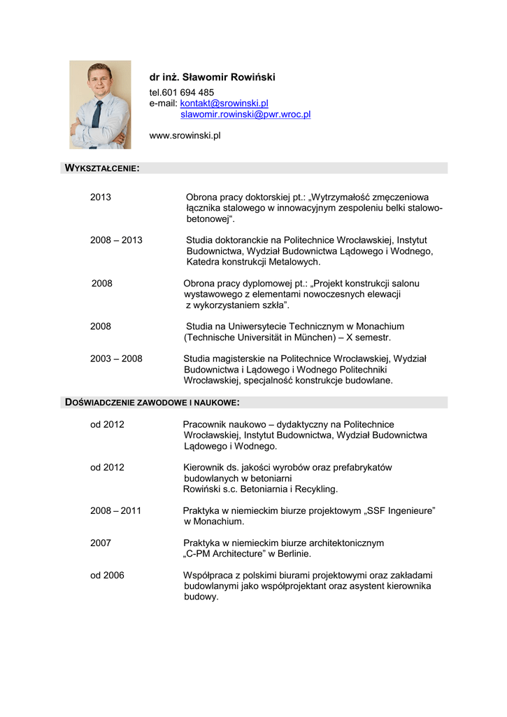 dr inż. Sławomir Rowiński tel.601 694 485 e-mail: [email protected] [email protected] www.srowinski.pl WYKSZTAŁCENIE: 2013 Obrona pracy doktorskiej pt.: „Wytrzymałość zmęczeniowa łącznika stalowego w innowacyjnym zespoleniu belki stalowobetonowej“. 2008 – 2013 Studia doktoranckie na Politechnice Wrocławskiej, Instytut Budownictwa, Wydział Budownictwa Lądowego i Wodnego, Katedra konstrukcji Metalowych. 2008 Obrona pracy dyplomowej pt.: „Projekt konstrukcji salonu wystawowego z elementami nowoczesnych elewacji z wykorzystaniem szkła”. 2008 Studia na Uniwersytecie Technicznym w Monachium (Technische Universität in München) – X semestr. 2003 – 2008 Studia magisterskie na Politechnice Wrocławskiej, Wydział Budownictwa i Lądowego i Wodnego Politechniki Wrocławskiej, specjalność konstrukcje budowlane. DOŚWIADCZENIE ZAWODOWE I NAUKOWE: od 2012 Pracownik naukowo – dydaktyczny na Politechnice Wrocławskiej, Instytut Budownictwa, Wydział Budownictwa Lądowego i Wodnego. od 2012 Kierownik ds. jakości wyrobów oraz prefabrykatów budowlanych w betoniarni Rowiński s.c. Betoniarnia i Recykling. 2008 – 2011 Praktyka w niemieckim biurze projektowym „SSF Ingenieure” w Monachium. 2007 Praktyka w niemieckim biurze architektonicznym „C-PM Architecture” w Berlinie. od 2006 Współpraca z polskimi biurami projektowymi oraz zakładami budowlanymi jako współprojektant oraz asystent kierownika budowy. CZŁONKOSTWO W ORGANIZACJACH ZAWODOWYCH: od 2012 Członek Młodej Kadry PZITB oddział Wrocław. 2008 – 2012 Członek prezydium Polskiego Związku Inżynierów i Techników Budownictwa – koło nr 1 przy PWr. UMIEJĘTNOŚCI: Znajomość zagadnień związanych z: Internetem, budownictwem lądowym, budową dróg i pracami ziemnymi. Znajomość oprogramowania: Ms Windows, Ms Office, AutoCAD, SofiCAD, Robot Millennium, RM – WIN, Corel. Znajomość języków obcych: niemiecki (dobry), angielski (poziom komunikatywny). O SOBIE: Ojciec bystrego Ignasia i szybkiego Aleksa, sympatyk szybkich jednośladów oraz medycyny.