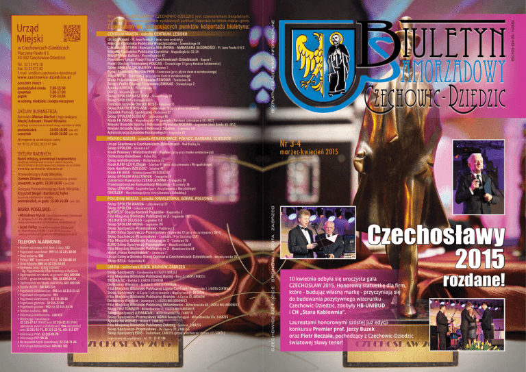 Burmistrz Marian Błachut i jego zastępcy Maciej Kołoczek i Paweł Mrowiec przyjmują mieszkańców w ramach skarg i wniosków w każdy: poniedziałek 14:00-16:00 pok. 201 czwartek 14:00-16:00 pok. 201 Wymagane są wcześniejsze zapisy: tel. 32 21 47 132, 32 21 47 164 PÓŁNOC MIASTA - osiedla RENARDOWICE, PÓŁNOC, BARBARA, DZIEDZICE Przewodniczący Rady Miejskiej Damian Żelazny przyjmuje mieszkańców w każdy: czwartek, w godz. 15:30-16:30 - pok. 206 Zastępcy Przewodniczącego Rady Miejskiej Krzysztof Bergel i Bartłomiej Fajfer Urząd Skarbowy w Czechowicach-Dziedzicach - Nad Białką 1a Sklep SPOŁEM - Górnicza 67 Kiosk Prasowy i Wielobranżowy - Węglowa (przy przystanku autobusowym) Delikatesy Osiedlowe - Polna 31a Sklep wielobranżowy - Michałowicza 6c Kiosk KAM-LEX K.Olejak - Szkolna 47 (przy skrzyżowaniu z Wyspiańskiego) Dom Handlowy DZIEDZIC - Szkolna 40 Kiosk FH ANIA - Szkolna (przed DH DZIEDZIC) Sklep SPOŁEM WALCOWNIK - Traugutta 19 Cukiernia i Kawiarnia CZEKOLADOWA - Traugutta 29 Przedsiębiorstwo Komunikacji Miejskiej - Drzymały 16 Sklep LEWIATAN - Legionów (przy skrzyżowaniu z Waryńskiego) GROSZEK - Waryńskiego (przy skrzyżowaniu z Ochodzką) poniedziałek, w godz. 15:30-16:30 - pok. 206 POŁUDNIE MIASTA - osiedla TOMASZÓWKA, GÓRNE, POŁUDNIE DYŻURY RADNYCH: Radni miejscy, powiatowi i wojewódzcy przyjmują mieszkańców w ramach swoich dyżurów, których bieżąco aktualizowana lista znajduje się na stronie www.bip.czechowice-dziedzice.pl przyjmują mieszkańców w każdy: BIURA POSELSKIE: • Mirosława Nykiel Filia w Czechowicach-Dziedzicach ul. Kolejowa 9, tel. 606 283 709 (asystent społ.) www.miroslawanykiel.pl • [email protected] • Jacek Falfus Filia w Czechowicach-Dziedzicach ul. Niepodległości 79, tel. 33 828 39 60 (Bielsko-Biała) www.jacekfalfus.pl • [email protected] TELEFONY ALARMOWE: • Numer alarmowy z tel. kom. i stacj: 112 • Pogotowie ratunkowe: 999 lub 32 215-20-00 • Straż pożarna: 998 • Policja: 997 Komisariat Policji: 32 214-88-10 • Straż Miejska: 986 lub 32 215-54-92 • Niebieska Linia - 0-801 120 002 - Og. Pogotowie dla Ofiar Przemocy w Rodzinie • Ogólnopolski nr ratunk. w górach: 601 100 300 • GOPR – grupa beskidzka - 985, 33 829-69-00 • Ogólnopolski nr ratunk. nad wodą: 601 100 100 • Śląskie WOPR - 500 543 210 • Pogotowie ciepłownicze - 993 lub 32 215-21-51 • Pogotowie energetyczne - 991 • Pogotowie elektryczne - 32 215-28-22 • Pogotowie górnicze - 32 215-27-88 • Pogotowie gazowe - 992 lub 32 215-33-76 • Telefon zaufania - 988 • Informacja telefoniczna - 118-913 • Wodociągi i kanalizacja: 32 215-37-17 (PWiK) oraz 32 215-31-71 (PIM) zgłoszenia awarii (całodobowo): 994 (bezpłatny) oraz 32 215-31-71, 32 215-21-51, 601 312 877 • Informacje PKM: 32 215-91-78 • Informacja PKP: 94-36 • Na wypadek klęski żywiołowej: 32 214-71-66 • PCK Grupa Ratownictwa: 669 881 302 BEZPŁATNE CZASOPISMO INFORMACYJNE DYŻURY BURMISTRZA: Sklep SPOŁEM WANDA - Łukasiewicza 57 Sklep SPOŁEM - Łukasiewicza 2 AUTOTEST Stacja Kontroli Pojazdów - Kopernika 3 Filia Miejskiej Biblioteki Publicznej nr 3 - Legionów 187 DELIKATESY DELISSO - Legionów 158 Sklep SPOŁEM IWONA - Legionów 191 Sklep Spożywczo-Przemysłowy - Podlarysz 2 EURO Sklep Spożywczo-Przemysłowy - Lipowska 72 (przy skrzyżowaniu z DK-1) Sklep Spożywczo-Przemysłowy - Zamkowa 74 (w Strażnicy OSP) Filia Miejskiej Biblioteki Publicznej nr 1 - Zamkowa 76 EURO Sklep Spożywczo-Przemysłowy - Mazańcowicka 64 Filia Miejskiej Biblioteki Publicznej nr 2 - Mazańcowicka 68 Hotel „Pałac Kotulińskich” - Zamkowa 2 Urząd Celny w Bielsku-Białej Oddział w Czechowicach-Dziedzicach - Mazańcowicka 70 Sklep BELA - Kopernika 41 GMINA - sołectwa LIGOTA, BRONÓW, ZABRZEG Sklep Spożywczy - Czechowicka 4, LIGOTA BURZEJ Filia Miejskiej Biblioteki Publicznej Burzej - Bory 2, LIGOTA BURZEJ TRÓJKA SC - Bielska 5, LIGOTA CENTRUM Delikatesy Wiejskie - Bielska 2, LIGOTA CENTRUM Filia Miejskiej Biblioteki Publicznej Ligota Centrum - Wapienicka 1, LIGOTA CENTRUM Sklep Spożywczy - A.Czyża 1 (skrzyżowanie z Międzyrzecką), BRONÓW Filia Miejskiej Biblioteki Publicznej Bronów - A.Czyża 12, BRONÓW Delikatesy Wiejskie - Jaworowa 1, LIGOTA MILIARDOWICE Filia Miejskiej Biblioteki Publicznej Miliardowice - Miliardowicka 68, LIGOTA MILIARDOWICE Sklep FHU TOMSON - Miliardowicka 12, LIGOTA MILIARDOWICE Sklep Spożywczy (LEWIATAN) - Miliardowicka 17a, ZABRZEG Sklep Spożywczo-Przemysłowy AGMA Renata Pocięgiel - Miliardowicka 17a, ZABRZEG Apteka NA WIDNEJ - Widna 1, ZABRZEG Filia Miejskiej Biblioteki Publicznej Zabrzeg - Gminna, ZABRZEG Sklep Spożywczo-Przemysłowy - Do Zapory 22, ZABRZEG Sklep Spożywczy EDIS - Stadionowa, ZABRZEG (przed wjazdem na stadion LKS SOKÓŁ) Zapraszamy do współpracy - tel. 32 - 21 47 186 Nr 3-4 marzec-kwiecień 2015 ZABRZEG poniedziałek-środa 7:30-15:30 czwartek 7:30-17:30 piątek 7:30-13:30 w soboty, niedziele i święta nieczynny L I G O TA GODZINY PRACY : BRONÓW Tel. 32 21 471 10 Fax. 32 21 471 82 E-mail. [email protected] www.czechowice-dziedzice.pl Urząd Miejski - Pl. Jana Pawła II 1 (oraz inne wydziały) Miejska Biblioteka Publiczna Wypożyczalnia - Żeromskiego 14 Cukiernia ASTERIA i Kawiarnia MALINOWA - AMBASADA SŁODKOŚCI - Pl. Jana Pawła II 4/2 Miejska Biblioteka Publiczna Czytelnia - Niepodległości 32/34 Miejski Dom Kultury - Niepodległości 42 Powiatowy Urząd Pracy Filia w Czechowicach-Dziedzicach - Kopcia 1 Punkt Obsługi Finansowej POLCAS - Słowackiego 13 (przy Rondzie Solidarności) Sklep SPOŁEM DELIKATESY - Kolejowa 1 Punkt Sprzedaży Biletów PKM - Towarowa (przy płycie dworca autobusowego) Kiosk WEST - Towarowa 2 (przy płycie dworca autobusowego) Biuro Pośrednictwa i Finansów RENOMA - Towarowa 2b Sklep i Punkt Obsługi Finansowej EMIKAS - Słowackiego 2 Apteka EUREKA - Piłsudskiego 12 DAYLI - Niepodległości 12 Sklep SPOŁEM NASZ DOM - Słowackiego 24 Sklep SPOŁEM - Konopnic
