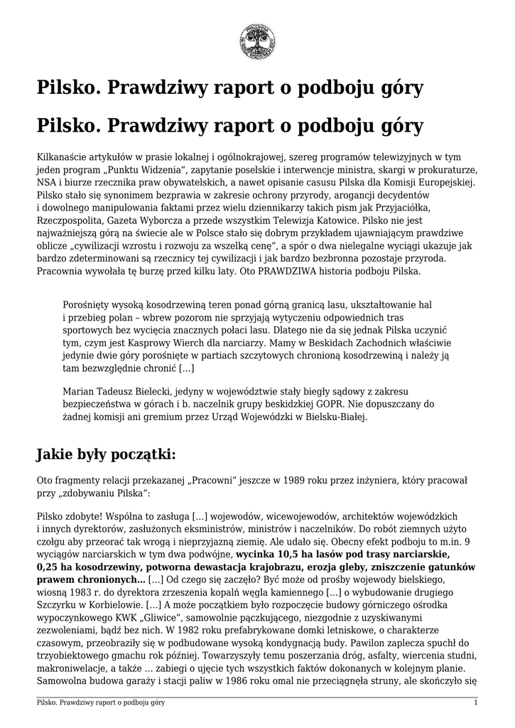 Pilsko. Prawdziwy raport o podboju góry Pilsko. Prawdziwy raport o podboju góry Kilkanaście artykułów w prasie lokalnej i ogólnokrajowej, szereg programów telewizyjnych w tym jeden program „Punktu Widzenia”, zapytanie poselskie i interwencje ministra, skargi w prokuraturze, NSA i biurze rzecznika praw obywatelskich, a nawet opisanie casusu Pilska dla Komisji Europejskiej. Pilsko stało się synonimem bezprawia w zakresie ochrony przyrody, arogancji decydentów i dowolnego manipulowania faktami przez wielu dziennikarzy takich pism jak Przyjaciółka, Rzeczpospolita, Gazeta Wyborcza a przede wszystkim Telewizja Katowice. Pilsko nie jest najważniejszą górą na świecie ale w Polsce stało się dobrym przykładem ujawniającym prawdziwe oblicze „cywilizacji wzrostu i rozwoju za wszelką cenę”, a spór o dwa nielegalne wyciągi ukazuje jak bardzo zdeterminowani są rzecznicy tej cywilizacji i jak bardzo bezbronna pozostaje przyroda. Pracownia wywołała tę burzę przed kilku laty. Oto PRAWDZIWA historia podboju Pilska. Porośnięty wysoką kosodrzewiną teren ponad górną granicą lasu, ukształtowanie hal i przebieg polan – wbrew pozorom nie sprzyjają wytyczeniu odpowiednich tras sportowych bez wycięcia znacznych połaci lasu. Dlatego nie da się jednak Pilska uczynić tym, czym jest Kasprowy Wierch dla narciarzy. Mamy w Beskidach Zachodnich właściwie jedynie dwie góry porośnięte w partiach szczytowych chronioną kosodrzewiną i należy ją tam bezwzględnie chronić […] Marian Tadeusz Bielecki, jedyny w województwie stały biegły sądowy z zakresu bezpieczeństwa w górach i b. naczelnik grupy beskidzkiej GOPR. Nie dopuszczany do żadnej komisji ani gremium przez Urząd Wojewódzki w Bielsku-Białej. Jakie były początki: Oto fragmenty relacji przekazanej „Pracowni” jeszcze w 1989 roku przez inżyniera, który pracował przy „zdobywaniu Pilska”: Pilsko zdobyte! Wspólna to zasługa […] wojewodów, wicewojewodów, architektów wojewódzkich i innych dyrektorów, zasłużonych eksministrów, ministrów i naczelników. Do robót ziemnych użyto czołgu aby przeorać tak wrogą i nieprzyjazną ziemię. Ale udało się. Obecny efekt podboju to m.in. 9 wyciągów narciarskich w tym dwa podwójne, wycinka 10,5 ha lasów pod trasy narciarskie, 0,25 ha kosodrzewiny, potworna dewastacja krajobrazu, erozja gleby, zniszczenie gatunków prawem chronionych… […] Od czego się zaczęło? Być może od prośby wojewody bielskiego, wiosną 1983 r. do dyrektora zrzeszenia kopalń węgla kamiennego […] o wybudowanie drugiego Szczyrku w Korbielowie. […] A może początkiem było rozpoczęcie budowy górniczego ośrodka wypoczynkowego KWK „Gliwice”, samowolnie pączkującego, niezgodnie z uzyskiwanymi zezwoleniami, bądź bez nich. W 1982 roku prefabrykowane domki letniskowe, o charakterze czasowym, przeobraziły się w podbudowane wysoką kondygnacją budy. Pawilon zaplecza spuchł do trzyobiektowego gmachu rok później. Towarzyszyły temu poszerzania dróg, asfalty, wiercenia studni, makroniwelacje, a także … zabiegi o ujęcie tych wszystkich faktów dokonanych w kolejnym planie. Samowolna budowa garaży i stacji paliw w 1986 roku omal nie przeciągnęła struny, ale skończyło się Pilsko. Prawdziwy raport o podboju góry 1 tylko w sądzie, gdzie kwota kar nie przekroczyła zapewne przyznanych z tego tytułu premii, a zakazy użytkowania obiektów i nakazy rozbiórki zamieniono na … pozwolenia na ich użytkowanie (Siedem lat później inż. Sikorski, przedstawiany jako budowniczy na Pilsku, występuje w programach TV Katowice już w roli pozytywnego bohatera, głosząc, że wszystko było zawsze legalnie, a – zdaniem górników i dziennikarzy – nielegalny to był Żywiecki Park Krajobrazowy – przyp. red.). Równolegle, od 1984 roku, jakby w cieniu kubatur rosną wyciągi narciarskie […] Pertraktując dla uśpienia przeciwników o demontowalności urządzeń wyciągowych leje się beton, czołg taranuje drzewa! Wobec faktu wykonania wyciągów nie potrzeba już pozwolenia na budowę, potrzebne jest tylko dopuszczenie do ich eksploatacji. Powstają kolejne wyciągi […] pod szczytem natura jakby oporniejsza, lecz jej da radę trotyl i górniczy eksperci od robót strzałowych – to rok 1986. Protestowali naukowcy, Komisja Ochrony Przyrody ZW PTTK w Bielsku-Białej, Rada Społeczno Naukowa Żywieckiego Parku Krajobrazowego. Stanisław Bubin opisał samowole na Pilsku w Prawie i Życiu. Skandalem była także budowa schroniska i GOPR-ówki na Hali Miziowej. Dla decydentów nie liczy się prawo o ochronie przyrody, opinie naukowców i środowisk profesjonalnych, stawia się na działania populistyczne, tanią propagandę i posłusznych wykonawców: projekt zagospodarowania przestrzennego Górniczego Ośrodka Narciarskiego w Korbielowie opracowany w pracowni projektowej PSS Społem w Żywcu używa m.in. następującej argumentacji: Zaśmiecanie terenu przez narciarzy i nasilenie tego zjawiska […] nie wykracza poza zakres spotykany powszechnie w miejscach publicznych” […] Zagospodarowanie narciarskie […] ingeruje w najwyższe partie gór i często jest jeszcze uważane za kosztowny rodzaj zbytku. Chyba stąd zrodziła się niesłuszna opinia uznająca dużą część stoków Pilska za obszar krajobrazu zdewastowanego nadmiarem urządzeń narciarskich. Wartości, które są niszczone Kopuła szczytowa Pilska, na którą poprowadzono dwa z jedenastu wyciągów (nr 7 i nr 8) to jeden z najciekawszych i najcenniejszych ekologicznie obszarów w województwie bielskim. Jest to jedyny, pokryty kosodrzewiną szczyt w Polsce, który nie jest rezerwatem przyrody, a przez (teoretycznie) chronioną prawem kosodrzewinę poprowadzony jest wyciąg orczykowy. Po stronie słowackiej znajduje się duży rezerwat „Pilsko”, po którym jeżdżą polscy narciarze, gdyż oba wyciągi, lekceważąc otulinę rezerwatu, wprost do niego przylegają. Żyje ta