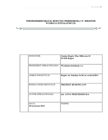 Str o na |1 T TE ER RM MO OM MO OD DE ER RN NIIZ ZA AC CJJA AB BU UD DY YN NK KU U PPR RZ ZE ED DSSZ ZK KO OL LA AW WR RZ ZG GO OW WIIE E W Y M I A N A I N S T A L A C J I C . O . WYMIANA INSTALACJI C.O. INWESTOR: Gmina Rzgów Plac 500Lecia 22 95-030 Rzgów PRZEDMIOT OPRACOWANIA: Wymiana instalacjo c.o. ADRES INWESTYCJI: Rzgów ul. Szkolna 3a Dz nr ewid.1630/1 RODZAJ DOKUMENTACJI: PROJEKT BUDOWLANY AUTOR OPRACOWANIA: inż. ANNA PRZEŹDZIECKA DATA: 20 kwiecień 2015 PODPIS: Str o na |2 SPIS TREŚCI 1.0. 2.0. 3.0. 4.0. 5.0. 5.1. 5.2. 5.3. 5.4. 5.5. 6.0 7.0 Podstawa opracowania Zakres opracowania Źródło ciepła Bilans cieplny budynku Opis rozwiązań cieplno-mechanicznych Rozwiązania techniczne Materiały Odpowietrzenie instalacji Zabezpieczenie antykorozyjne Próby, odbiory i wytyczne Uwagi końcowe Informacja dotycząca bezpieczeństwa i ochrony zdrowia SPIS RYSUNKÓW NUMER RYSUNKU 1 2 3 4 TREŚĆ RYSUNKU Rzut piwnic Rzut parteru Rzut piętra Rozwinięcie instalacji c.o. ZAŁĄCZNIKI 1. 2. 3. Oświadczenie Izba Uprawnienia SKALA 1:100 1:100 1:100 ------ Str o na |3 OPIS TECHNICZNY Wszystkie przytoczone materiały oraz ich nazwy należy rozumieć jako określenie standardu i mogą być zastępowane materiałami równoważnymi. 1.0. Podstawa opracowania. Projekt opracowano na podstawie: • zlecenia Inwestora • audytu energetycznego budynku z maja 2014r • projektu architektonicznego • obowiązujących przepisów, norm i normatywów projektowania. 2.0. Zakres opracowania. Tematem niniejszego opracowania jest projekt wymiany instalacji c.o. dla budynku przedszkola publicznego w Rzgowie. W budynku znajduje się instalacja c.o. wykonana rur stalowych. Główne ciągi rozprowadzające przebiegają pod stropem piwnicy i są we wspólnej izolacji z rurociągami cwu , a miejscami w osobnej. W części rurociągi prowadzone są kanale podpodłogowym w części budynku niepodpiwniczonego i tam zostaję niezmienione. W budynku znajdują się grzejniki żeberkowe , a w piwnicy grzejniki Faviera. Grzejniki na parterze i na piętrze są osłonięte drewnianymi osłonami i osłony te po zdemontowaniu należy ponownie zamontować. .Instalację starą należy tam gdzie jest to możliwe zdemontować, a w miejscach niemożliwych przeciąć i włączyć do nowo wykonanego rurociągu. W miejscu pokazanym na rzucie piwnic włączona jest nowa instalacja c.o. dla zasilania dobudowanej części budynku przedszkola. Instalacja ta jest wykonana w oparciu o inny projekt, którego egzemplarz archiwalny posłużył nam do obliczeń w tym do doboru zaworu regulacyjnego ASV-M +ASV-PV i umiejscowienia włączenia tej instalacji. 3.0. Źródło ciepła. Źródłem ciepła jest istniejąca kotłownia dostarczająca ciepło do kompleksu obiektów w tym przedszkola. 4.0. Bilans cieplny budynku. Strefa klimatyczna III - 20° C Parametry wody grzewczej instalacji c.o. 80/60 ° C Zaprojektowano instalację centralnego ogrzewania z grzejnikami płytowymi z zasilaniem bocznym. Obliczenia zapotrzebowania ciepła dla budynku wykonano programem Audytor – OZC w oparciu o następujące normy i przepisy: ─ Dz. U. Nr 75/2002 poz. 690 Rozporządzenie Ministra Infrastruktury z dnia 12 kwietnia 2002r. w sprawie warunków technicznych, jakim powinny odpowiadać Str o na |4 ─ ─ ─ ─ budynki i ich usytuowanie §134.2 – temperatury obliczeniowe ogrzewanych pomieszczeń. PN – 82/B – 02403 – Temperatury zewnętrzne. PN – EN – ISO 6946:1998 – Opór cieplny i współczynnik przenikania ciepła. Metoda obliczania. PN – B – 03406:1994 – Ogrzewnictwo. Obliczanie zapotrzebowania na ciepło pomieszczeń o kubaturze do 600m³. Dz. U. Nr 75/2002 poz. 690. Załącznik do Rozporządzenia Ministra Infrastruktury z dnia 12 kwietnia 2002r. w sprawie warunków technicznych, jakim powinny odpowiadać budynki i ich usytuowanie – wartości Uk(max) ścian, stropów, stropodachów oraz okien i drzwi. Moc całkowita: Qco = 57,35 kW Przepływ w źródle Q = 1558,6 kg/h Pojemność wodna zładu V = 438,2 dm3 Ciśnienie p = 29,5 kPa Wskaźnik cieplny budynku powierzchniowy wynosi: ΦHL/A ogrz = Wskaźnik cieplny budynku kubaturowy wynosi: ΦHL/Vogrz = 5.0. W/m2 W/m3 Opis projektowanych rozwiązań cieplno – mechanicznych. 5.1. Rozwiązania techniczne Zapotrzebowanie ciepła poszczególnych pomieszczeń podano na rzutach poszczególnych kondygnacji. Przed włączeniem do eksploatacji instalację poddać próbie ciśnieniowej na zimno oraz rozruchowi na gorąco. Po uzyskaniu pozytywnych prób na szczelność instalacji można przystąpić do dalszych prac w tym malowania i izolacji.. Przy przejściach przez ściany i stropy należy stosować tuleje ochronne o średnicy większej od średnicy rury o dwie dymensje. Przewody c.o. należy wykonać z rur stalowych czarnych łączonych przez spawanie wg PN – 80/H – 74244. Na załamaniach kolana o promieniu gięcia R = 3d. Poziomy instalacyjne będą układane ze spadkami 3‰. Przewody (stalowe) instalacji c.o. należy mocować za pomocą obejm HILTI. Maksymalny rozstaw mocowań przewodów w [m] wg tabeli: Średnica nominalna rury Dn 10 do Dn 20 Dn 25 Dn 32 Dn 40 Dn 50 Przewód montowany pionowo¹) 2,0 2,9 3,4 3,9 4,6 inaczej 1,5 2,2 2,6 3,0 3,5 Str o na |5 5.2 . Materiały 5.2. Produkt Wielkość Kod katalogowy Ilość Jednostka Zestawienie rur i kształtek Rury - Rury stalowe Rura stal. k= 0.15 DN 15 Rura stal. k= 0.15 DN 20 Rura stal. k= 0.15 DN 25 Rura stal. k= 0.15 DN 32 Rura stal. K=0.15 DN 40 Kolano 90° 15 Rura stalowa DN15 Rura stalowa DN20 Rura stalowa DN25 Rura stalowa DN32 Rura stalowa DN 40 Kolano DN15 218 m 77 m 74 m 40 m 14 m 10 szt. Kolano 90° 20 Kolano DN20 1 szt. Kolano 90° 25 Kolano DN25 4 szt. Kolano 90° 40 Kolano DN 40 4 szt Kształtki - Złączki i kształtki mosiężne, żeliwne i stalowe Mufa calowa równoprzelotowa ½"w - ½"w 2 szt. ½"z - ½"z 151 szt. ½"w - ½"w 102 szt. Złączki i kształtki mosiężne, żeliwne i stalowe Nypel calowy równoprzel