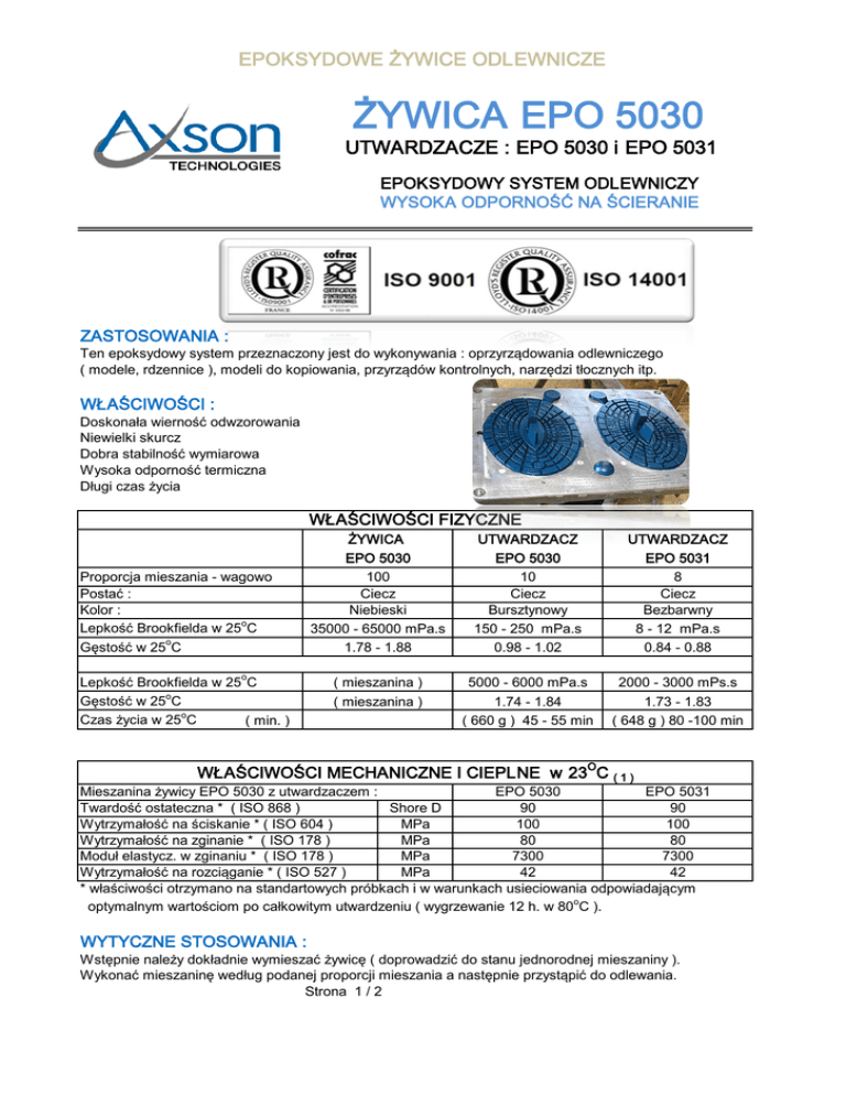 EPOKSYDOWE ŻYWICE ODLEWNICZE ŻYWICA EPO 5030 UTWARDZACZE : EPO 5030 i EPO 5031 EPOKSYDOWY SYSTEM ODLEWNICZY WYSOKA ODPORNOŚĆ NA ŚCIERANIE ZASTOSOWANIA : Ten epoksydowy system przeznaczony jest do wykonywania : oprzyrządowania odlewniczego ( modele, rdzennice ), modeli do kopiowania, przyrządów kontrolnych, narzędzi tłocznych itp. WŁAŚCIWOŚCI : Doskonała wierność odwzorowania Niewielki skurcz Dobra stabilność wymiarowa Wysoka odporność termiczna Długi czas życia WŁAŚCIWOŚCI FIZYCZNE Proporcja mieszania - wagowo Postać : Kolor : Lepkość Brookfielda w 25oC Gęstość w 25oC Lepkość Brookfielda w 25oC Gęstość w 25oC Czas życia w 25oC ( min. ) ŻYWICA EPO 5030 100 Ciecz Niebieski 35000 - 65000 mPa.s 1.78 - 1.88 UTWARDZACZ EPO 5030 10 Ciecz Bursztynowy 150 - 250 mPa.s 0.98 - 1.02 UTWARDZACZ EPO 5031 8 Ciecz Bezbarwny 8 - 12 mPa.s 0.84 - 0.88 ( mieszanina ) ( mieszanina ) 5000 - 6000 mPa.s 1.74 - 1.84 ( 660 g ) 45 - 55 min 2000 - 3000 mPs.s 1.73 - 1.83 ( 648 g ) 80 -100 min WŁAŚCIWOŚCI MECHANICZNE I CIEPLNE w 23OC ( 1 ) Mieszanina żywicy EPO 5030 z utwardzaczem : EPO 5030 EPO 5031 Twardość ostateczna * ( ISO 868 ) Shore D 90 90 100 100 Wytrzymałość na ściskanie * ( ISO 604 ) MPa 80 80 Wytrzymałość na zginanie * ( ISO 178 ) MPa 7300 7300 Moduł elastycz. w zginaniu * ( ISO 178 ) MPa 42 42 Wytrzymałość na rozciąganie * ( ISO 527 ) MPa * właściwości otrzymano na standartowych próbkach i w warunkach usieciowania odpowiadającym optymalnym wartościom po całkowitym utwardzeniu ( wygrzewanie 12 h. w 80oC ). WYTYCZNE STOSOWANIA : Wstępnie należy dokładnie wymieszać żywicę ( doprowadzić do stanu jednorodnej mieszaniny ). Wykonać mieszaninę według podanej proporcji mieszania a następnie przystąpić do odlewania. Strona 1 / 2 EPOKSYDOWE ŻYWICE ODLEWNICZE ŻYWICA EPO 5030 UTWARDZACZE : EPO 5030 i EPO 5031 EPOKSYDOWY SYSTEM ODLEWNICZY WYSOKA ODPORNOŚĆ NA ŚCIERANIE WŁAŚCIWOŚCI MECHANICZNE I CIEPLNE w 23OC ( 1 ) Mieszanina żywicy EPO 5030 z utwardzaczem : EPO 5030 EPO 5031 o C 70 68 Temperatura zeszklenia * TMA-Mettler -1 -6 K WSP * TMA-Mettler 60 x 10 60 x 10-6 Maksymalna grubość odlewu * mm 20 35 Skurcz liniowy * mm/m 0.3 - 0.4 0.2 - 0.3 Czas rozformowania w 20oC * h. 16 - 24 16 - 24 Czas całkowitego utwardzania w 20oC * dni 5 5 * właściwości otrzymano na standartowych próbkach i w warunkach usieciowania odpowiadającym optymalnym wartościom po całkowitym utwardzeniu ( wygrzewanie 12 h. w 80oC ). BEZPIECZEŃSTWO I HIGIENA PRACY : Zwykłe środki bezpieczeństwa powinny być zachowane podczas pracy z tym produktem : - zapewnić dobrą wentylację - nosić rękawice, okulary i ubranie ochronne Bardziej szczegółowe informacje zawarte są w kartach charakterystyki żywicy i utwardzacza. PRZECHOWYWANIE : Okres składowania wynosi 12 miesięcy w oryginalnych nie otwieranych pojemnikach przechowywanych w temperaturze pomiędzy 15 i 25oC . OPAKOWANIA : ŻYWICA EPO 5030 10 x 1.50 kg 1 x 15.00 kg UTW. EPO 5030 1 x 1.50 kg UTW. EPO 5031 1 x 1.20 kg GWARANCJA : Wszystkie informacje zawarte powyżej są rezultatem badań i testów przeprowadzonych w naszym laboratorium w ściśle określonych warunkach. Użytkownik ponosi pełną odpowiedzialność za określenie przydatności ( w swoich warunkach ) produktu AXSON ( przed dokonaniem zakupu ) do proponowanego zastosowania. AXSON gwarantuje zgodność swojego produktu z jego specyfikacją lecz nie może zagwarantować jego kompatybilności z jakimkolwiek szczególnym zastosowaniem. AXSON odrzuca jakąkolwiek odpowiedzialność za zniszczenia lub wypadki, które spowodowane zostały użyciem jego produktów. Odpowiedzialność AXSON jest ściśle ograniczona do zwrotu pieniędzy lub wymiany produktu nie zgodnego z jego specyfikacją. AMOD - Andrzej Modrzewski 01-793 Warszawa ul. Rydygiera 8 tel. / fax. ( 22 ) 633-85-06 tel. ( 22 ) 669-39-76 tel. komórkowy ( 602 ) 26-11-15 INTERNET: www.amod.pl oraz www.amod.com.pl e-mail:[email protected] Strona 2 / 2 Przedstawiciel w Polsce :