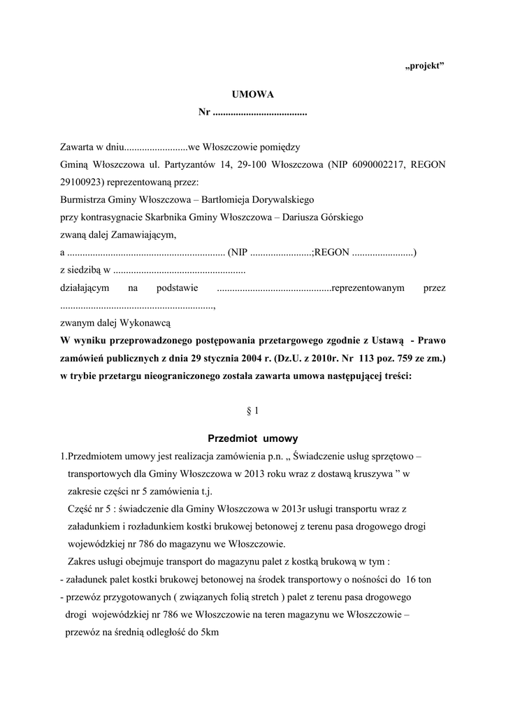 „projekt” UMOWA Nr ..................................... Zawarta w dniu.........................we Włoszczowie pomiędzy Gminą Włoszczowa ul. Partyzantów 14, 29-100 Włoszczowa (NIP 6090002217, REGON 29100923) reprezentowaną przez: Burmistrza Gminy Włoszczowa – Bartłomieja Dorywalskiego przy kontrasygnacie Skarbnika Gminy Włoszczowa – Dariusza Górskiego zwaną dalej Zamawiającym, a .............................................................. (NIP ........................;REGON ........................) z siedzibą w .................................................... działającym na podstawie .............................................reprezentowanym przez ............................................................, zwanym dalej Wykonawcą W wyniku przeprowadzonego postępowania przetargowego zgodnie z Ustawą - Prawo zamówień publicznych z dnia 29 stycznia 2004 r. (Dz.U. z 2010r. Nr 113 poz. 759 ze zm.) w trybie przetargu nieograniczonego została zawarta umowa następującej treści: §1 Przedmiot umowy 1.Przedmiotem umowy jest realizacja zamówienia p.n. „ Świadczenie usług sprzętowo – transportowych dla Gminy Włoszczowa w 2013 roku wraz z dostawą kruszywa ” w zakresie części nr 5 zamówienia t.j. Część nr 5 : świadczenie dla Gminy Włoszczowa w 2013r usługi transportu wraz z załadunkiem i rozładunkiem kostki brukowej betonowej z terenu pasa drogowego drogi wojewódzkiej nr 786 do magazynu we Włoszczowie. Zakres usługi obejmuje transport do magazynu palet z kostką brukową w tym : - załadunek palet kostki brukowej betonowej na środek transportowy o nośności do 16 ton - przewóz przygotowanych ( związanych folią stretch ) palet z terenu pasa drogowego drogi wojewódzkiej nr 786 we Włoszczowie na teren magazynu we Włoszczowie – przewóz na średnią odległość do 5km - rozładunek palet z kostką brukową na terenie magazynu we Włoszczowie - dojazd środka transportowego do miejsca załadunku i powrót do bazy - zabezpieczenie i oznaczenie miejsca załadunku palet w warunkach ruchu na drodze nr 786 § 2 Obowiązki stron 1. Do obowiązków Zamawiającego naleŜy: 1.1 Wskazanie Wykonawcy miejsca załadunku palet na terenie pasa drogowego drogi wojewódzkiej nr 786 we Włoszczowie, miejsca magazynu palet i terminu przewozu palet. 1.2 Nadzór i koordynacja z Wykonawcą realizacji przewozu palet do magazynu ze szczególnym uwzględnieniem bezpieczeństwa realizacji załadunków palet w warunkach ruchu na drodze wojewódzkiej nr 786. 1.3 Odbiór usługi i pisemne potwierdzenie Wykonawcy w ciągu 7 dni od realizacji usługi ilości przewiezionych palet . 1.4 Zapłata Wykonawcy za wykonaną usługę w terminie 14 dni od złoŜenia przez Wykonawcę faktury. 2. Do obowiązków Wykonawcy naleŜy: 2.1 Realizacja przewozu palet zgodnie z zawartą umową i wskazaniem przez Zamawiającego miejsca załadunku, ilości i terminu realizacji usługi. . 2.2 Wystawienie faktur za zrealizowane usługi przewozów palet na podstawie potwierdzenia pisemnego Zamawiającego ilości przewiezionych palet. 2.3 Wykonawca ponosi odpowiedzialność za szkody wyrządzone osobom trzecim w miejscu realizacji usług, w stopniu całkowicie zwalniającym od tej odpowiedzialności Zamawiającego. §3 Termin realizacji umowy Wykonawca wykona przedmiot umowy, określony w § 1 umowy w terminie do dnia 15 grudnia 2013 r. §4 Odbiór i fakturowanie usługi 1. Strony postanawiają Ŝe realizacja usługi transportu wraz z załadunkiem i rozładunkiem kostki brukowej betonowej z terenu pasa drogowego drogi wojewódzkiej nr 786 do magazynu we Włoszczowie odbierana będzie fakturami częściowymi w ilościach uzgodnionych z Zamawiającym, wynikających z czasookresów realizacji przewozów . 2. Podstawę wystawienia faktury stanowi pisemne potwierdzenie przez Zamawiającego ilości przewiezionych palet zgodnie z postanowieniami§ 2 ust.1 pkt.1.3.. 3. Zapłata Wykonawcy za wykonaną usługę w terminie 14 dni od złoŜenia przez Wykonawcę faktury. §5 Wynagrodzenie i sposób rozliczeń 1.Za wykonanie przedmiotu umowy określonego w § 1 umowy, strony ustalają wynagrodzenie w kwocie brutto………….zł / paletę ( w tym naleŜny podatek VAT ) słownie ……………………………………………………………………………zł. 2. Zapłata wynagrodzenia naleŜnego Wykonawcy dokonywana będzie na rachunek bankowy …………………………………………………….. 3. Wynagrodzenie za wykonanie przedmiotu umowy płatne fakturami częściowymi zgodnie z postanowieniami § 5 ust.1-3 4. W przypadku wykonywanych robót przez Podwykonawców, warunkiem zapłaty wynagrodzenia dla Wykonawcy jest złoŜenie wraz z fakturami częściowymi oświadczenia Podwykonawcy o rozliczeniu wykonanych usług i otrzymaniu pełnej zapłaty od Wykonawcy za wykonane usługę stanowiącą część przedmiotu zamówienia. 5. Termin płatności faktury wynosi 14 dni od dnia złoŜenia faktury przez Wykonawcę. §6 Zmiana umowy 1. Zmiany postanowień zawartej umowy dotyczą: a) wynagrodzenia, w przypadku urzędowych zmian w obowiązujących przepisach podatkowych, w tym zmiany podatku VAT, 2. Zmiana postanowień zawartej umowy moŜe nastąpić za zgodą obu stron wyraŜoną na piśmie, w formie aneksu do umowy, pod rygorem niewaŜności takiej zmiany. §7 Odstąpienie od umowy 1. Zamawiający moŜe odstąpić od umowy w terminie 30 dni od powzięcia wiadomości o wystąpieniu istotnej zmiany okoliczności powodującej, Ŝe wykonanie umowy nie leŜy w interesie publicznym, czego nie moŜna było przewidzieć w chwili zawarcia umowy. W takim przypadku Wykonawcy przysługuje wynagrodzenie naleŜne z tytułu wykonanej części umowy 2. Zamawiającemu przysługuje prawo do odstąpienia od umowy gdy: 1) Wykonawca, bez uzasadnionych przyczyn nie rozpoczął realizacji przewozów palet z kostką brukową pomimo wskazania przez Zamawiającego miejsca , terminu przewozu palet 2) Wykonaw