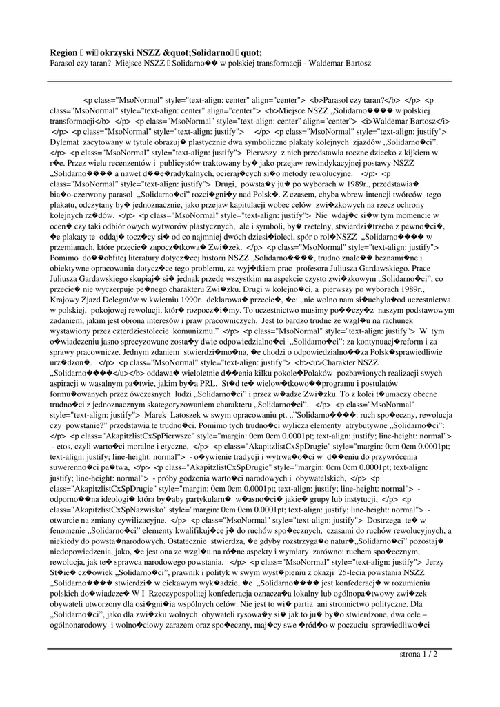 Region �wi�okrzyski NSZZ "Solidarno��quot; Parasol czy taran? Miejsce NSZZ Solidarno�� w polskiej transformacji - Waldemar Bartosz <p class="MsoNormal" style="text-align: center" align="center"> <b>Parasol czy taran?</b> </p> <p class="MsoNormal" style="text-align: center" align="center"> <b>Miejsce NSZZ „Solidarno���� w polskiej transformacji</b> </p> <p class="MsoNormal" style="text-align: center" align="center"> <i>Waldemar Bartosz</i> </p> <p class="MsoNormal" style="text-align: justify"> </p> <p class="MsoNormal" style="text-align: justify"> Dylemat zacytowany w tytule obrazuj� plastycznie dwa symboliczne plakaty kolejnych zjazdów „Solidarno�ci”. </p> <p class="MsoNormal" style="text-align: justify"> Pierwszy z nich przedstawia roczne dziecko z kijkiem w r�e. Przez wielu recenzentów i publicystów traktowany by� jako przejaw rewindykacyjnej postawy NSZZ „Solidarno���� a nawet d��e�radykalnych, ocieraj�cych si�o metody rewolucyjne. </p> <p class="MsoNormal" style="text-align: justify"> Drugi, powsta�y ju� po wyborach w 1989r., przedstawia� bia�o-czerwony parasol „Solidarno�ci” rozci�gni�y nad Polsk�. Z czasem, chyba wbrew intencji twórców tego plakatu, odczytany by� jednoznacznie, jako przejaw kapitulacji wobec celów zwi�zkowych na rzecz ochrony kolejnych rz�dów. </p> <p class="MsoNormal" style="text-align: justify"> Nie wdaj�c si�w tym momencie w ocen� czy taki odbiór owych wytworów plastycznych, ale i symboli, by� rzetelny, stwierdzi�trzeba z pewno�ci�, �e plakaty te oddaj� tocz�cy si� od co najmniej dwóch dziesi�ioleci, spór o rol�NSZZ „Solidarno���� w przemianach, które przecie� zapocz�tkowa� Zwi�zek. </p> <p class="MsoNormal" style="text-align: justify"> Pomimo do��obfitej literatury dotycz�cej historii NSZZ „Solidarno����, trudno znale�� beznami�ne i obiektywne opracowania dotycz�ce tego problemu, za wyj�tkiem prac profesora Juliusza Gardawskiego. Prace Juliusza Gardawskiego skupiaj� si� jednak przede wszystkim na aspekcie czysto zwi�zkowym „Solidarno�ci”, co przecie� nie wyczerpuje pe�nego charakteru Zwi�zku. Drugi w kolejno�ci, a pierwszy po wyborach 1989r., Krajowy Zjazd Delegatów w kwietniu 1990r. deklarowa� przecie�, �e: „nie wolno nam si�uchyla�od uczestnictwa w polskiej, pokojowej rewolucji, któr� rozpocz�i�my. To uczestnictwo musimy po��czy�z naszym podstawowym zadaniem, jakim jest obrona interesów i praw pracowniczych. Jest to bardzo trudne ze wzgl�u na rachunek wystawiony przez czterdziestolecie komunizmu.” </p> <p class="MsoNormal" style="text-align: justify"> W tym o�wiadczeniu jasno sprecyzowane zosta�y dwie odpowiedzialno�ci „Solidarno�ci”: za kontynuacj�reform i za sprawy pracownicze. Jednym zdaniem stwierdzi�mo�na, �e chodzi o odpowiedzialno��za Polsk�sprawiedliwie urz�dzon�. </p> <p class="MsoNormal" style="text-align: justify"> <b><u>Charakter NSZZ „Solidarno����</u></b> oddawa� wieloletnie d��enia kilku pokole�Polaków pozbawionych realizacji swych aspiracji w wasalnym pa�twie, jakim by�a PRL. St�d te� wielow�tkowo��programu i postulatów formu�owanych przez ówczesnych ludzi „Solidarno�ci” i przez w�adze Zwi�zku. To z kolei t�umaczy obecne trudno�ci z jednoznacznym skategoryzowaniem charakteru „Solidarno�ci”. </p> <p class="MsoNormal" style="text-align: justify"> Marek Latoszek w swym opracowaniu pt. „”Solidarno����: ruch spo�eczny, rewolucja czy powstanie?” przedstawia te trudno�ci. Pomimo tych trudno�ci wylicza elementy atrybutywne „Solidarno�ci”: </p> <p class="AkapitzlistCxSpPierwsze" style="margin: 0cm 0cm 0.0001pt; text-align: justify; line-height: normal"> - etos, czyli warto�ci moralne i etyczne, </p> <p class="AkapitzlistCxSpDrugie" style="margin: 0cm 0cm 0.0001pt; text-align: justify; line-height: normal"> - o�ywienie tradycji i wytrwa�o�ci w d��eniu do przywrócenia suwerenno�ci pa�twa, </p> <p class="AkapitzlistCxSpDrugie" style="margin: 0cm 0cm 0.0001pt; text-align: justify; line-height: normal"> - próby godzenia warto�ci narodowych i obywatelskich, </p> <p class="AkapitzlistCxSpDrugie" style="margin: 0cm 0cm 0.0001pt; text-align: justify; line-height: normal"> odporno��na ideologi� która by�aby partykularn� w�asno�ci� jakie� grupy lub instytucji, </p> <p class="AkapitzlistCxSpNazwisko" style="margin: 0cm 0cm 0.0001pt; text-align: justify; line-height: normal"> otwarcie na zmiany cywilizacyjne. </p> <p class="MsoNormal" style="text-align: justify"> Dostrzega te� w fenomenie „Solidarno�ci” elementy kwalifikuj�ce j� do ruchów spo�ecznych, czasami do ruchów rewolucyjnych, a niekiedy do powsta�narodowych. Ostatecznie stwierdza, �e gdyby rozstrzyga�o natur�„Solidarno�ci” pozostaj� niedopowiedzenia, jako, �e jest ona ze wzgl�u na ró�ne aspekty i wymiary zarówno: ruchem spo�ecznym, rewolucja, jak te� sprawca narodowego powstania. </p> <p class="MsoNormal" style="text-align: justify"> Jerzy St�ie� cz�owiek „Solidarno�ci”, prawnik i polityk w swym wyst�pieniu z okazji 25-lecia powstania NSZZ „Solidarno���� stwierdzi� w ciekawym wyk�adzie, �e „Solidarno���� jest konfederacj� w rozumieniu polskich do�wiadcze� W I Rzeczypospolitej konfederacja oznacza�a lokalny lub ogólnopa�twowy zwi�zek obywateli utworzony dla osi�gni�ia wspólnych celów. Nie jest to wi� partia ani stronnictwo polityczne. Dla „Solidarno�ci”, jako dla zwi�zku wolnych obywateli rysowa�y si� jak to ju� by�o stwierdzone, dwa cele – ogólnonarodowy i wolno�ciowy zarazem oraz spo�eczny, maj�cy swe �ród�o w poczuciu sprawiedliwo�ci strona 1 / 2 Region �wi�okrzyski NSZZ "Solidarno��quot; Parasol czy tara