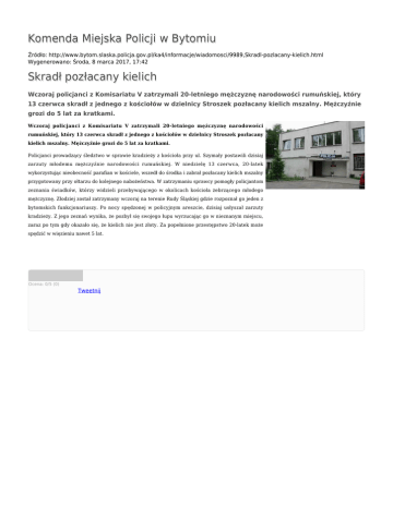 Komenda Miejska Policji w Bytomiu Źródło: http://www.bytom.slaska.policja.gov.pl/ka4/informacje/wiadomosci/9989,Skradl-pozlacany-kielich.html Wygenerowano: Środa, 8 marca 2017, 17:42 Skradł pozłacany kielich Wczoraj policjanci z Komisariatu V zatrzymali 20-letniego mężczyznę narodowości rumuńskiej, który 13 czerwca skradł z jednego z kościołów w dzielnicy Stroszek pozłacany kielich mszalny. Mężczyźnie grozi do 5 lat za kratkami. Wczoraj policjanci z Komisariatu V zatrzymali 20-letniego mężczyznę narodowości rumuńskiej, który 13 czerwca skradł z jednego z kościołów w dzielnicy Stroszek pozłacany kielich mszalny. Mężczyźnie grozi do 5 lat za kratkami. Policjanci prowadzący śledztwo w sprawie kradzieży z kościoła przy ul. Szymały postawili dzisiaj zarzuty młodemu mężczyźnie narodowości rumuńskiej. W niedzielę 13 czerwca, 20-latek wykorzystując nieobecność parafian w kościele, wszedł do środka i zabrał pozłacany kielich mszalny przygotowany przy ołtarzu do kolejnego nabożeństwa. W zatrzymaniu sprawcy pomogły policjantom zeznania świadków, którzy widzieli przebywającego w okolicach kościoła żebrzącego młodego mężczyznę. Złodziej został zatrzymany wczoraj na terenie Rudy Śląskiej gdzie rozpoznał go jeden z bytomskich funkcjonariuszy. Po nocy spędzonej w policyjnym areszcie, dzisiaj usłyszał zarzuty kradzieży. Z jego zeznań wynika, że pozbył się swojego łupu wyrzucając go w nieznanym miejscu, zaraz po tym gdy okazało się, że kielich nie jest złoty. Za popełnione przestępstwo 20-latek może spędzić w więzieniu nawet 5 lat. Ocena: 0/5 (0) Tweetnij