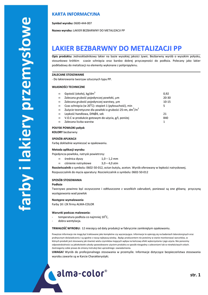 KARTA INFORMACYJNA Symbol wyrobu: 0600-444-007 Nazwa wyrobu: LAKIER BEZBARWNY DO METALIZACJI PP LAKIER BEZBARWNY DO METALIZACJI PP Opis produktu: Jednoskładnikowy lakier na bazie wysokiej jakości żywic. Bezbarwny wyrób o wysokim połysku, stosunkowo krótkim czasie schnięcia oraz bardzo dobrej przyczepności do podłoża. Polecany jako lakier podkładowy do metalizacji na elementy wykonane z polipropylenu. ZALECANE STOSOWANIE - Do lakierowania tworzyw sztucznych typu PP. WŁASNOŚCI TECHNICZNE • • • • • • • • 3 Gęstość (około), kg/dm Zalecana grubość pojedynczej powłoki, µm Zalecana grubość pojedynczej warstwy, µm o Czas schnięcia (w 20 C): stopień 1 (pyłosuchość), min 3 2 Zużycie teoretyczne dla powłoki o grubości 25µm, dm /m Lepkość handlowa, DINØ4, sek V.O.C w produkcie gotowym do użycia, g/l, poniżej Zalecana liczba warstw 0,92 20-30 10-15 5 21 840 1 POŁYSK POWŁOKI połysk KOLORY bezbarwny SPOSÓB APLIKACJI Farbę dokładnie wymieszać w opakowaniu. Metoda aplikacji wyrobu Pojedyncza powłoka, natrysk powietrzny: • średnica dyszy 1,0 – 1,2 mm • ciśnienie natryskowe 3,0 – 4,0 atm Rozcieńczalnik o symbolu: 0602-50-012, octan butylu, aceton. Wyrób oferowany w lepkości natryskowej. Rozpuszczalnik do mycia aparatury: Rozcieńczalnik o symbolu: 0602-50-012 SPOSÓB STOSOWANIA Podłoże Tworzywo powinno być oczyszczone i odtłuszczone z wszelkich zabrudzeń, ponieważ są one główną przyczyną występowania wad powłok Następne wymalowania Farby 1K i 2K firmy ALMA-COLOR Warunki podczas malowania: o temperatura podłoża co najmniej 10 C, dobra wentylacja. TRWAŁOŚĆ WYROBU: 12 miesięcy od daty produkcji w fabrycznie zamkniętym opakowaniu. Powyższe informacje nie mogą być traktowane jako kompletne czy wyczerpujące. Informacje te opierają się na badaniach laboratoryjnych oraz praktycznym doświadczeniu i są zgodne z naszą najlepszą wiedzą . Będąc producentem nie jesteśmy w stanie monitorować warunków, w których produkt jest stosowany jak również wielu czynników mających wpływ na końcowy efekt wykorzystania i jego użycia. Nie ponosimy odpowiedzialności za jakiekolwiek szkody spowodowane użyciem produktu w sposób niezgodny z zaleceniami lub w niewłaściwych celach. Zastrzegamy sobie prawo do zmiany instrukcji bez uprzedniego zawiadamiania. UWAGA! Wyrób do profesjonalnego stosowania w przemyśle. Informacje dotyczące bezpieczeństwa stosowania wyrobu zawarte są w Karcie Charakterystyki. str. 1