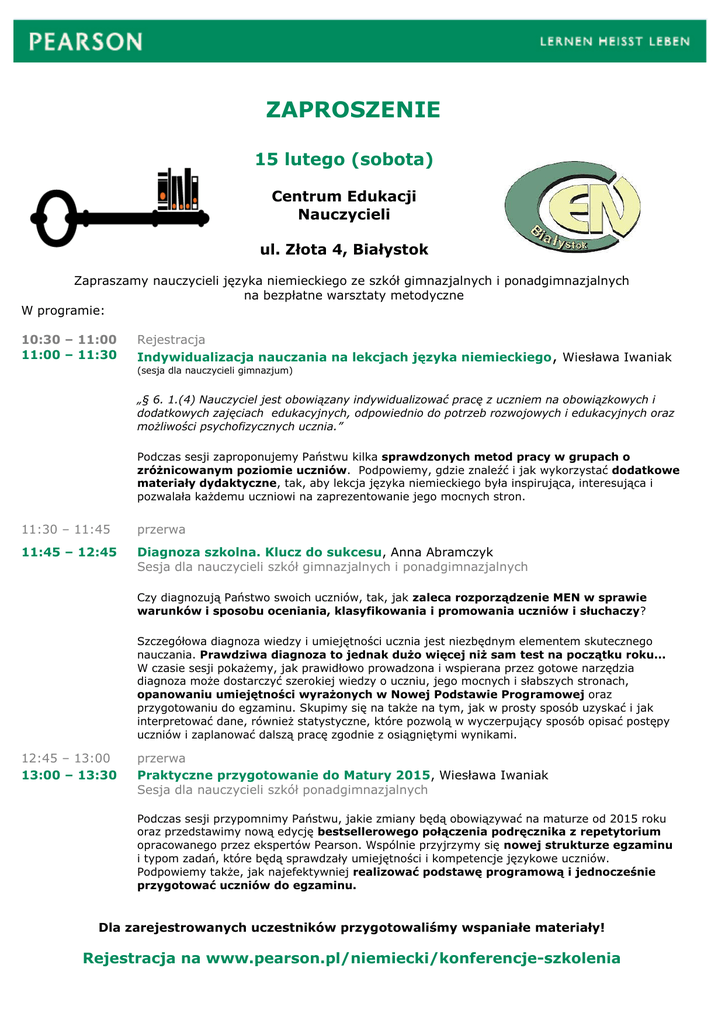 ZAPROSZENIE 15 lutego (sobota) Centrum Edukacji Nauczycieli ul. Złota 4, Białystok Zapraszamy nauczycieli języka niemieckiego ze szkół gimnazjalnych i ponadgimnazjalnych na bezpłatne warsztaty metodyczne W programie: 10:30 – 11:00 11:00 – 11:30 Rejestracja Indywidualizacja nauczania na lekcjach języka niemieckiego , Wiesława Iwaniak (sesja dla nauczycieli gimnazjum) „§ 6. 1.(4) Nauczyciel jest obowiązany indywidualizować pracę z uczniem na obowiązkowych i dodatkowych zajęciach edukacyjnych, odpowiednio do potrzeb rozwojowych i edukacyjnych oraz możliwości psychofizycznych ucznia.” Podczas sesji zaproponujemy Państwu kilka sprawdzonych metod pracy w grupach o zróżnicowanym poziomie uczniów. Podpowiemy, gdzie znaleźć i jak wykorzystać dodatkowe materiały dydaktyczne, tak, aby lekcja języka niemieckiego była inspirująca, interesująca i pozwalała każdemu uczniowi na zaprezentowanie jego mocnych stron. 11:30 – 11:45 przerwa 11:45 – 12:45 Diagnoza szkolna. Klucz do sukcesu, Anna Abramczyk Sesja dla nauczycieli szkół gimnazjalnych i ponadgimnazjalnych Czy diagnozują Państwo swoich uczniów, tak, jak zaleca rozporządzenie MEN w sprawie warunków i sposobu oceniania, klasyfikowania i promowania uczniów i słuchaczy? Szczegółowa diagnoza wiedzy i umiejętności ucznia jest niezbędnym elementem skutecznego nauczania. Prawdziwa diagnoza to jednak dużo więcej niż sam test na początku roku... W czasie sesji pokażemy, jak prawidłowo prowadzona i wspierana przez gotowe narzędzia diagnoza może dostarczyć szerokiej wiedzy o uczniu, jego mocnych i słabszych stronach, opanowaniu umiejętności wyrażonych w Nowej Podstawie Programowej oraz przygotowaniu do egzaminu. Skupimy się na także na tym, jak w prosty sposób uzyskać i jak interpretować dane, również statystyczne, które pozwolą w wyczerpujący sposób opisać postępy uczniów i zaplanować dalszą pracę zgodnie z osiągniętymi wynikami. 12:45 – 13:00 13:00 – 13:30 przerwa Praktyczne przygotowanie do Matury 2015, Wiesława Iwaniak Sesja dla nauczycieli szkół ponadgimnazjalnych Podczas sesji przypomnimy Państwu, jakie zmiany będą obowiązywać na maturze od 2015 roku oraz przedstawimy nową edycję bestsellerowego połączenia podręcznika z repetytorium opracowanego przez ekspertów Pearson. Wspólnie przyjrzymy się nowej strukturze egzaminu i typom zadań, które będą sprawdzały umiejętności i kompetencje językowe uczniów. Podpowiemy także, jak najefektywniej realizować podstawę programową i jednocześnie przygotować uczniów do egzaminu. Dla zarejestrowanych uczestników przygotowaliśmy wspaniałe materiały! a za Rejestracja na www.pearson.pl/niemiecki/konferencje-szkolenia