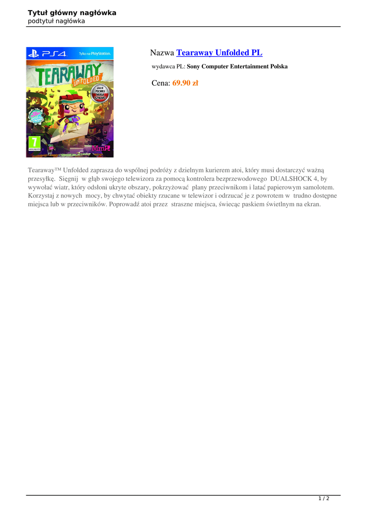 Tytuł główny nagłówka podtytuł nagłówka Nazwa Tearaway Unfolded PL wydawca PL: Sony Computer Entertainment Polska Cena: 69.90 zł Tearaway™ Unfolded zaprasza do wspólnej podróży z dzielnym kurierem atoi, który musi dostarczyć ważną przesyłkę. Sięgnij w głąb swojego telewizora za pomocą kontrolera bezprzewodowego DUALSHOCK 4, by wywołać wiatr, który odsłoni ukryte obszary, pokrzyżować plany przeciwnikom i latać papierowym samolotem. Korzystaj z nowych mocy, by chwytać obiekty rzucane w telewizor i odrzucać je z powrotem w trudno dostępne miejsca lub w przeciwników. Poprowadź atoi przez straszne miejsca, świecąc paskiem świetlnym na ekran. 1/2 Tytuł główny nagłówka podtytuł nagłówka Nazwa Wartość Wydawca PL Sony Computer Entertainment Polska Data premiery 08.09.2015 Producent Tryb gry Kategoria wiekowa Wersja językowa Wymagania sprzętowe Format Media Molecule Single Player 7+ PL Konsola PlayStation 4 Blu-Ray 2/2