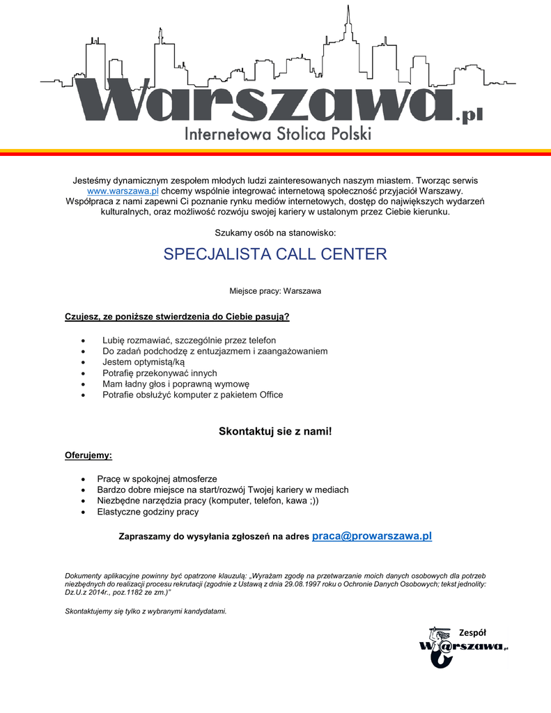 Jesteśmy dynamicznym zespołem młodych ludzi zainteresowanych naszym miastem. Tworząc serwis www.warszawa.pl chcemy wspólnie integrować internetową społeczność przyjaciół Warszawy. Współpraca z nami zapewni Ci poznanie rynku mediów internetowych, dostęp do największych wydarzeń kulturalnych, oraz możliwość rozwóju swojej kariery w ustalonym przez Ciebie kierunku. Szukamy osób na stanowisko: SPECJALISTA CALL CENTER Miejsce pracy: Warszawa Czujesz, ze poniższe stwierdzenia do Ciebie pasują? Lubię rozmawiać, szczególnie przez telefon Do zadań podchodzę z entuzjazmem i zaangażowaniem Jestem optymistą/ką Potrafię przekonywać innych Mam ładny głos i poprawną wymowę Potrafie obsłużyć komputer z pakietem Office Skontaktuj sie z nami! Oferujemy: Pracę w spokojnej atmosferze Bardzo dobre miejsce na start/rozwój Twojej kariery w mediach Niezbędne narzędzia pracy (komputer, telefon, kawa ;)) Elastyczne godziny pracy Zapraszamy do wysyłania zgłoszeń na adres [email protected] Dokumenty aplikacyjne powinny być opatrzone klauzulą: „Wyrażam zgodę na przetwarzanie moich danych osobowych dla potrzeb niezbędnych do realizacji procesu rekrutacji (zgodnie z Ustawą z dnia 29.08.1997 roku o Ochronie Danych Osobowych; tekst jednolity: Dz.U.z 2014r., poz.1182 ze zm.)” Skontaktujemy się tylko z wybranymi kandydatami. Zespół