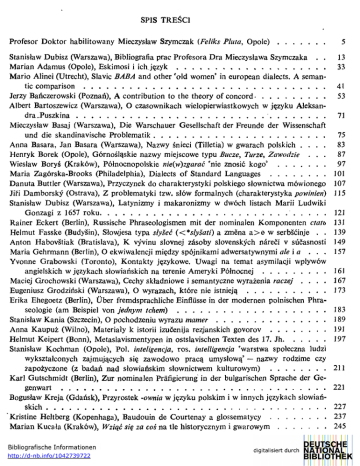 SPIS TREŚCI Profesor Doktor habilitowany Mieczysław Szymczak (Feliks Pluta, Opole) Stanisław Dubisz (Warszawa), Bibliografia prac Profesora D r a Mieczysława Szymczaka . . Marian Adamus (Opole), Eskimosi i ich język Mario Alinei (Utrecht), Slavic B A B A and other 'old women' in european dialects. A semantic comparison Jerzy Bańczerowski (Poznań), A contribution to the theory o f concord • Albert Bartoszewicz (Warszawa), O czasownikach wielopierwiastkowych w języku Aleksandra.Puszkina Mieczysław Basaj (Warszawa), Die Warschauer Gesellschaft der Freunde der Wissenschaft und die skandinavische Problematik Anna Basara, Jan Basara (Warszawa), Nazwy śnieci (Tilletia) w gwarach polskich . . . . Henryk Borek (Opole), Górnośląskie nazwy miejscowe typu Buczę, Turze, Zawodzie . . . Wiesław Boryś (Kraków), Północnopolskie nie(w)zgarać 'nie znosić kogo' Maria Zagórska-Brooks (Philadelphia), Dialects o f Standard Languages Danuta Buttler (Warszawa), Przyczynek do charakterystyki polskiego słownictwa mówionego Jifi Damborsky (Ostrava), Z problematyki tzw. słów formalnych (charakterystyka powinien) Stanisław Dubisz (Warszawa), Latynizmy i makaronizmy w dwóch listach Marii Ludwiki Gonzagi z 1657 roku Rainer Eckert (Berlin), Russische Phraseologismen mit der nominalen Komponenten ctatb Helmut Fasske (Budyśin), Słowjesa typa słyśeć (<*slyśati) a zmena a > o w serbśćinje . . Anton Habovśtiak (Bratislava), K vyvinu slovnej zdsoby slovenskych nareći v sućasnosti Maria Gehrmann (Berlin), O ekwiwalencji między spójnikami adwersatywnymi ale i a . . . Yvonne Grabowski (Toronto), Kontakty językowe. Uwagi n a temat asymilacji wpływów angielskich w językach słowiańskich n a terenie Ameryki Północnej Maciej Grochowski (Warszawa), Cechy składniowe i semantyczne wyrażenia raczej . . . . Eugeniusz Grodziński (Warszawa), O wyrazach, które nie istnieją Erika Ehegoetz (Berlin), Ober fremdsprachliche Einfliisse in der modernen polnischen Phraseologie (am Beispiel von jednym tchem) Stanisław Kania (Szczecin), O pochodzeniu wyrazu mamer Anna Kaupuż (Wilno), Materiały k istorii izufienija rezjanskich govorov Helmut Keipert (Bonn), Metaslavismentypen in ostslavischen Texten des 17. J h Stanisław Kochman (Opole), Pol. inteligencja, ros. intelligencja 'warstwa społeczna ludzi wykształconych zajmujących się zawodowo pracą umysłową' — nazwy rodzime czy zapożyczone (z badań n a d słowiańskim słownictwem kulturowym) Karl Gutschmidt (Berlin), Z u r nominalen Prafigierung in der bulgarischen Sprache der Gegenwart Bogusław Kreja (Gdańsk), Przyrostek -ownia w języku polskim i w innych językach słowiań skich Kristine Heltberg (Kopenhaga), Baudouin de Courtenay a glossematycy Marian Kucała (Kraków), Wziąć się za coś n a tle historycznym i gwarowym http://d-nb.info/1042739722 5 13 33 41 53 71 75 83 87 97 101 107 115 121 131 139 149 157 161 167 173 183 189 191 197 211 221 227 237 245 442 SPIS TREŚCI Władysław Kuraszkiewicz (Poznań), Wyrazy obce w polskim materiale Leksykonu Jana Mączyńskiego Władysław Lubaś (Katowice), Kodyfikacja językowa w polskiej praktyce Siri Sverdrup Lunden (Oslo), Some puzzles in the AZBUKA-PROPIS' o f „Pol'ak Vaska", son o f P R O K O F I J (1663) Witold Mańczak (Kraków), Zanik jerów w staro-cerkiewno-słowiańskim Leszek Moszyński (Gdańsk), Piśmiennictwo cyrylometodyjskie j a k o płaszczyzna wzajem nych kontaktów chrześcijańskiego Wschodu z Zachodem Waleryj M. Mokijenko (Leningrad), Jz Slovoupotreblenija V. I. Lenina Klaus Muller (Berlin), Z u Besonderheiten postintegrativer Prozesse slawischer Worter im Deutschen Franciszek Peplowski (Toruń), Wyrazy gwarowe w „Słowniku" J. S. Bandtkiego Jan Petr (Praha), Msc. Abrahama Frencla Explicatio nominum z 1697 roku Feliks Pluta (Opole), Nazwy zwierząt domowych z XVIII wieku Jerzy Podracki (Warszawa), Kłopotliwe kwestie polskiej interpunkcji Eugenia Rechtsiegel (Berlin), Nazwy stopni pokrewieństwa i powinowactwa rodzinnego we frazeologii polskiego języka współczesnego Jerzy Rusek (Kraków), Z historii nazw 'krewnego' w języku bułgarskim (Przyczynek d o dziejów terminologii rodzinnej) . . . ; Gunter Schaarschmidt (Victoria), Word Order and the Article in Sorbian: A Textual Analysis Teresa Skubalanka (Lublin), Fleksja a język pisarza Stanisław Skorupka (Warszawa), Projekt opracowania słownika współczesnego języka pol skiego Edward Stankiewicz (Yale), The role o f grammatical levelling in the formation o f the slavic numerals Witold Śmiech (Łódź), O podziale n a sylaby wyrazów typu dojdę, ujrzę itp Ryszard Tokarski (Lublin), Semantyczne konotacje nazw zjawisk atmosferycznych . . . . Zuzanna Topolińska (Skopje), Kryteria wyróżniania funkcji syntaktycznych Stanisław Urbańczyk (Kraków), Michał Wiszniewski — zapomniany historyk języka polskiego Bogdan Walczak (Poznań), Kwalifikatory w słownikach języka polskiego Antonius Weijnen (Niemegue), Die niederlandischen Formen fiir Vliess Alfred Zaręba (Kraków), Z wahań we współczesnym języku polskim: skopijski — skopiański — skopski. Maria Zarębina (Kraków), Terminologia rodzinna w „ P a n u Tadeuszu" 251 259 267 273 281 291 301 305 315 325 329 335 343 353 363 373 379 387 389 397 405 413 423 425 431