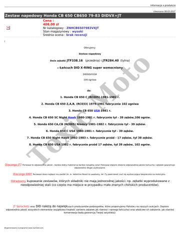 Informacje o produkcie Utworzono 08-03-2017 Zestaw napedowy Honda CB 650 CB650 79-83 DIDVX+JT Cena : 408,00 zł Nr katalogowy : ZNHCB6507983VXJT Stan magazynowy : wysoki Średnia ocena : brak recenzji ! Oferujemy: Zestaw napędowy + JTF338.16 (przednia) i JTR284.40 (tylna) ot o Dwie zębatki Łańcuch DID X-RING super wzmocniony DID50VX104 104 ogniwa M do: 1. Honda CB 650 C (RC005) 1981-1982 r. 2. Honda CB 650 Z,A,B, (RC033) 1979-1981 fabrycznie 102 ogniwa 3. Honda CB 650 USA 1981 r. c 4. Honda CB 650 SC Night Hawk 1980-1981 r. fabrycznie tył - 39 zębów,106 ogniw. xi 5. Honda 650 CA,CB (RC005) Niemcy 1981-1982 r. fabrycznie tył - 39 zębów. 6. Honda 650 C USA 1980-1981 r. fabrycznie tył - 39 zębów. 7. Honda CB 650 Night Hawk 1982-1983 r. fabrycznie przód - 17 zębów, tył 38 zębów. To 8. Honda CB 650 USA 1982 r. fabrycznie przód 17 zębów, tył 39 zębów, 102 ogniw. Dlaczego JT? Ponieważ to odpowiednia jakość - bardzo dobry materiał za bardzo rozsądną cenę! Ponieważ dopiero złożenie odpowiedniej jakości łańcucha i zębatek gwarantuje odpowiednio długie użytkowanie. Dlaczego DID? Ponieważ skoro najlepsi mu zaufali (m. in. Valentino Rossi) to uważamy, że i Ty powinieneś czuć się wystarczająco bezpiecznie na motocyklu. Odradzamy kupowanie zestawów, których składniki nie mają jednorodnej jakości: np. zębatki wyprodukowane z nieodpowiedniej stali (co często ma miejsce w przypadku mało znanych chińskich producentów). JT Sprockets oraz DID należą do największych producentów podzespołów, które proponujemy Państwu na naszych aukcjach. Dopiero odpowiednia jakość wszystkich elementów (wyjątkowa trwałość zarówno zębatek jak również i samego łańcucha) oraz właściwe ich założenie, jak również konserwacja będą gwarancją Twojej satysfakcji. Wygenerowano w programie www.oscGold.com Uwaga! Warunkiem gwarancji ze strony producenta DID jest założenie łańcucha w serwisie motocykli!!! Błyskawiczna wysyłka!! Proponujemy w ramach serwisu m.inn. pomiar mocy motocykli na profesjonalnej hamowni Dyna Pro oraz dokładną ich diagnostykę wraz z możliwością ich regulacji pod kątem optymalizacji ich parametrów - tuning Rapid Bike, Power Commander. To xi c M ot o Przykładowe zdjęcie: