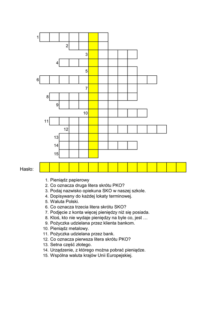 1 2 3 4 5 6 7 8 9 10 11 12 13 14 15 Hasło: 1. 2. 3. 4. 5. 6. 7. 8. 9. 10. 11. 12. 13. 14. 15. Pieniądz papierowy Co oznacza druga litera skrótu PKO? Podaj nazwisko opiekuna SKO w naszej szkole. Dopisywany do każdej lokaty terminowej. Waluta Polski. Co oznacza trzecia litera skrótu SKO? Podjęcie z konta więcej pieniędzy niż się posiada. Ktoś, kto nie wydaje pieniędzy na byle co, jest … Pożyczka udzielana przez klienta bankom. Pieniądz metalowy. Pożyczka udzielana przez bank. Co oznacza pierwsza litera skrótu PKO? Setna część złotego. Urządzenie, z którego można pobrać pieniądze. Wspólna waluta krajów Unii Europejskiej.