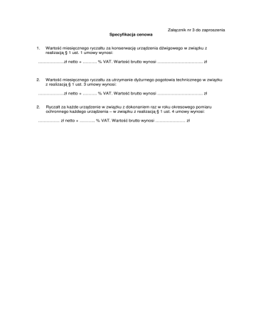 Załącznik nr 3 do zaproszenia Specyfikacja cenowa 1. Wartość miesięcznego ryczałtu za konserwację urządzenia dźwigowego w związku z realizacją § 1 ust. 1 umowy wynosi: ………………zł netto + ………. % VAT. Wartość brutto wynosi ………………………….. zł 2. Wartość miesięcznego ryczałtu za utrzymanie dyżurnego pogotowia technicznego w związku z realizacją § 1 ust. 3 umowy wynosi: ………………zł netto + ………. % VAT. Wartość brutto wynosi ………………………….. zł 2. Ryczałt za każde urządzenie w związku z dokonaniem raz w roku okresowego pomiaru ochronnego każdego urządzenia – w związku z realizacją § 1 ust. 4 umowy wynosi: …………… zł netto + ……….. % VAT. Wartość brutto wynosi ………………… zł