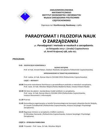 ZAKŁADMODELOWANIA MATEMATYCZNEGO INSTYTUT EKONOMETRII I INFORMATYKI Wydział ZARZĄDZANIA POLITECHNIKI CZĘSTOCHOWSKIEJ Zaprasza na I Konferencję Naukową z cyklu PARADYGMAT I FILOZOFIA NAUK O ZARZĄDZANIU pt. Paradygmat i metoda w naukach o zarządzaniu. 20 listopada 2013 r. (środa) Częstochowa ul. Armii Krajowej 19B, sala 107. PROGRAM: 9.45 - ROZPOCZĘCIE KONFERENCJI SŁOWO WSTĘPNE Prof. dr hab. Arnold Pabian, Dziekan Wydziału Zarządzania Politechniki Częstochowskiej. WPROWADZENIE W TEMATYKĘ KONFERENCJI Prof. nadzw. dr hab. Roman Marcin OLEJNIK OFIVI (Politechnika Częstochowska). CZĘŚĆ I - REFERATY 10.00 Znaczenie twierdzenia Steinhausa o sprawiedliwym podziale w metodach zarządzania, Prof. nazw. Dr hab. Wiesław Wójcik (Polska Akademia Nauk, Instytut Historii Nauki) 10.40 Od ilości do jakości- standardowy model wielkości w zarządzaniu, Prof. nazw. dr hab. Roman Marcin OLEJNIK OFM (Politechnika Częstochowska, Instytut Ekonometrii i Informatyki) 11.20 Przerwa 11.45 Komunikacja organizacyjna w świetle fenomenologicznej koncepcji człowieka Karola Wojtyły, Dr Leszek Cichobłaziński (Politechnika Częstochowska, Instytut Socjologii i Psychologii Zarządzania). 12.25 Regulacja mimesis w zarządzaniu źródłem zaufania. Dr Mirosław Harciarek, (Politechnika Częstochowska, Instytut Socjologii i Psychologii Zarządzania). CZĘŚĆ II - DYSKUSJA PANELOWA 13.05 Prowadzi - Prof. nazw. Dr hab. Wiesław Wójcik