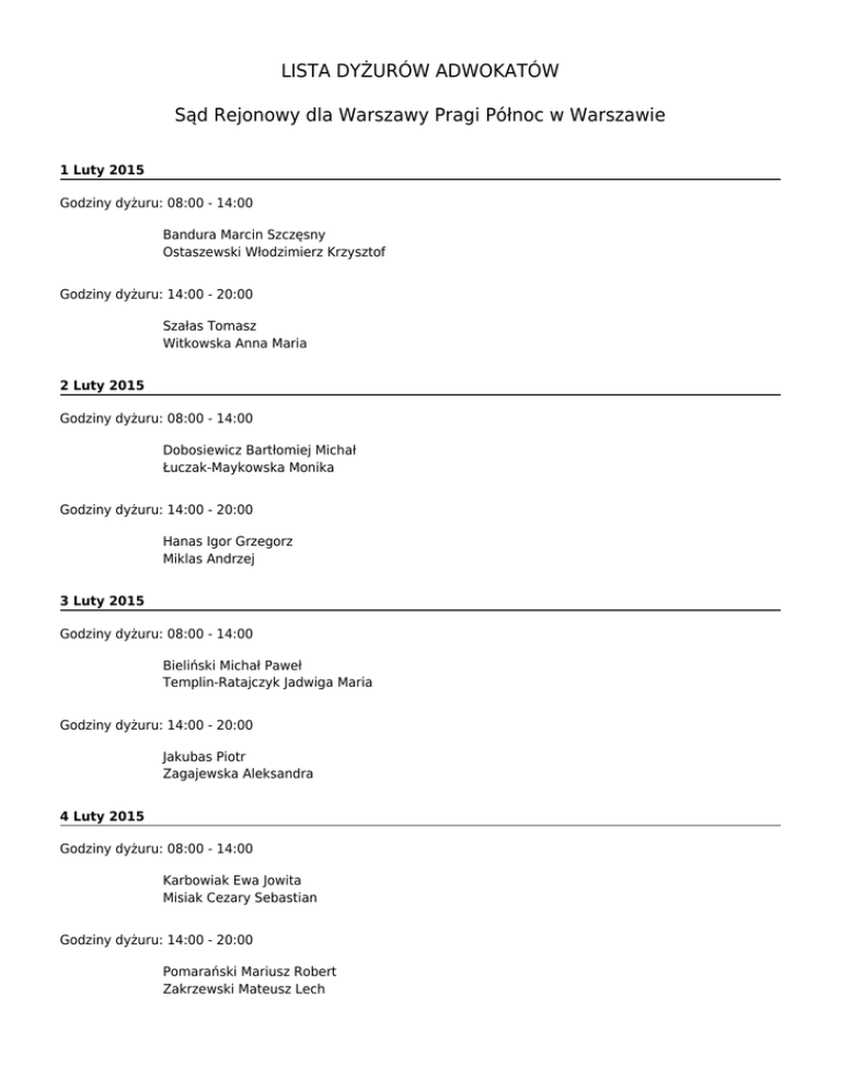 LISTA DYŻURÓW ADWOKATÓW Sąd Rejonowy dla Warszawy Pragi Północ w Warszawie 1 Luty 2015 Godziny dyżuru: 08:00 - 14:00 Bandura Marcin Szczęsny Ostaszewski Włodzimierz Krzysztof Godziny dyżuru: 14:00 - 20:00 Szałas Tomasz Witkowska Anna Maria 2 Luty 2015 Godziny dyżuru: 08:00 - 14:00 Dobosiewicz Bartłomiej Michał Łuczak-Maykowska Monika Godziny dyżuru: 14:00 - 20:00 Hanas Igor Grzegorz Miklas Andrzej 3 Luty 2015 Godziny dyżuru: 08:00 - 14:00 Bieliński Michał Paweł Templin-Ratajczyk Jadwiga Maria Godziny dyżuru: 14:00 - 20:00 Jakubas Piotr Zagajewska Aleksandra 4 Luty 2015 Godziny dyżuru: 08:00 - 14:00 Karbowiak Ewa Jowita Misiak Cezary Sebastian Godziny dyżuru: 14:00 - 20:00 Pomarański Mariusz Robert Zakrzewski Mateusz Lech 5 Luty 2015 Godziny dyżuru: 08:00 - 14:00 Piesiewicz Piotr Filip Wadowska Lilianna Aleksandra Godziny dyżuru: 14:00 - 20:00 Holajda Monika Katarzyna Lewandowski Jarosław Paweł 6 Luty 2015 Godziny dyżuru: 08:00 - 14:00 Knobloch Ewa Szczygieł Marek Godziny dyżuru: 14:00 - 20:00 Kocemba Karolina Lubaczewski Tomasz 7 Luty 2015 Godziny dyżuru: 08:00 - 14:00 Haligowska-Gaj Katarzyna Beata Stosio Andrzej Bernard Godziny dyżuru: 14:00 - 20:00 Helak Paweł Tomasz Zielińska Małgorzata Halina 8 Luty 2015 Godziny dyżuru: 08:00 - 14:00 Wołosewicz-Bode Anna Barbara Woźniak Joanna Godziny dyżuru: 14:00 - 20:00 Madejowska Anna Emilia Miaśkiewicz Marzena 9 Luty 2015 Godziny dyżuru: 08:00 - 14:00 Kossakowska-Karnkowska Izabela Agata Narożnik Ewa Paulina Godziny dyżuru: 14:00 - 20:00 Kutzmann Jakub Witold Zieliński Rafał 10 Luty 2015 Godziny dyżuru: 08:00 - 14:00 Stawicki Mirosław Trypens-Lewandowska Dorota Lucyna Godziny dyżuru: 14:00 - 20:00 Piechocki Piotr Sankowska-Borman Maria Zofia 11 Luty 2015 Godziny dyżuru: 08:00 - 14:00 Kuchno Marta Małgorzata Szelenbaum Piotr Wiesław Godziny dyżuru: 14:00 - 20:00 Górecki Sebastian Marek Koterba Łukasz Tomasz 12 Luty 2015 Godziny dyżuru: 08:00 - 14:00 Chojnowski Łukasz Łopuszański Marek Andrzej Godziny dyżuru: 14:00 - 20:00 Pyszków Karolina Maria Ryczko Paweł Piotr 13 Luty 2015 Godziny dyżuru: 08:00 - 14:00 Błaszczyk Wiesław Piotr Tokarczyk Dariusz Godziny dyżuru: 14:00 - 20:00 Duszyńska Ewa Monika Wach Michał Patryk 14 Luty 2015 Godziny dyżuru: 08:00 - 14:00 Huryn Ivona Malczak Bartłomiej Jan Godziny dyżuru: 14:00 - 20:00 Arabska Adrianna Górski Jakub Krzysztof 15 Luty 2015 Godziny dyżuru: 08:00 - 14:00 Bondaryk Joanna Uścińska Katarzyna Beata Godziny dyżuru: 14:00 - 20:00 Federowicz-Gałczyńska Agnieszka Marta Matecki Wojciech 16 Luty 2015 Godziny dyżuru: 08:00 - 14:00 Demecki Adam Łada Krzysztof Godziny dyżuru: 14:00 - 20:00 Dąbek Rafał Marcin Pałka Małgorzata 17 Luty 2015 Godziny dyżuru: 08:00 - 14:00 Pieckowski Sylwester Sulej Krzysztof Godziny dyżuru: 14:00 - 20:00 Sowa Karolina Świerczewska Joanna 18 Luty 2015 Godziny dyżuru: 08:00 - 14:00 Szczepańska Monika Katarzyna Węglarz Magdalena Łucja Godziny dyżuru: 14:00 - 20:00 Stachowiak Aleksandra Maria Woźnica-Jaraczewska Małgorzata Maria 19 Luty 2015 Godziny dyżuru: 08:00 - 14:00 Bielicki Julian Tomczak Michał Jakub Godziny dyżuru: 14:00 - 20:00 Bartkiewicz Michał Wojciech Plichtowicz Zbigniew Krzysztof 20 Luty 2015 Godziny dyżuru: 08:00 - 14:00 Sękowski Piotr Paweł Ziemska-Wołoszyn Monika Agnieszka Godziny dyżuru: 14:00 - 20:00 Cieplak Ewa Noga Tomasz 21 Luty 2015 Godziny dyżuru: 08:00 - 14:00 Irmiński Mateusz Oskar Marciniak Bogumił Dominik Godziny dyżuru: 14:00 - 20:00 Grzegorek Maria Kulczycki Tymon Piotr 22 Luty 2015 Godziny dyżuru: 08:00 - 14:00 Góralska Karolina Klaudia Matak Kazimierz Tadeusz Godziny dyżuru: 14:00 - 20:00 Dybka Rafał Tałanda Tomasz Jerzy 23 Luty 2015 Godziny dyżuru: 08:00 - 14:00 Chrapek Emilia Hryniewicz Wojciech Godziny dyżuru: 14:00 - 20:00 Słotwińska Ewa Żurawska Magdalena Katarzyna 24 Luty 2015 Godziny dyżuru: 08:00 - 14:00 Glibowski Krzysztof Marcin Pochopień-Mikołajczyk Monika Godziny dyżuru: 14:00 - 20:00 Podskarbi Marta Ewelina Świerczek Adam Tomasz 25 Luty 2015 Godziny dyżuru: 08:00 - 14:00 Czyżowski Andrzej Franciszek Krzynowek-Carlson Julianna Róża Godziny dyżuru: 14:00 - 20:00 Gorzkiewicz Aleksandra Joanna Parulski Ryszard Władysław 26 Luty 2015 Godziny dyżuru: 08:00 - 14:00 Dorywalski Krzysztof Antoni Duchlińska Marta Joanna Godziny dyżuru: 14:00 - 20:00 Gibasiewicz Henryk Mikołajczyk Piotr Łukasz 27 Luty 2015 Godziny dyżuru: 08:00 - 14:00 Mazurek Grzegorz Szular Magdalena Barbara Godziny dyżuru: 14:00 - 20:00 Rogoyska-Wieczorek Marta Alicja Tarasewicz Artur 28 Luty 2015 Godziny dyżuru: 08:00 - 14:00 Iwaniak-Jeziorowska Monika Izabela Nawrot Łukasz Mirosław Godziny dyżuru: 14:00 - 20:00 Dylak Grzegorz Paweł Nawrocki Paweł Aleksander 1 Marzec 2015 Godziny dyżuru: 08:00 - 14:00 Kiszkurno Maria Kowalska Katarzyna Anna Godziny dyżuru: 14:00 - 20:00 Jaczewska Monika Maria Karczewska-Smoleń Monika 2 Marzec 2015 Godziny dyżuru: 08:00 - 14:00 Gość Paweł Tomaszczyk Tomasz Godziny dyżuru: 14:00 - 20:00 Ostaszewski Grzegorz Paweł Piechota Bartosz Dariusz 3 Marzec 2015 Godziny dyżuru: 08:00 - 14:00 Cybulski Stanisław Józef Sucholewski Damian Godziny dyżuru: 14:00 - 20:00 Karapuda Jarosław Marek Rudyk Tomasz Jerzy 4 Marzec 2015 Godziny dyżuru: 08:00 - 14:00 Borakowska Dominika Alicja Fertak Grzegorz Jerzy Godziny dyżuru: 14:00 - 20:00 Gruszczyński Bartłomiej Kiwerski Piotr Gustaw 5 Marzec 2015 Godziny dyżuru: 08:00 - 14:00 Budzikowski Mikołaj Sebastian Prączko Anna Bożena Godziny dyżuru: 14:00 - 20:00 Lubieńska Ludomiła Rogoyski Andrzej Tomasz 6 Marzec 2015 Godziny dyżuru: 08:00 - 14:00 Czapla Łukasz Stefan Rotko Ireneusz Alfred Godziny dyżuru: 14:00 - 20:00 Kozłowska Aleksandra Witczyk-Jackowska Hanna Barbara 7 Marzec 2015 Godziny dyżuru: 08:00 - 14:00 Kijowska-Dober Magdalena Kazimiera Spiechowicz Paweł Adam Godziny dyżuru: 14:00 - 20:00 Dackiewicz Marcin Piotr Dąbrowski Jakub Piotr 8 Marzec 20